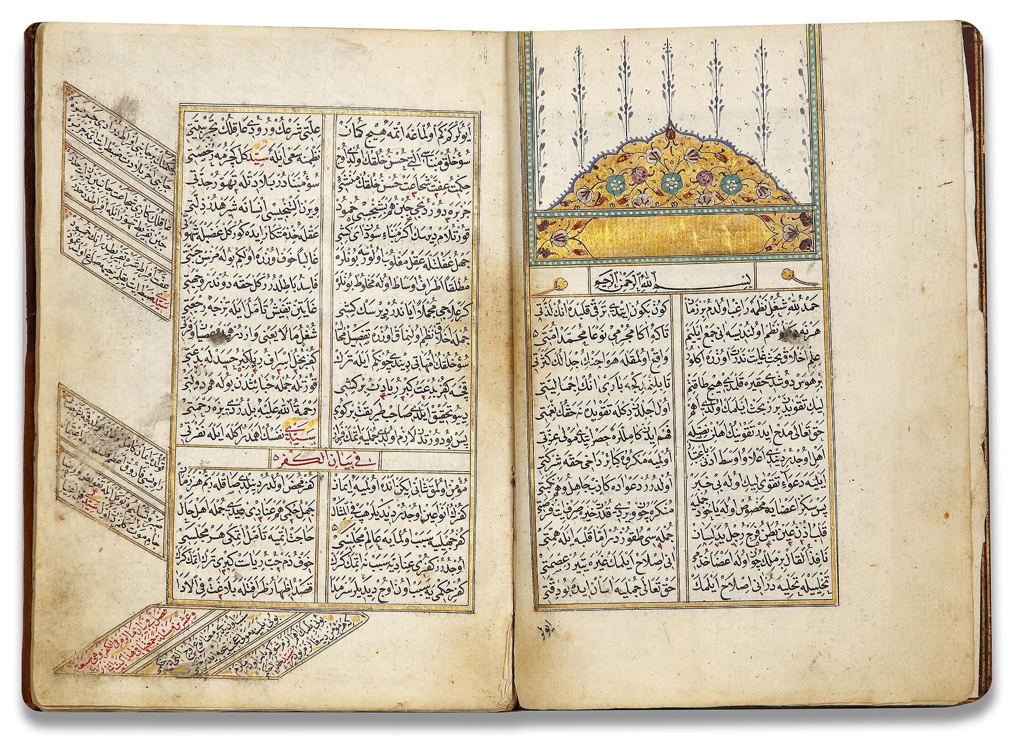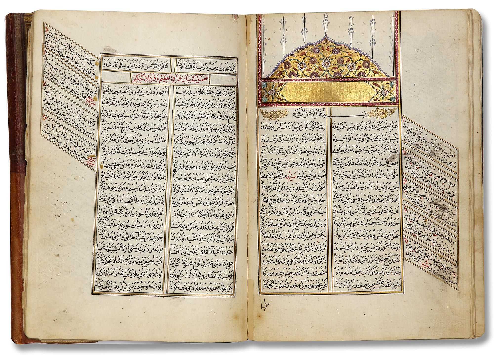 the opening page with illuminated frontispiece in colors and gold, text in neat Naskh script in black ink, with headings in red ink.