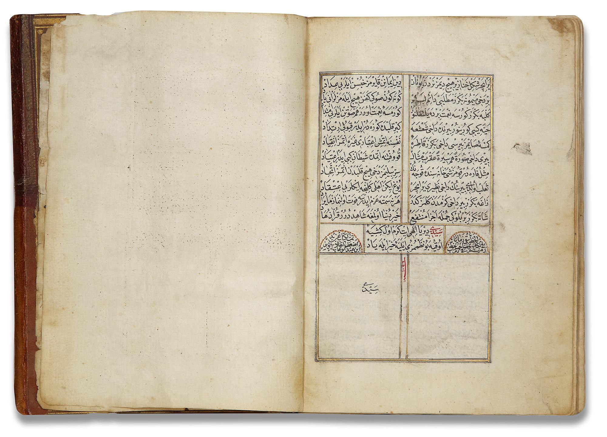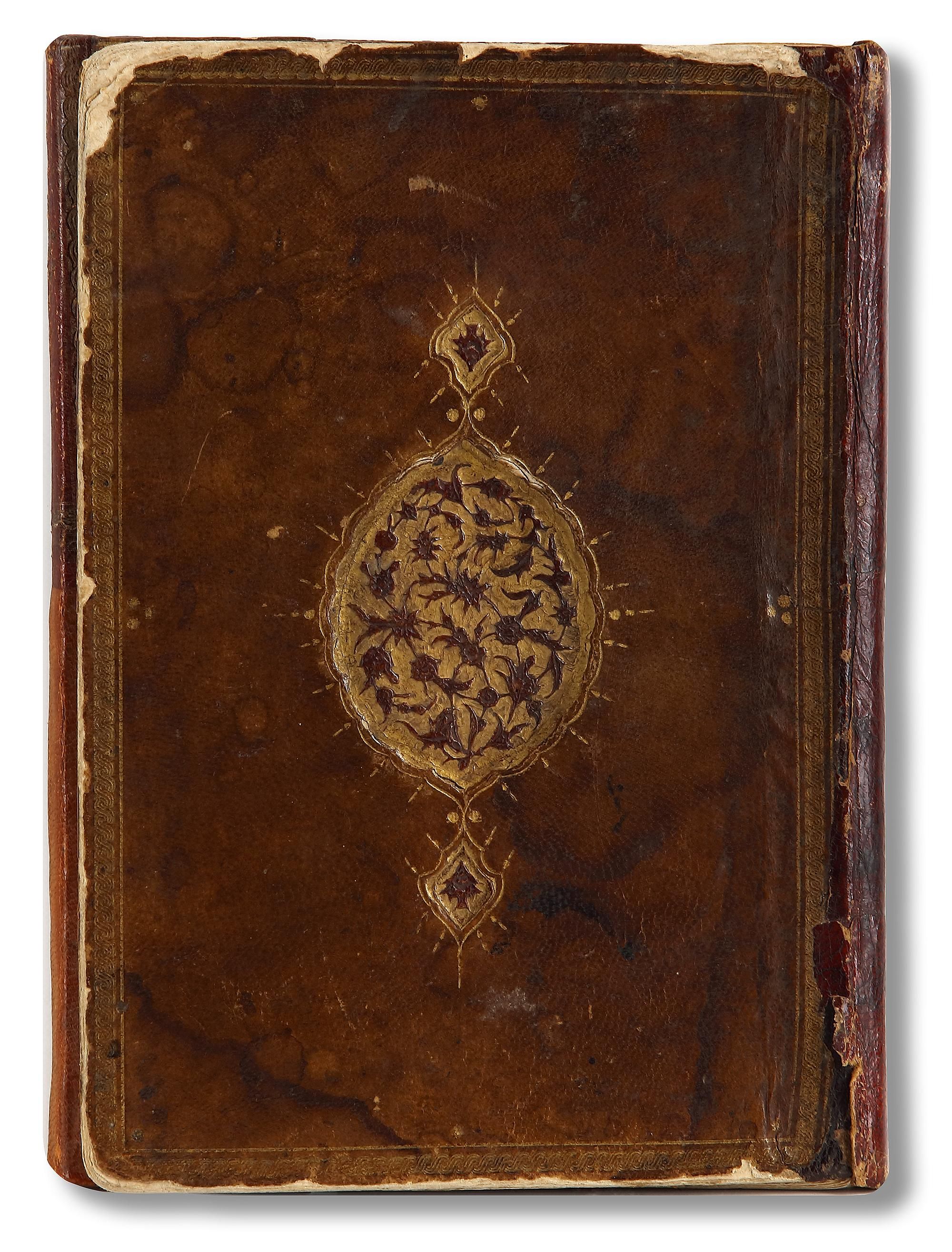 Brown Ottoman binding with gilt-stamped medallion and edges ruled with gilt chain, with flap.