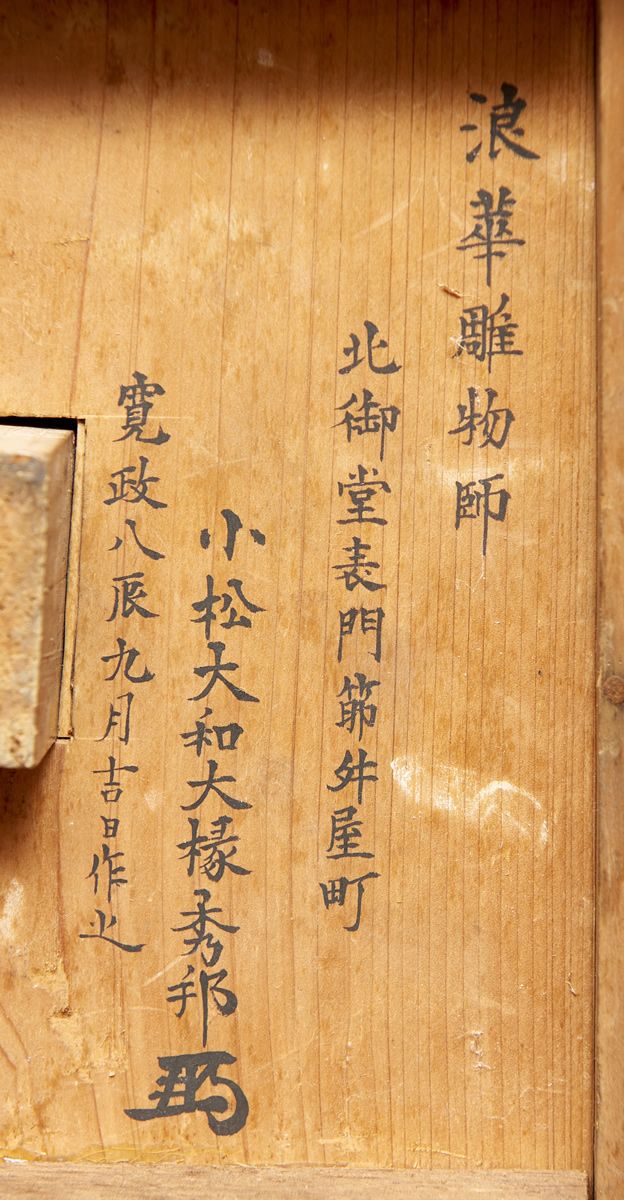 The figures have inlayed eyes. One figure has a bottom inscription stating that the figures were carved by the Naniwa (Osaka) master Komatsu Yamato Daijō Shōhō (with kakihan-sign) and address and is dated: ninth moon month of the year Kansei 8 (1796). H. : 61 cm; 61,5 cm and 63 cm. Pedestal: 27 x 21 cm.