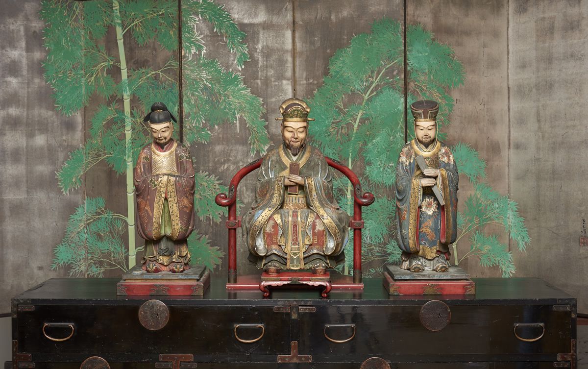 An important and rare set of three polychrome painted wooden figures. The central person in Chinese imperial shi’erzhang-dress sitting in a red lacquered chair holding a gui-tablet in his hands, flanked by two standing persons standing on a plinth and also in Chinese dress: one holding his folded hands in his sleeves and the other carrying a shaku (a writing board used by officials as a sign of dignity).