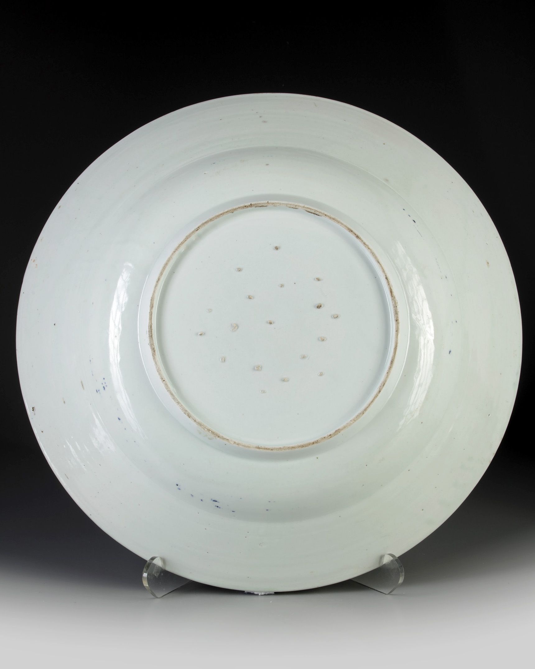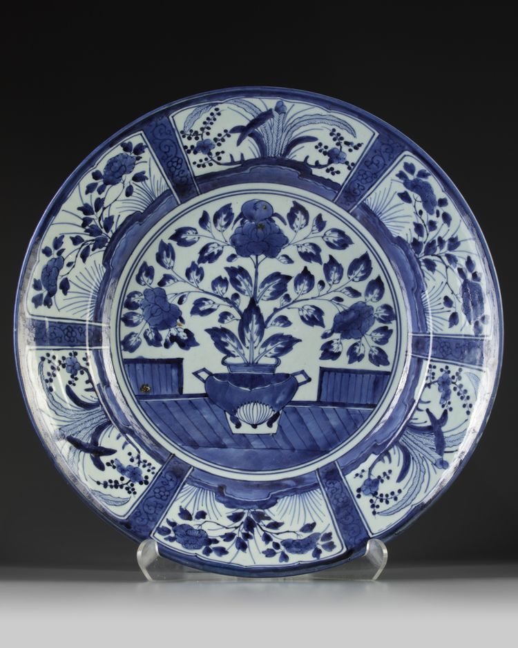 The dish is decorated to the centre with a large pot filled with flowers ,the sides with alternating panels enclosing flowers sprigs and banana leaves.
