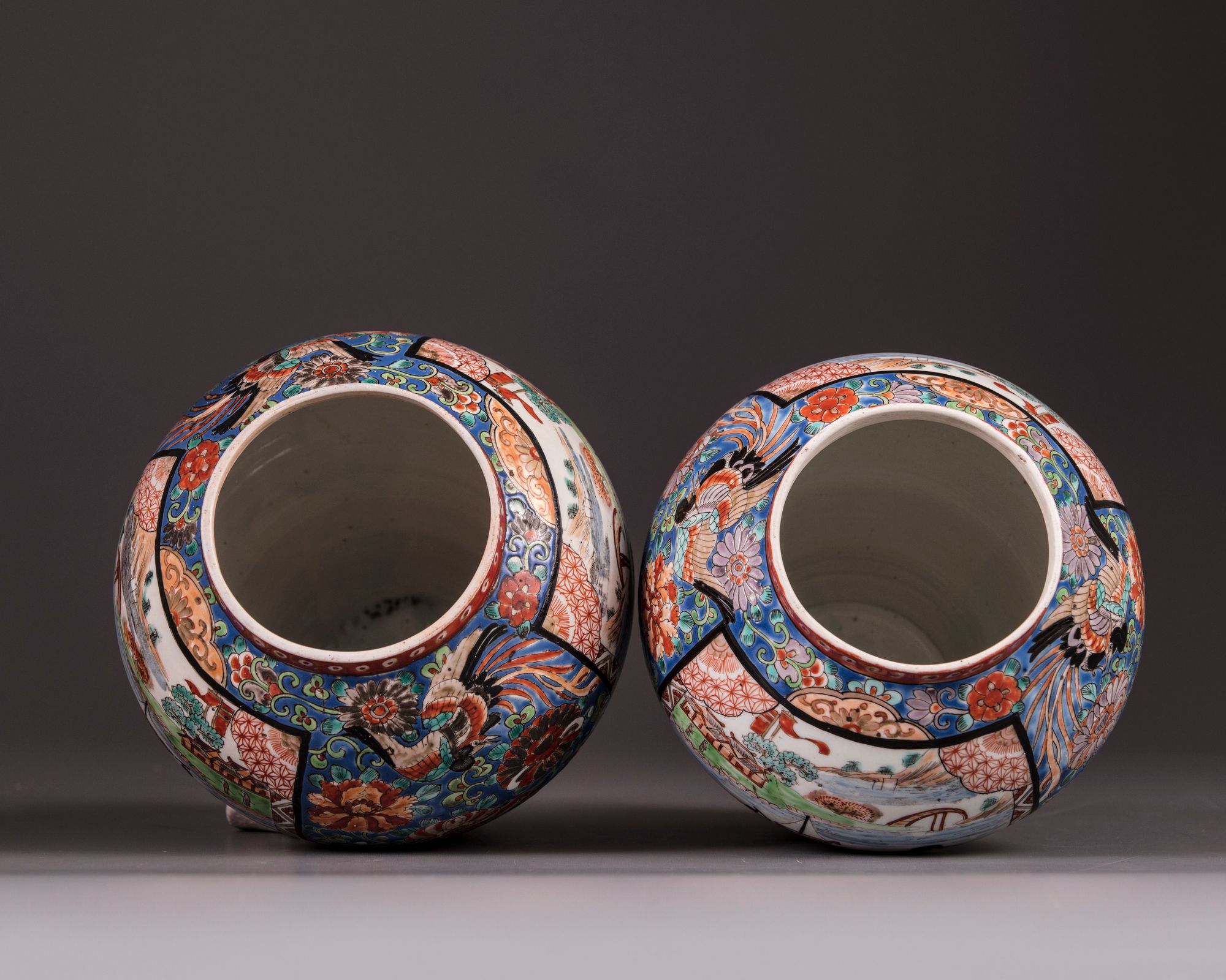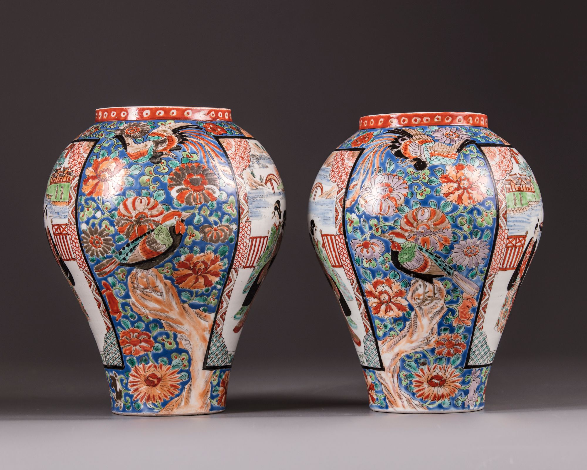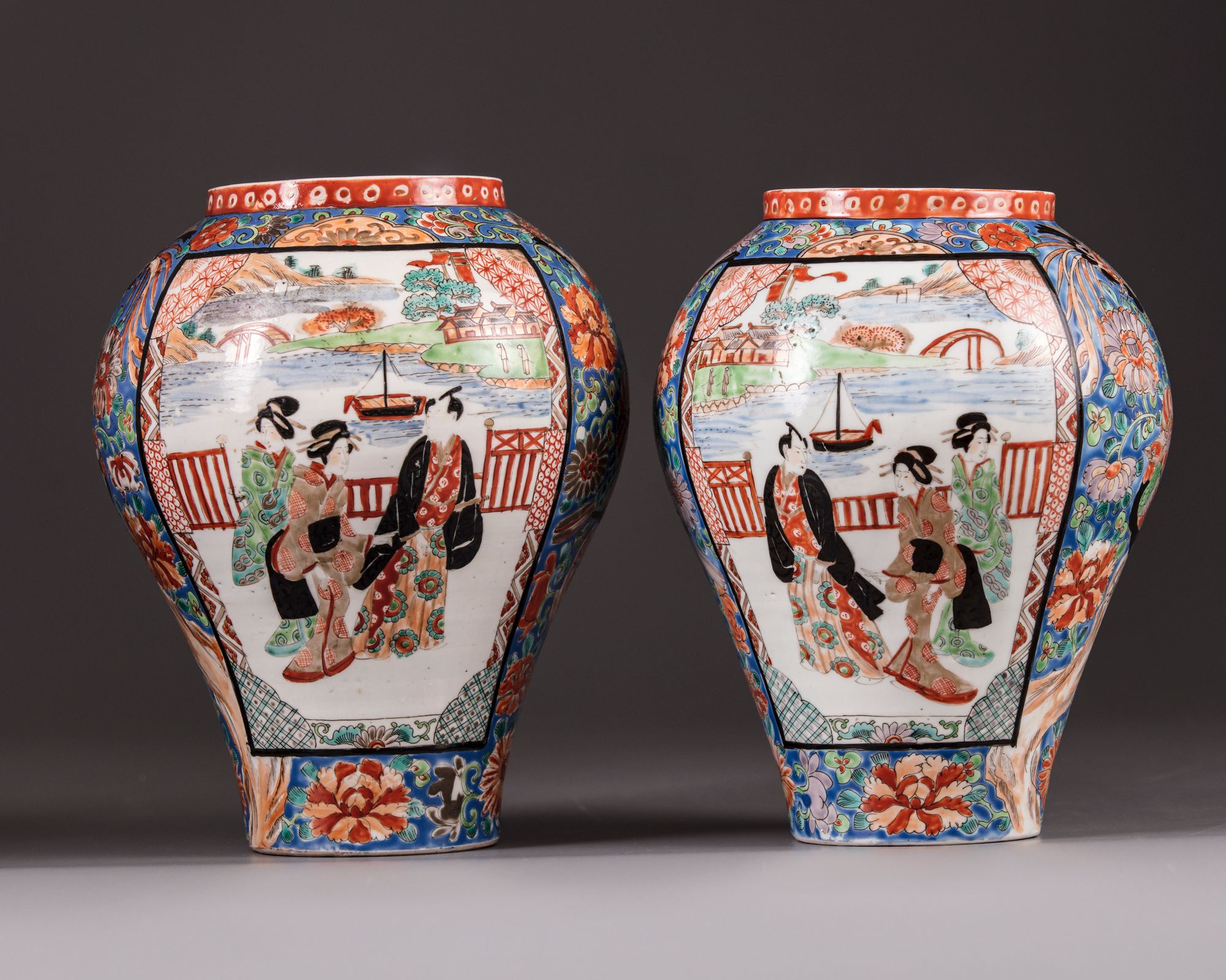 Decorated and gilt with two panels enclosing three figures standing in a garden with a waterscape in behind, separated by phoenix, chrysanthemum and various kinds of flowers.
