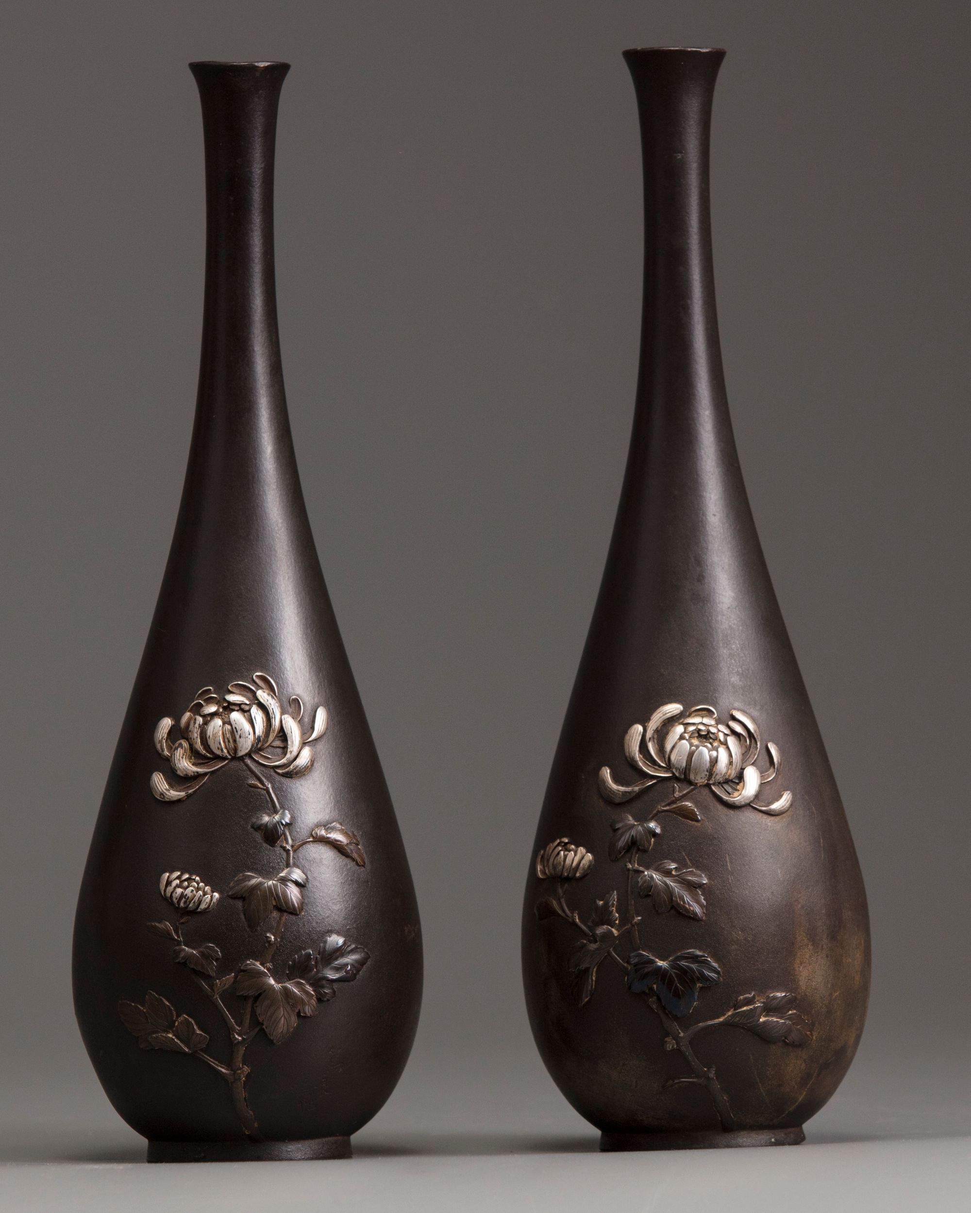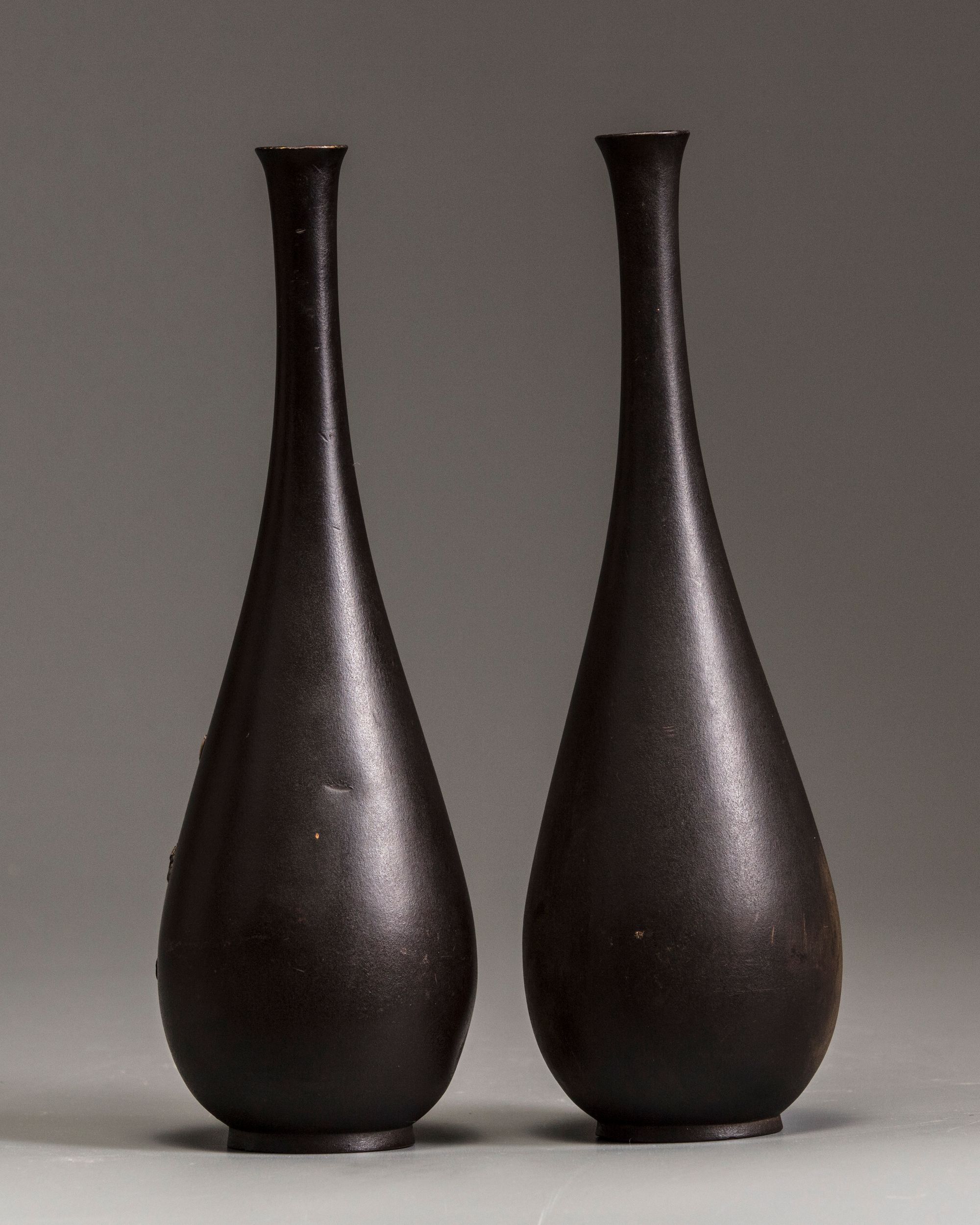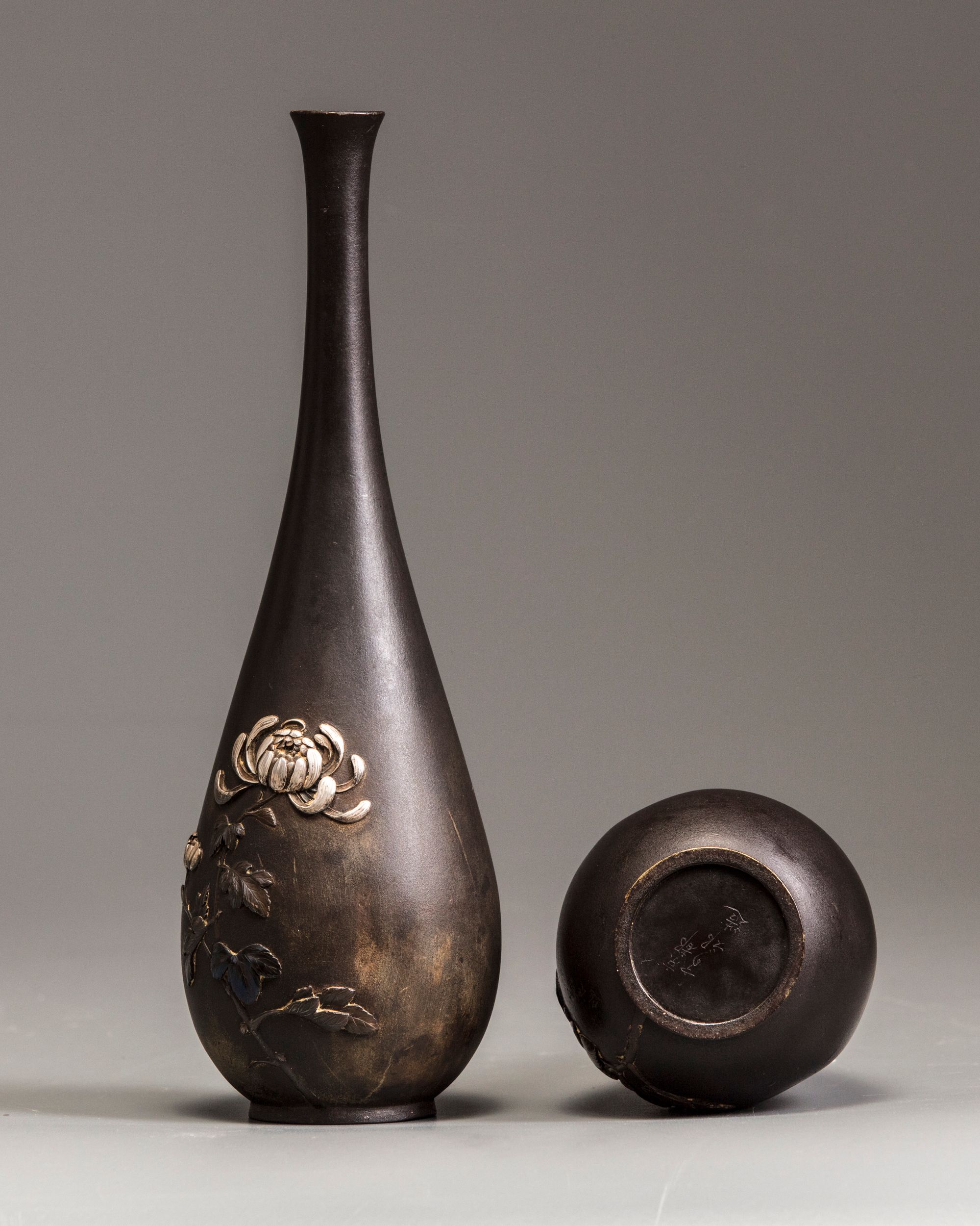 On a short foot and with long tapered neck, the vases are decorated with a silver inlay of a flower growing from the base