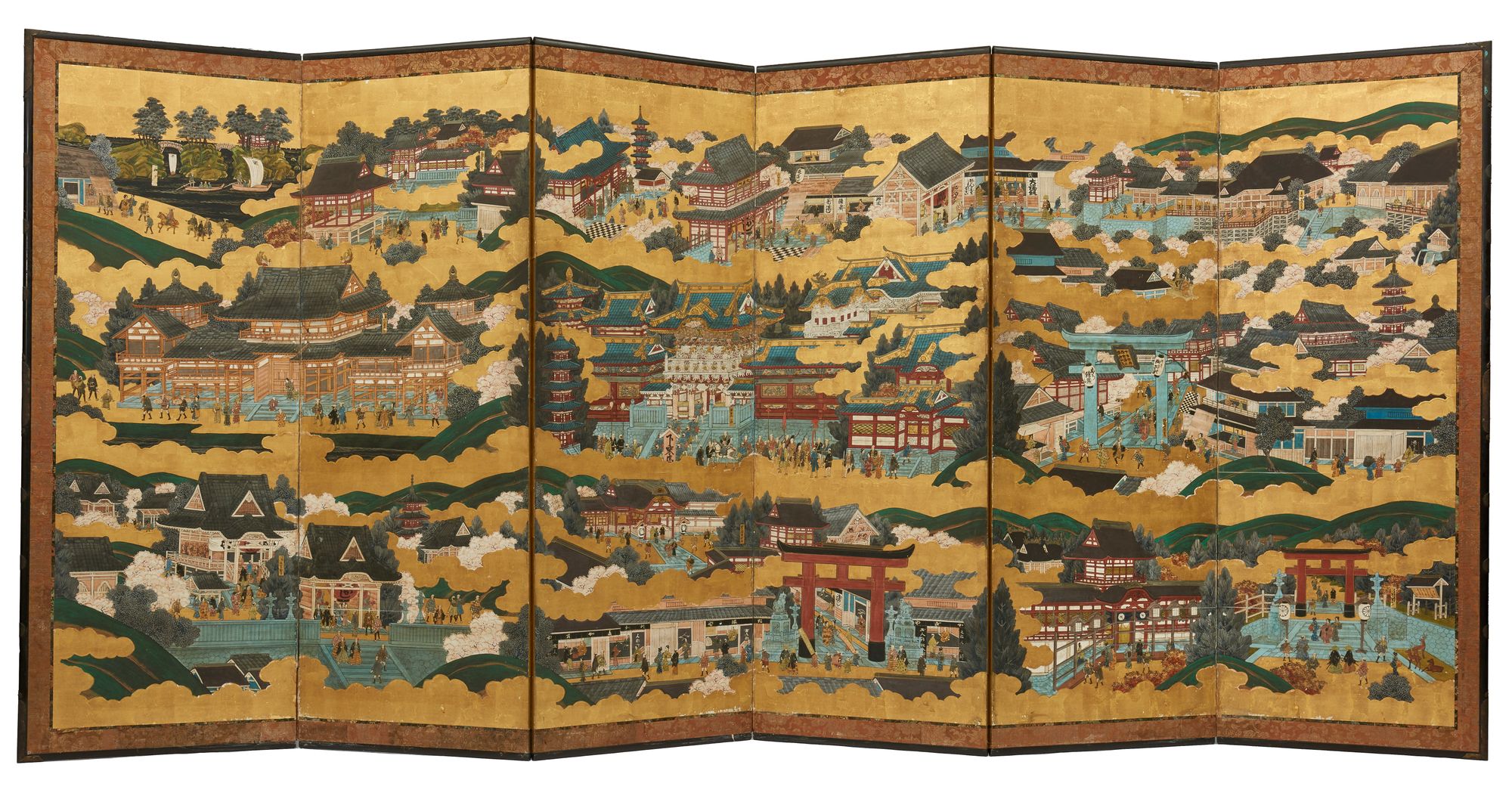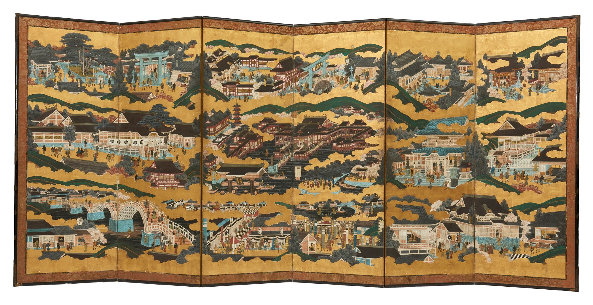 A Japanese Byobu-screen depicting famous views in Kyoto