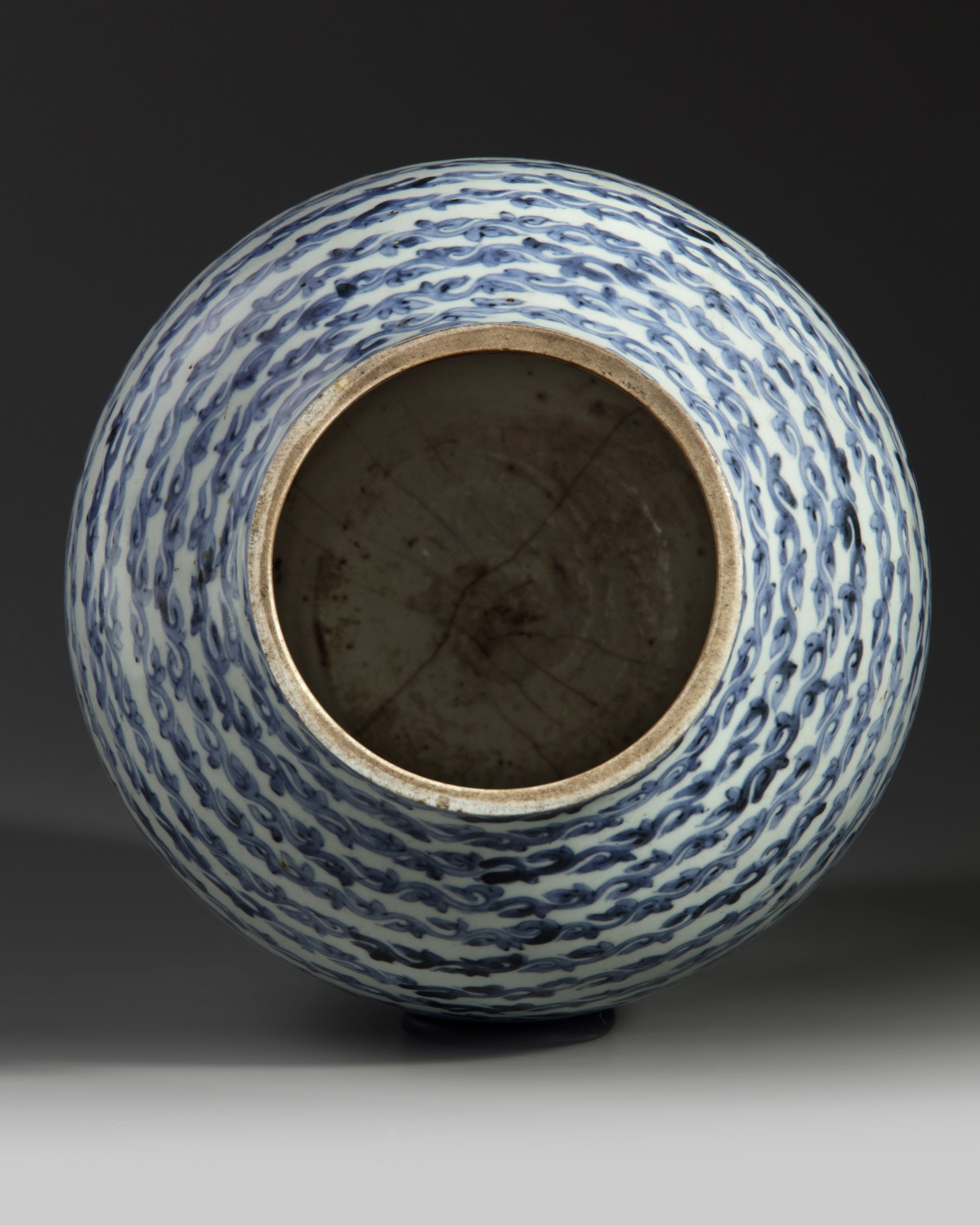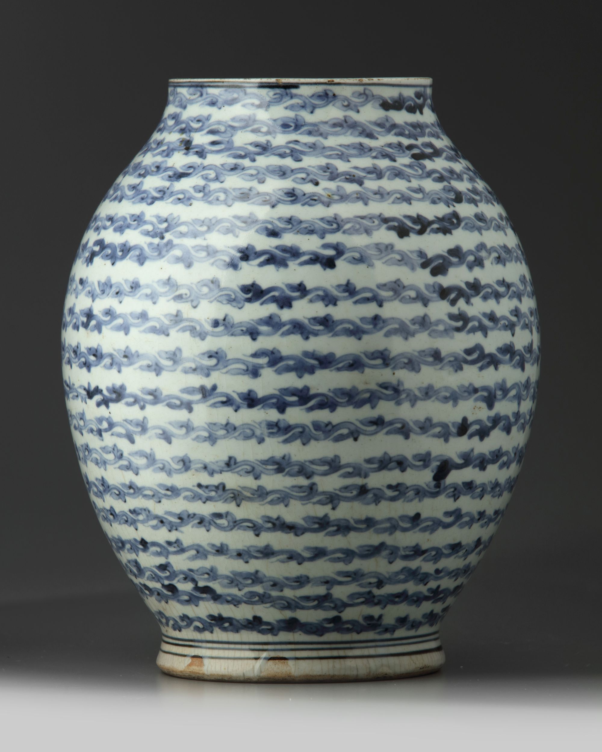 Oviform jar on footring, the base recessed and glazed. Decorated in underglaze blue with nineteen horizontal foliate scrolls.