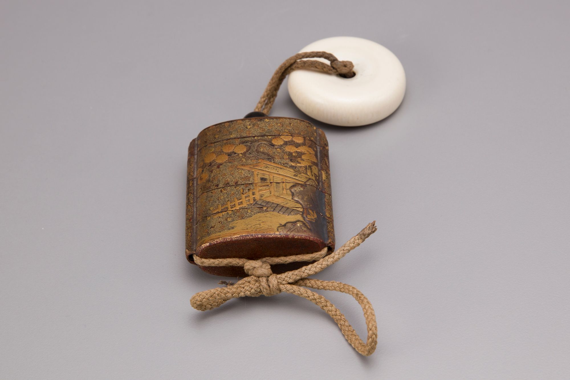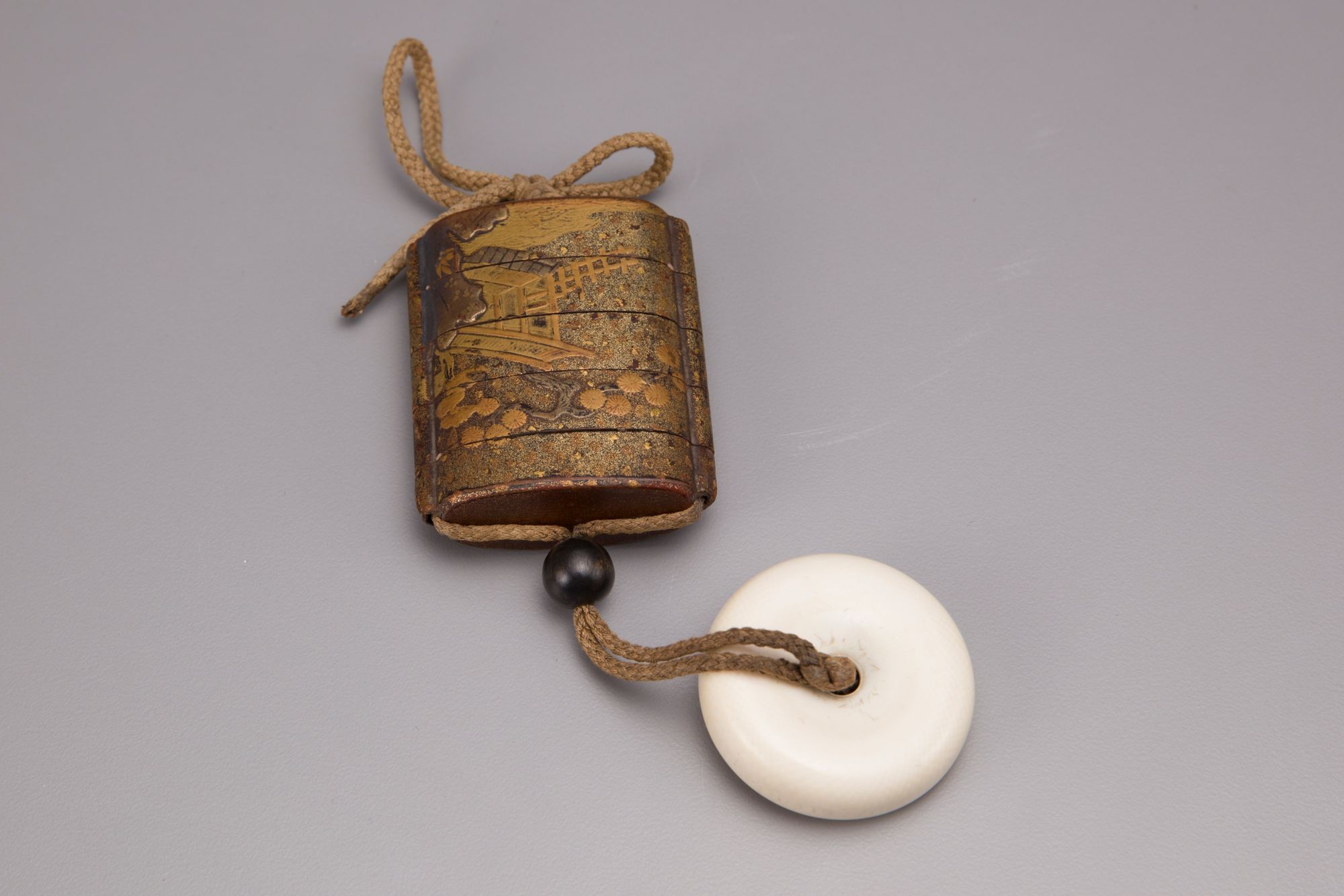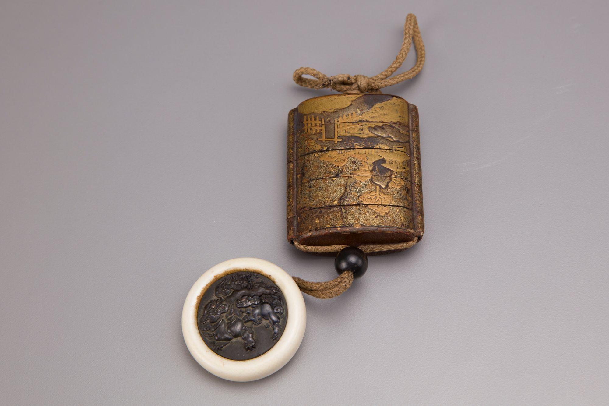 Lacquered and gilded inro with four compartments and gold lacquered interior and ivory and bronze netsuke depicting two of dogs. The inro decorated with a landscape showing mountains and pagoda.