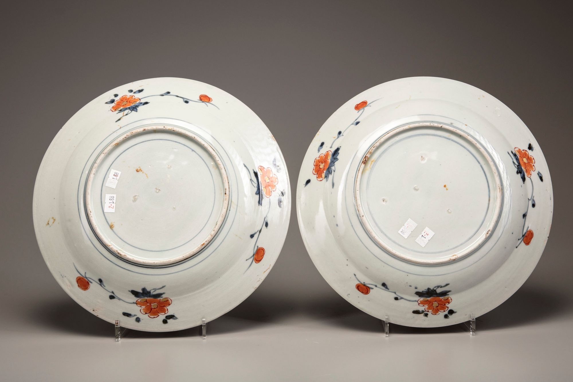 Decorated in underglaze blue and heightened with enamel and gilt, to the centre a fenced terrace with a flower vase filled with peony and two butterflies, the sides and rim with three shaped panels decorated with prunus, bamboo and a ho-o bird.