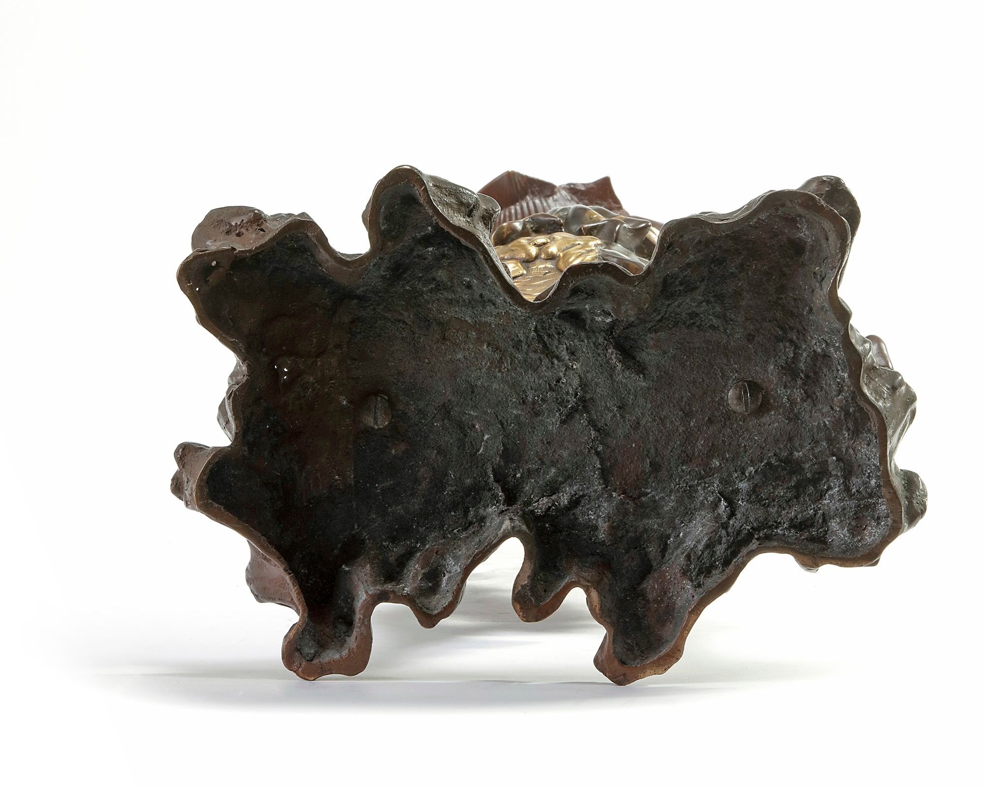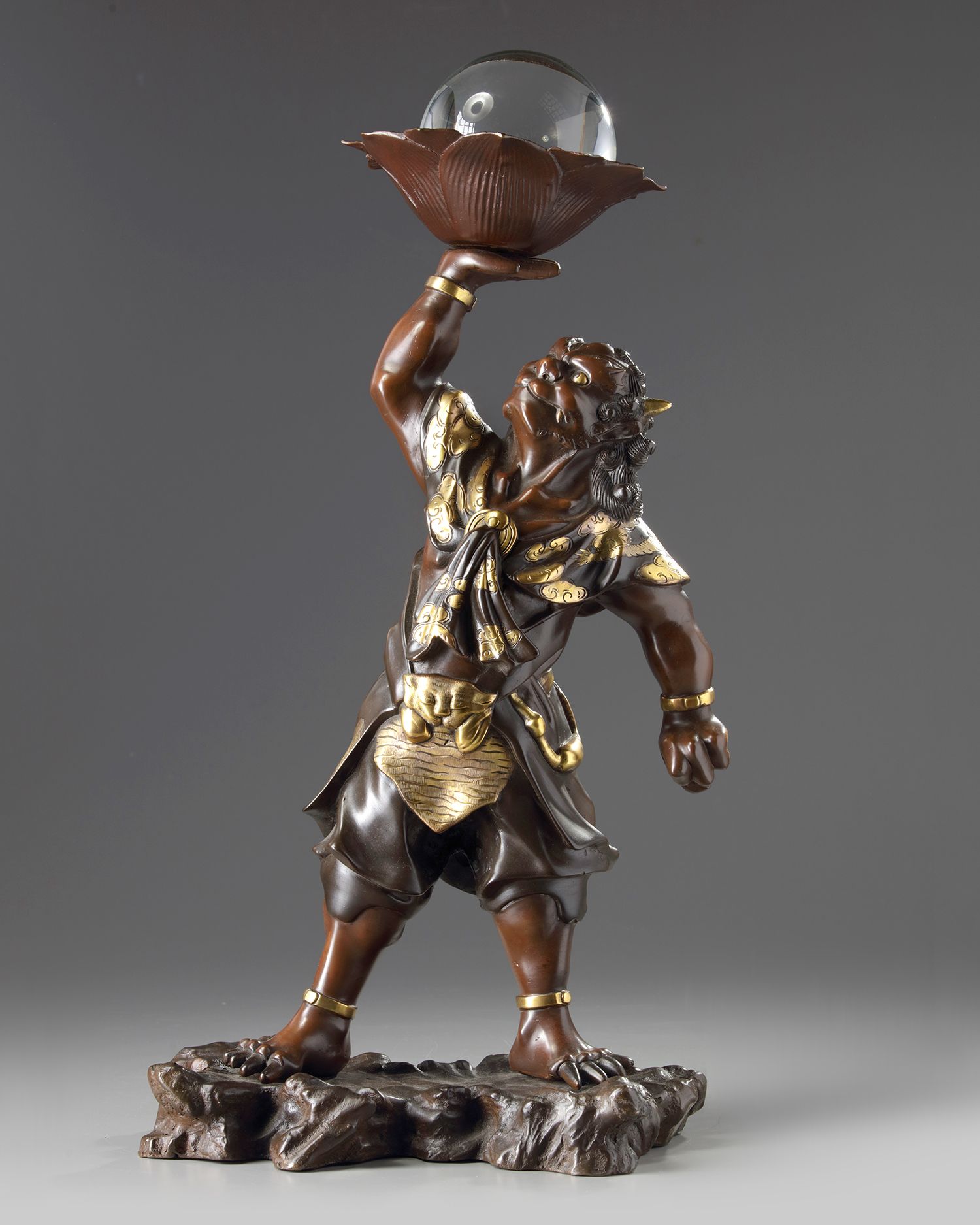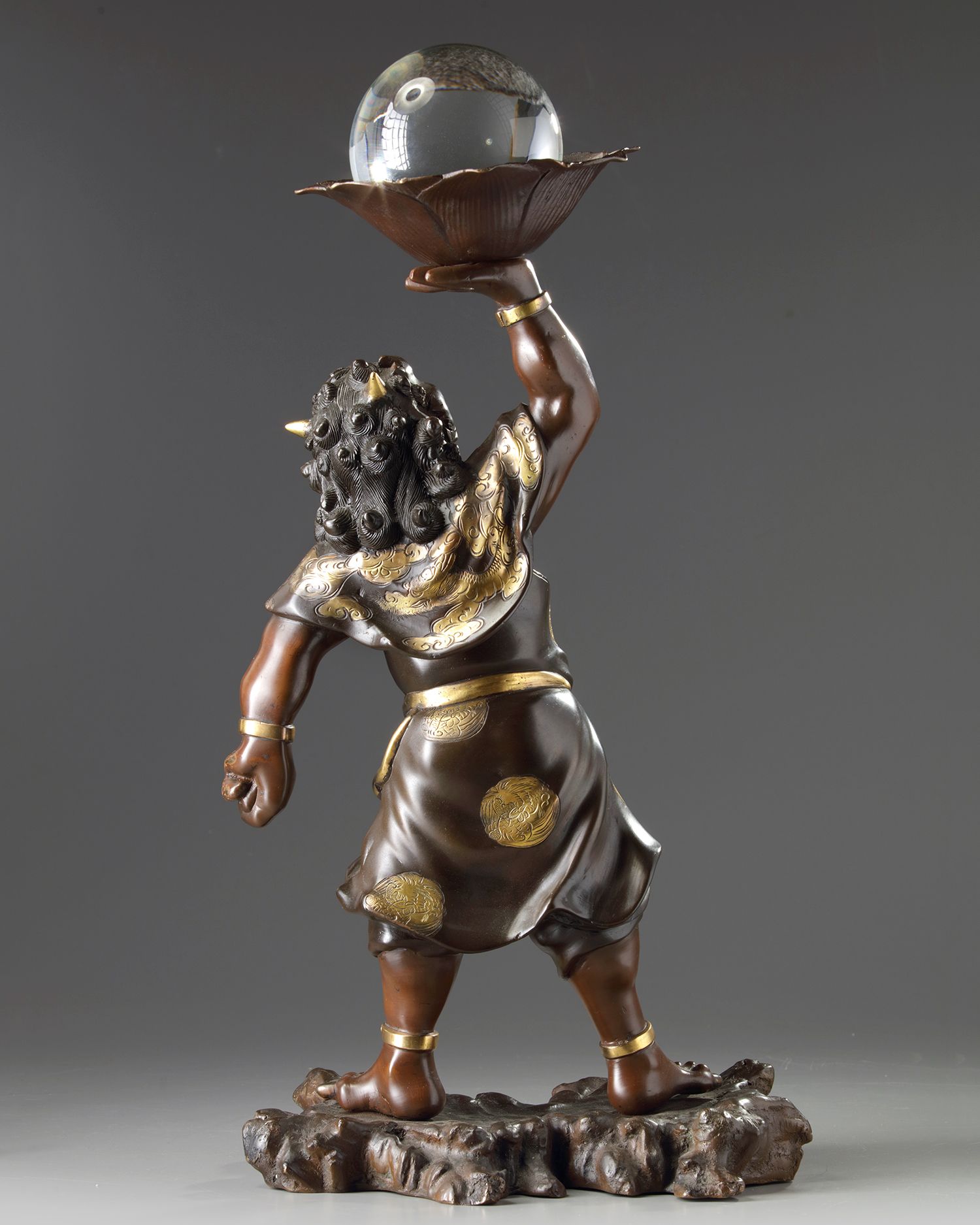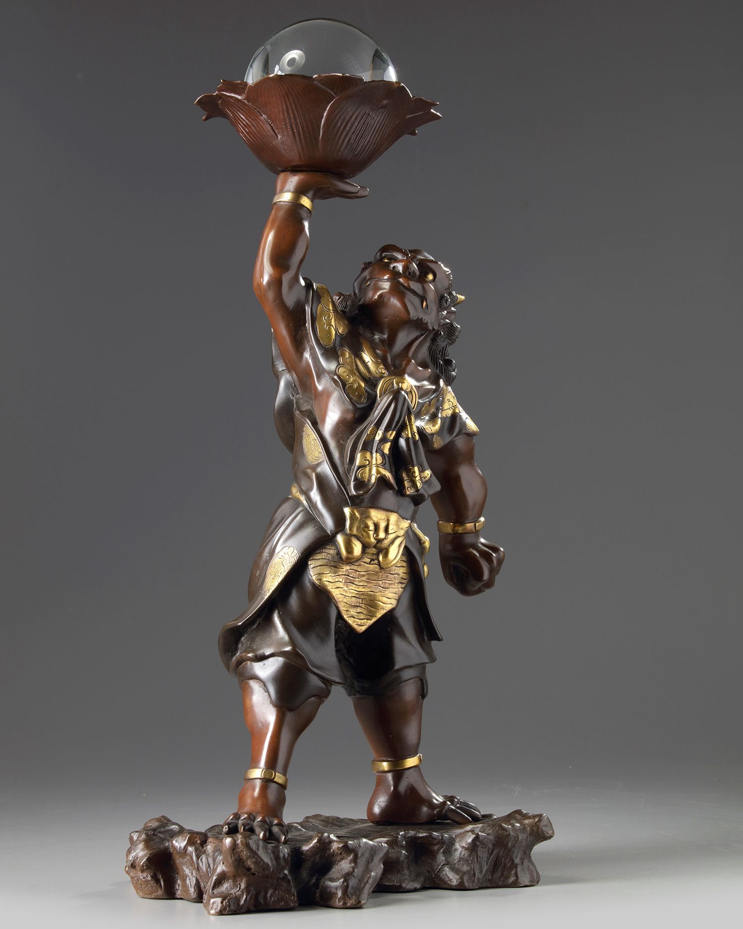 A bronze and partial-gilt sculpture of a Demon, on a bronze stand, holding a flower shaped bowl on his right hand. The figure is gold and brown patinated.