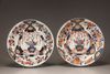 decorated in underglaze blue with iron red and gold. the centre with a flowerpot with peonies and a flowering tree on a fenced terrace surrounded by a band with floral designes of peonies and chrysanthemum.
