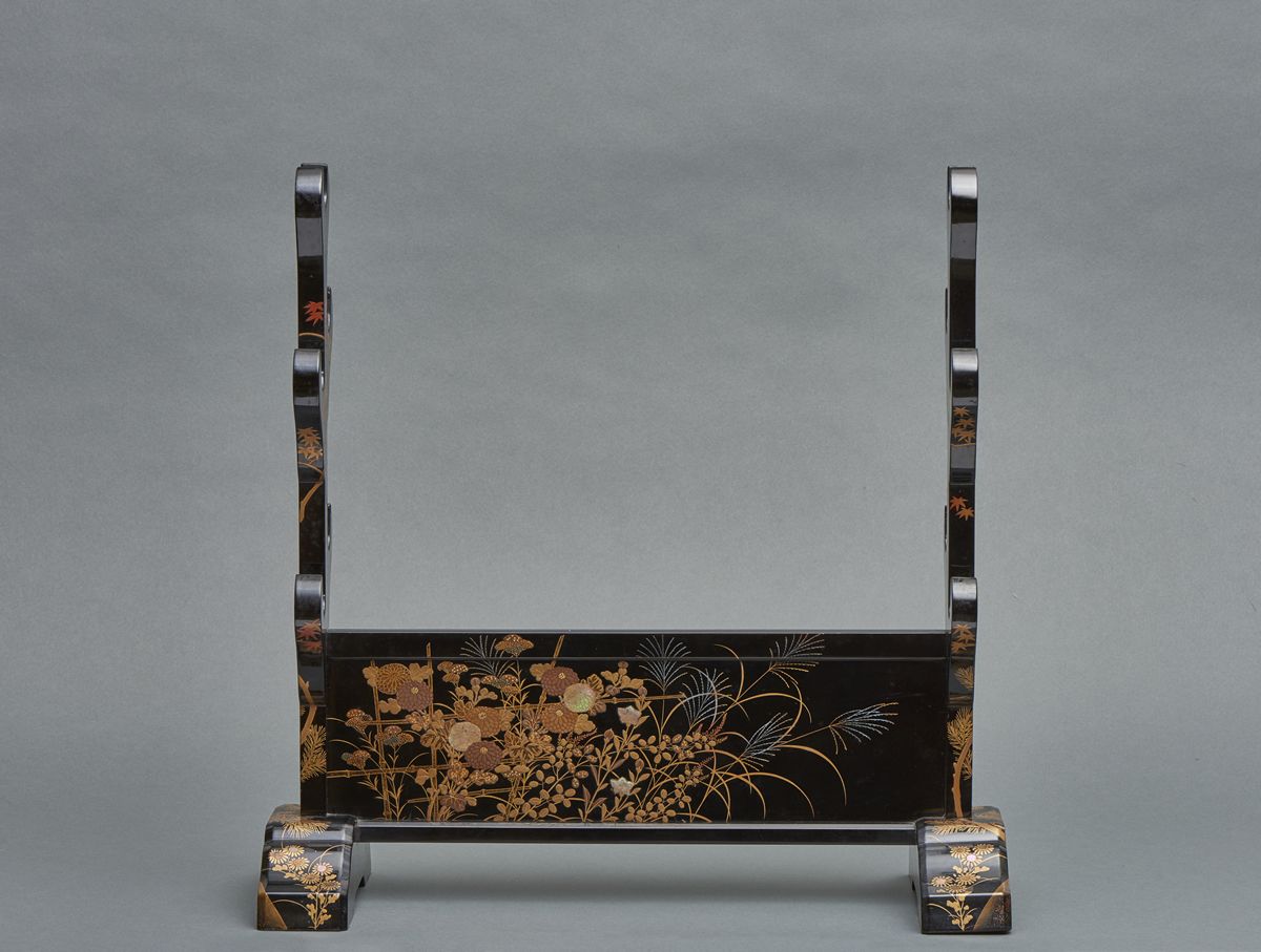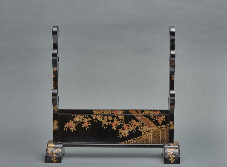 Black lacquered sword stand (katanakake) for five swords decorated with cherry blossom and, at the other side, the seven herbs of autumn; the sides of the sword stand shows sprays of autumn leaves (momiji), pine tree and chrysanthemums in gold maki-lacquer and mother-of-pearl inlay, in original box.