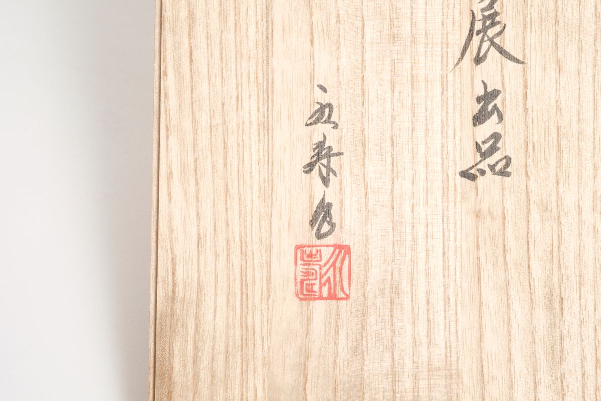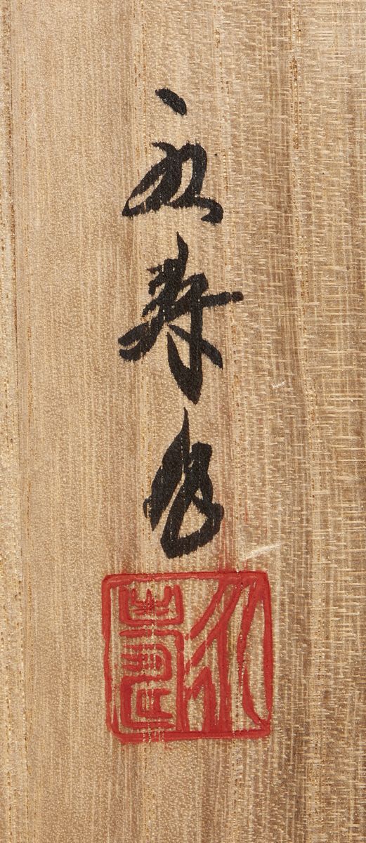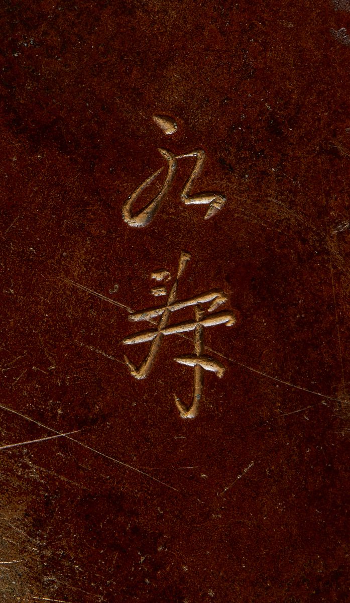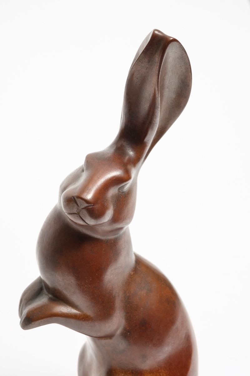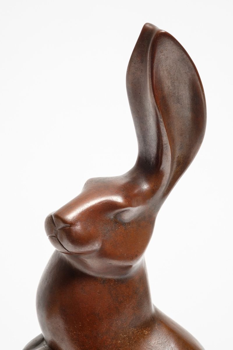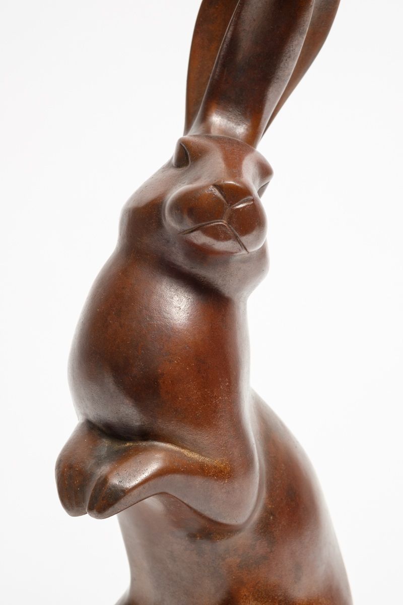 Brown bronze figure of a rabbit standing upright in original signed box by Tsuda Eijū (1915-2000). According to the inscription on the box the figure was exhibited at the Mitsukoshi Exhibition of Bronze work. Bottom mark: Eijū. H. : 30,5 cm; Poids: 2403 g.
