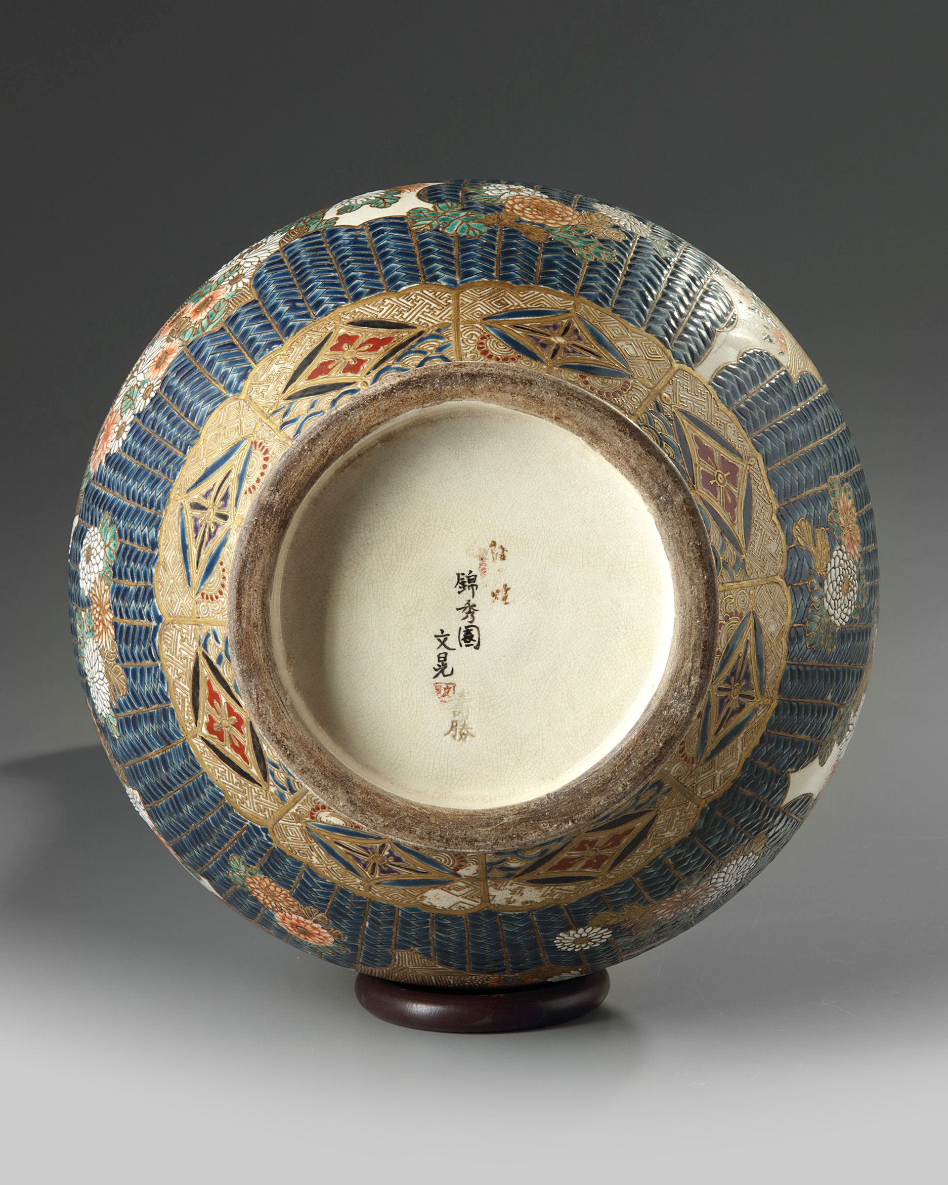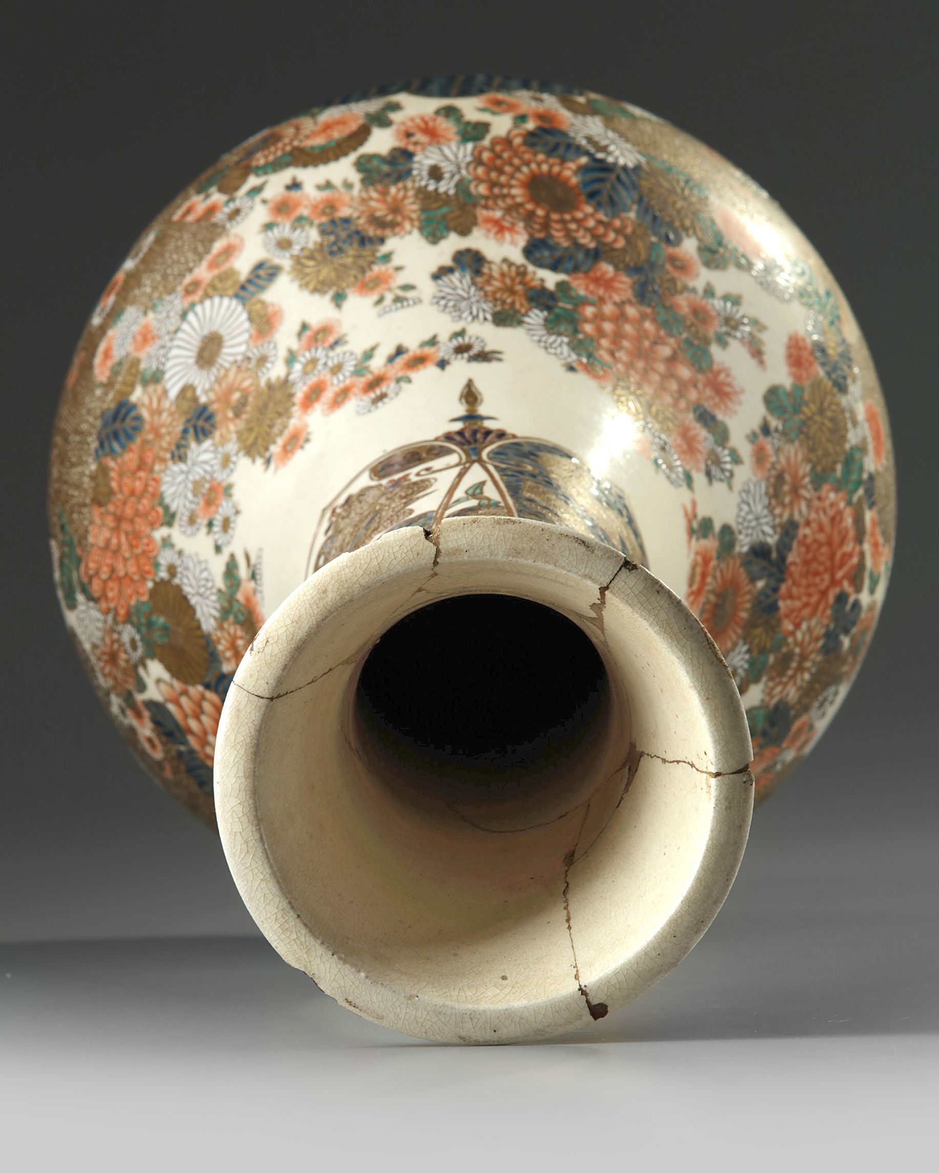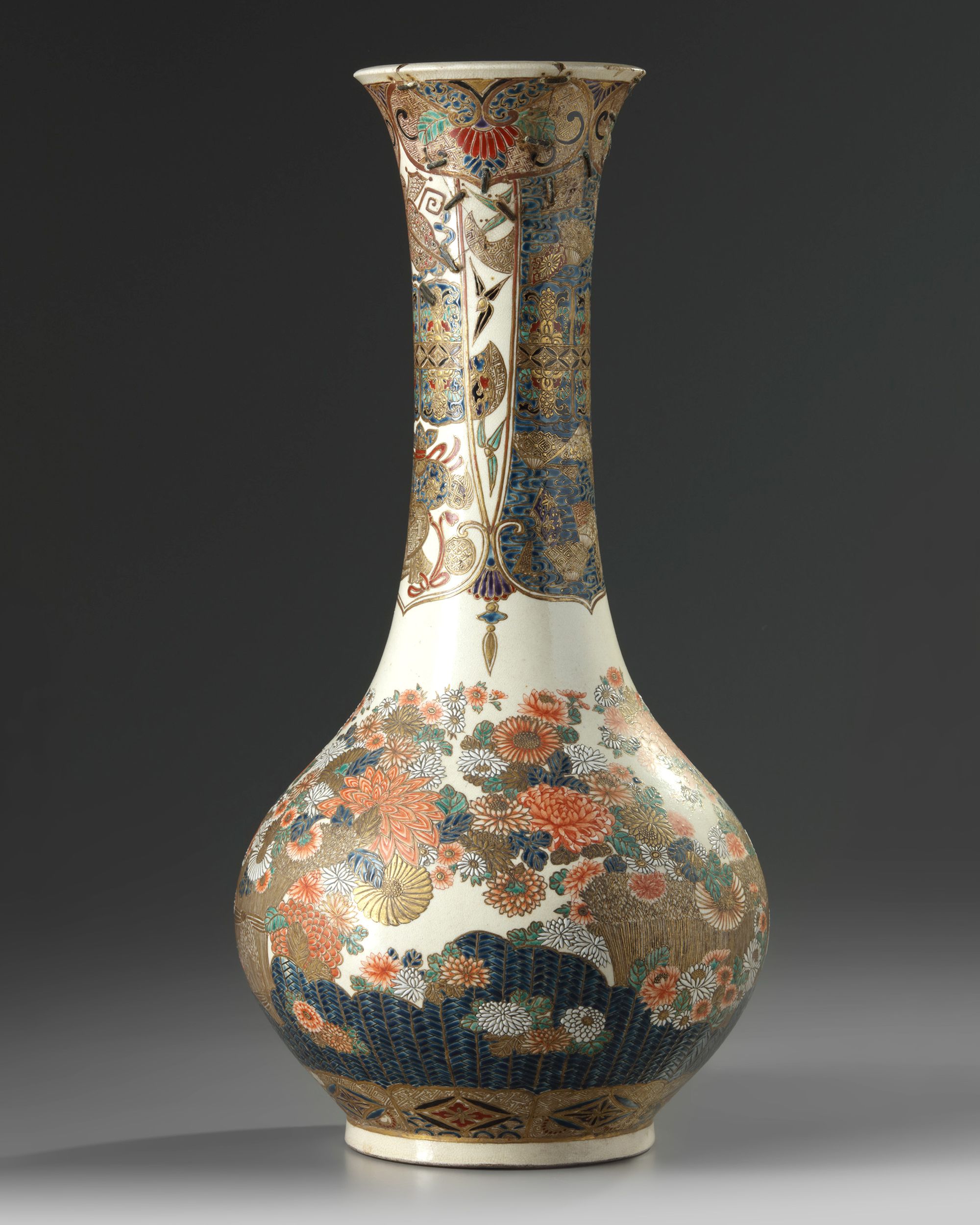 A Japanese Satsuma vase, with an elongated neck, decorated and gilt in various colors enamels on a cream ground with different flowers like peonies and chrysanthemums amongst foliage.