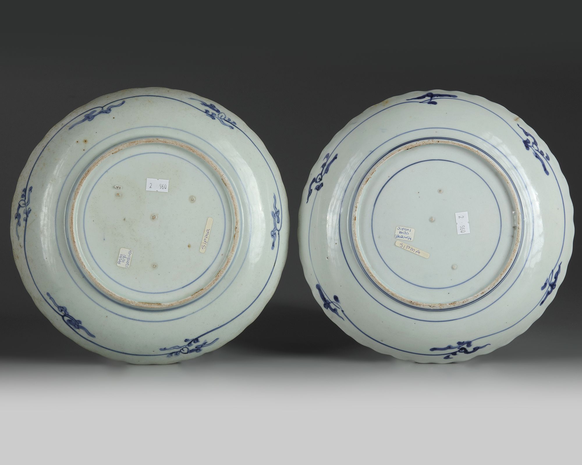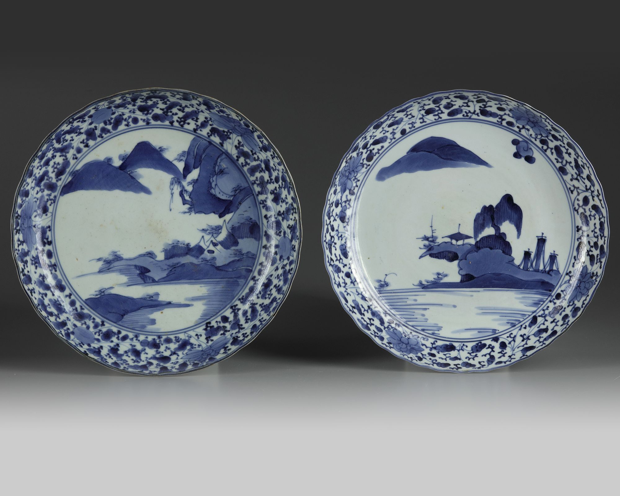 Both dishes on footring, undulating rim . One the base three spur-marks in a V-pattern and a Y-pattern. Decorated in underglaze blue with a river scene, a pavilion and a tree on a rocky promontory wuth sails behind. Both on the sides with continuous flower scrolls and a flower spray on the reverse.
