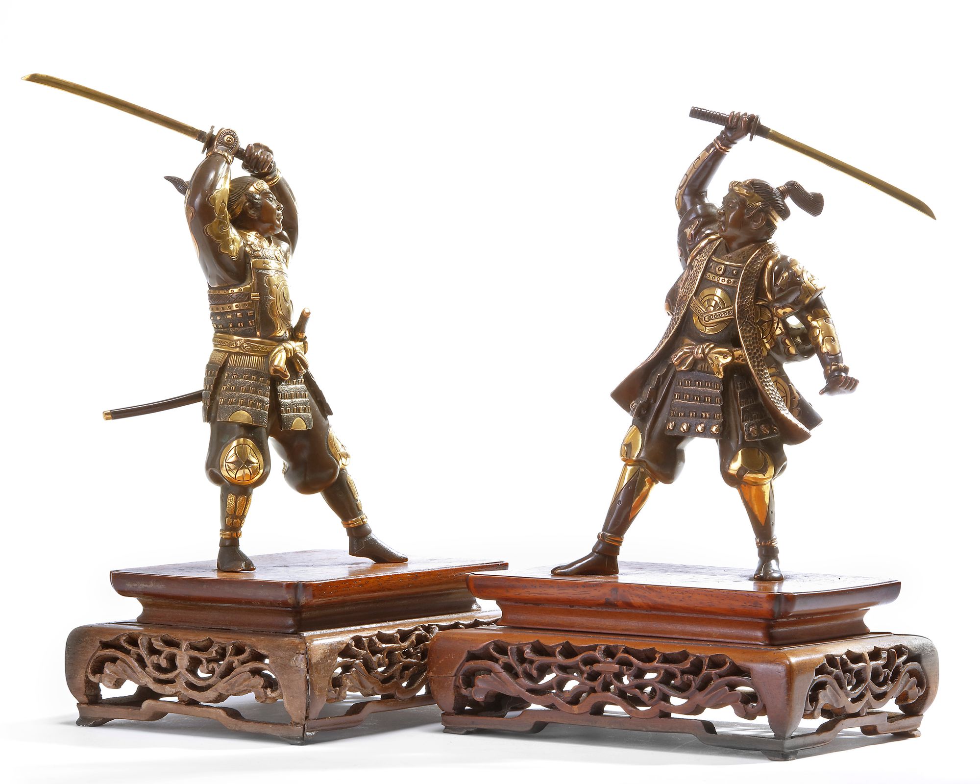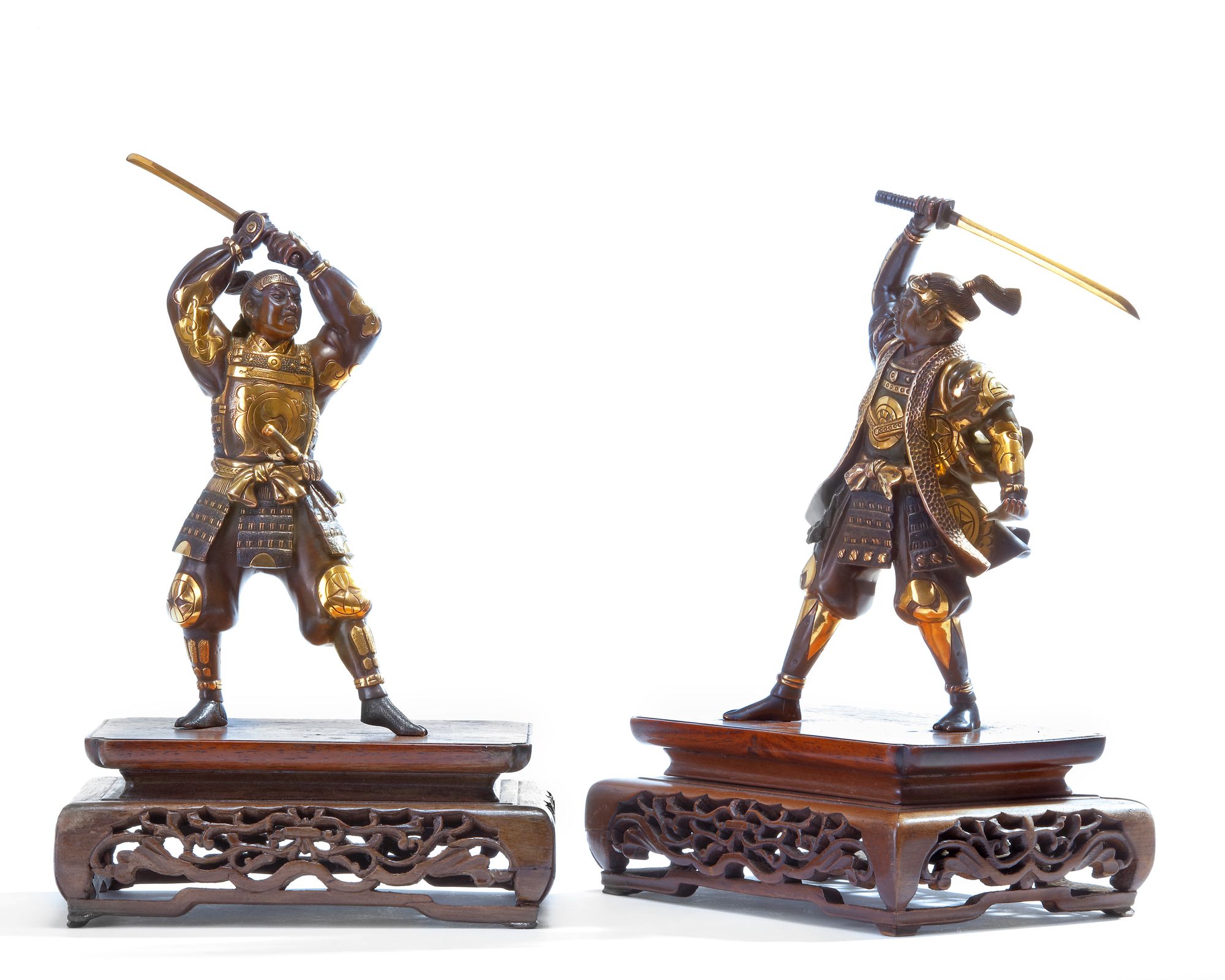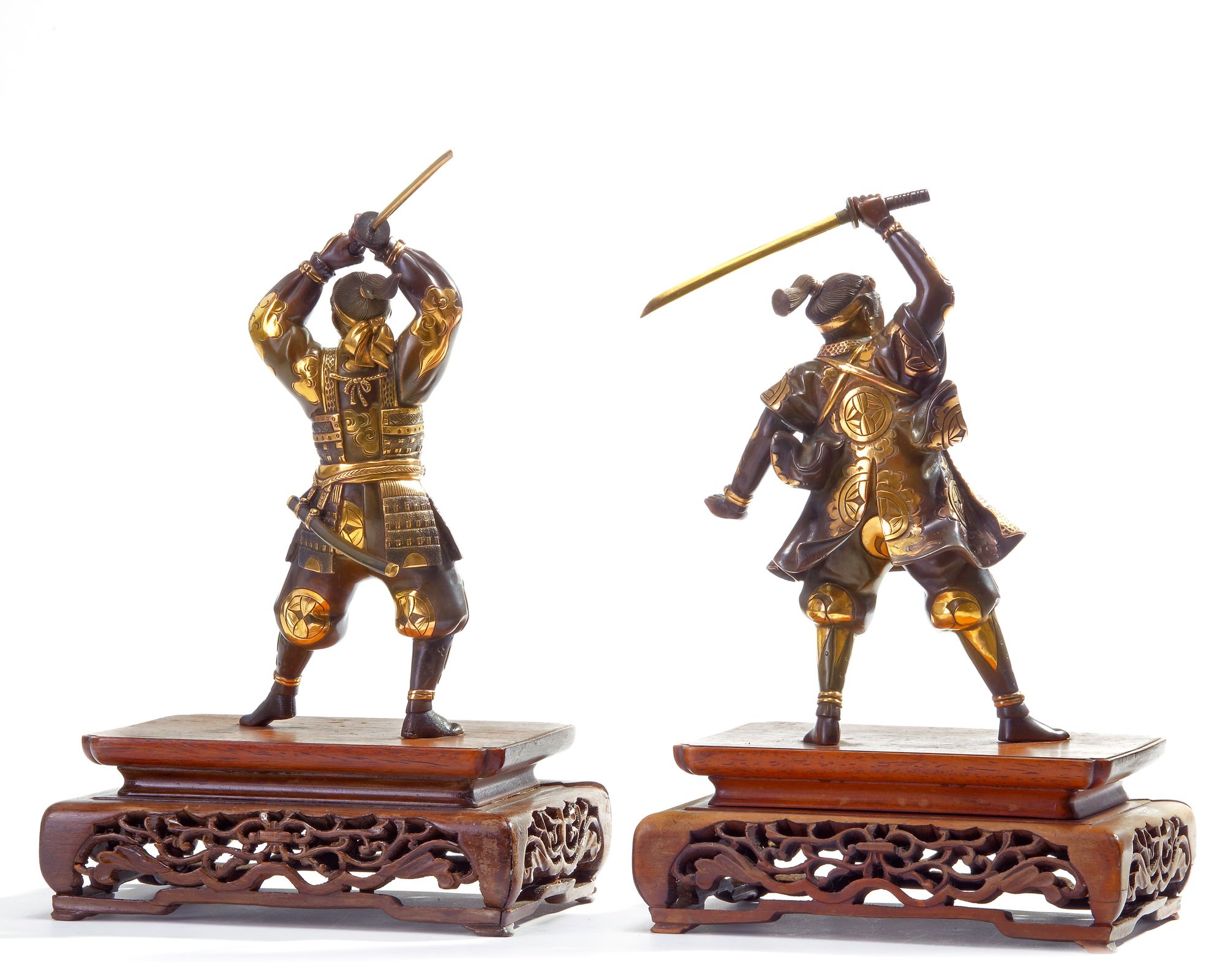 Two Japanese gilt bronze samurai warriors, each figure holds a sword in his hand, with a gilded relief decoration and wearing a wakizashi [short sword] tucked into his belt. Mounted on hardwood pierced stands.