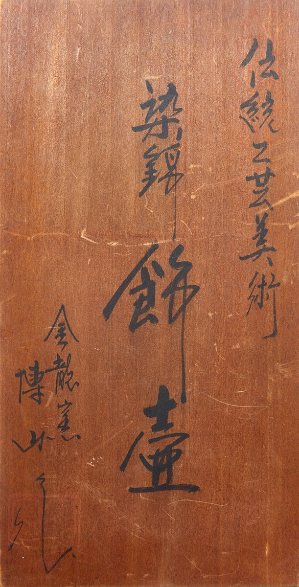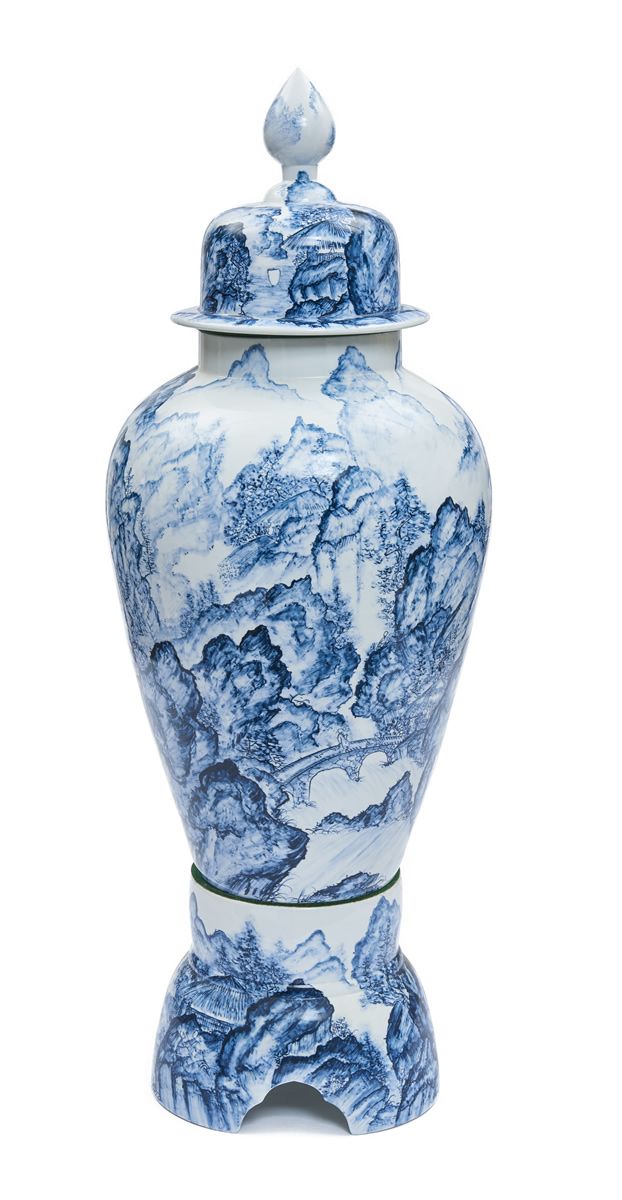 Very large blue-and-white (somezuke) Arita baluster vase (jinkōtsubo) on a separate stand; the vase is decorated with a mountain landscape with a few houses in the Nanga painting-style, by Hakuzan of the Kinryū-kiln. Bottom mark: Kinryūgama Hakuzan. With a wooden label identifying the potter.