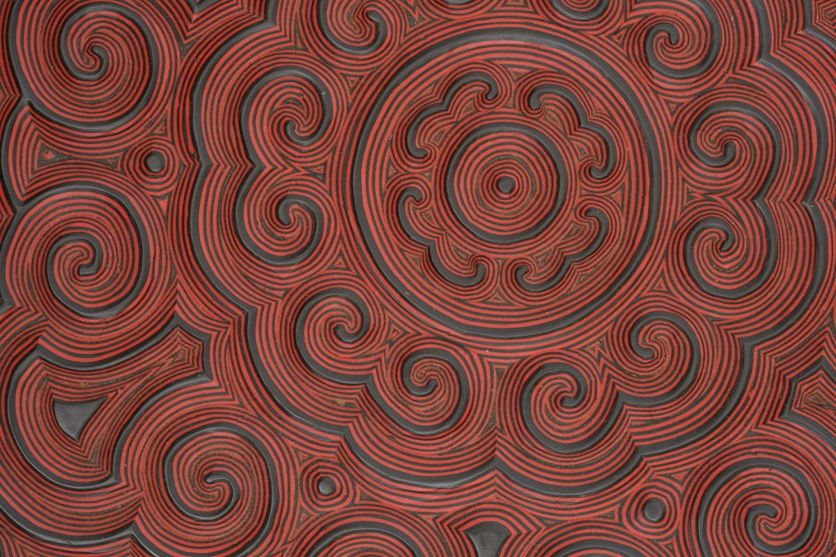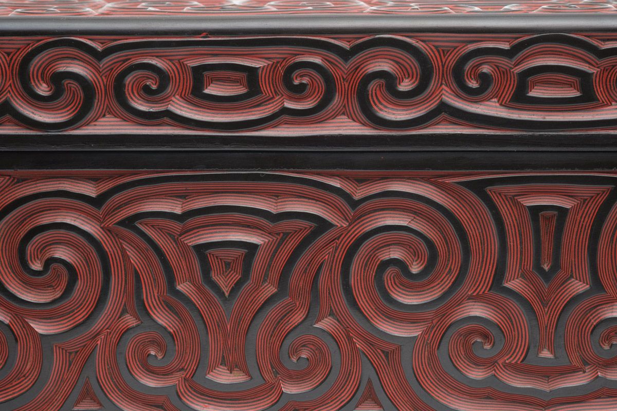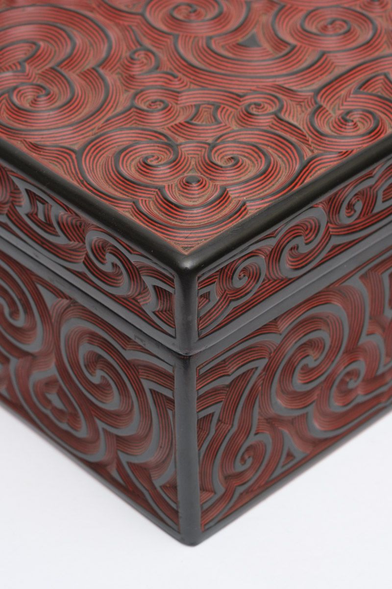 Lacquerwork box, its lid and sides decorated with carved arabesques showing alternating layers of red and black lacquer. Inside black lacquered.