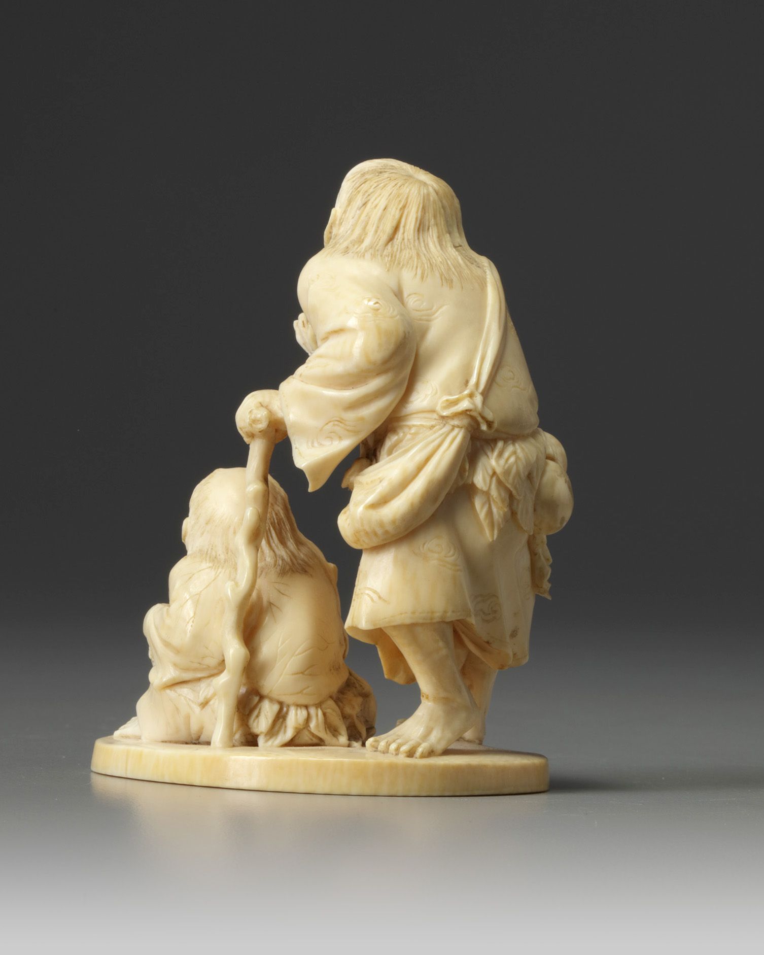 The ivory carving is of two figures, one moulded standing and leaning on a stick, the boy seated and holding a frog.