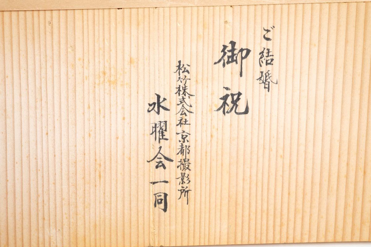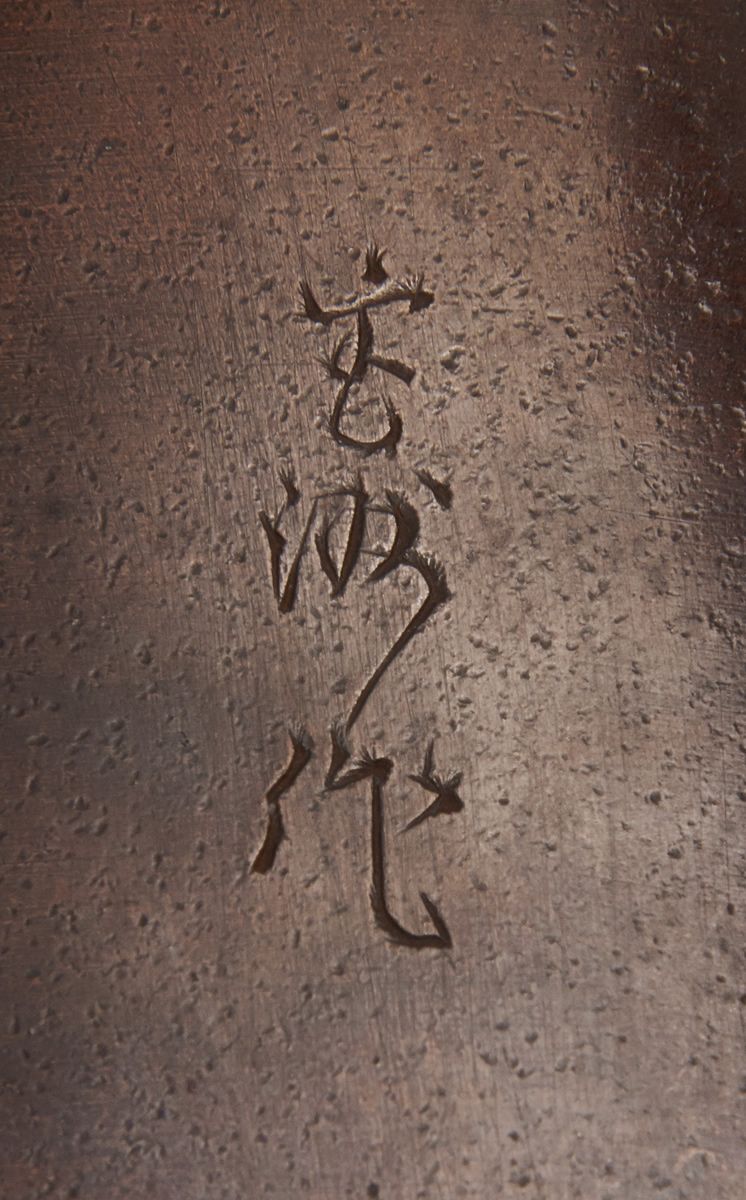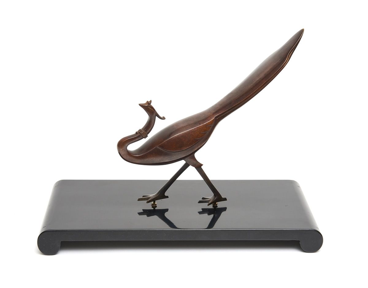 Stylised bronze phoenix-bird on a black lacquered plinth in a box. Signed under the tail: Hōrō. An inscription on the box shows that the (auspicious) bird had been a marriage present.