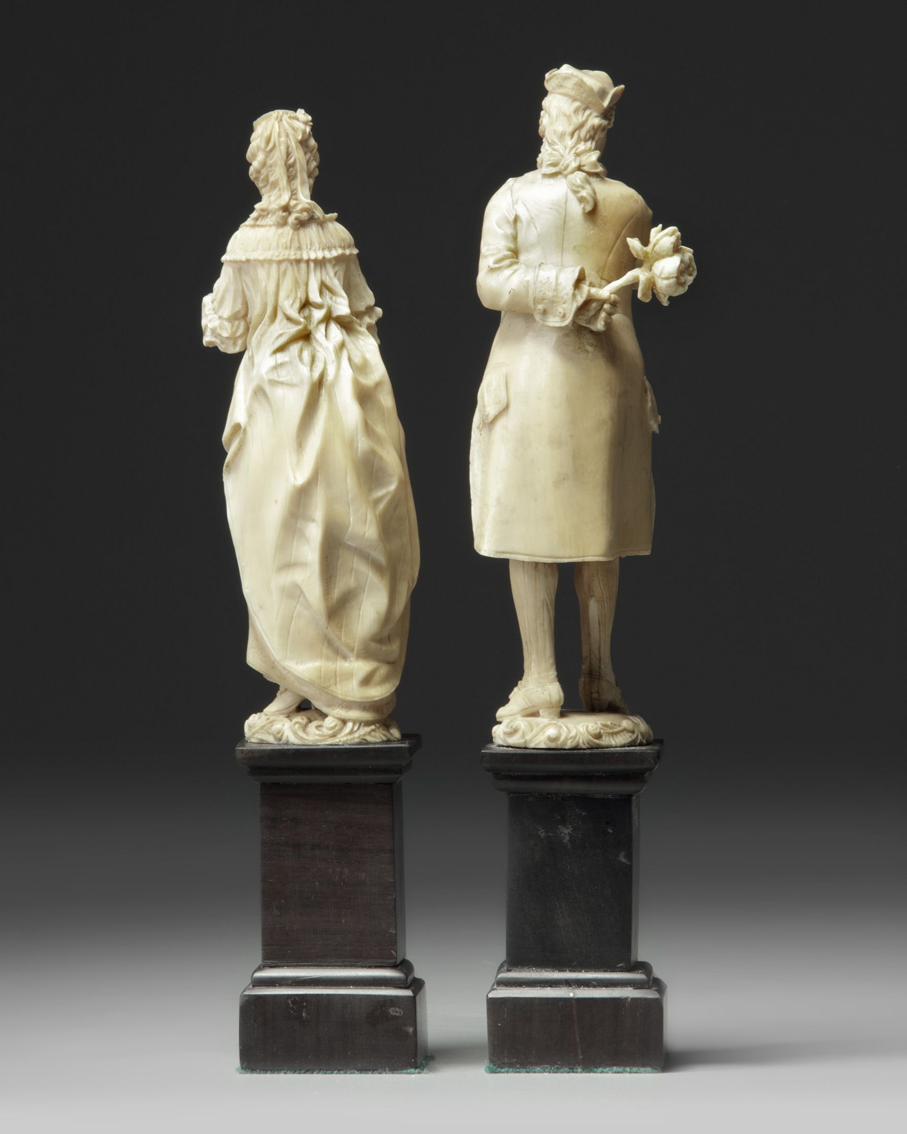 A pair of European 'Dieppe' figs on wood stands, the lady 21.00 CM including stand, the gentleman 22.00 CM high; including mounted stands.