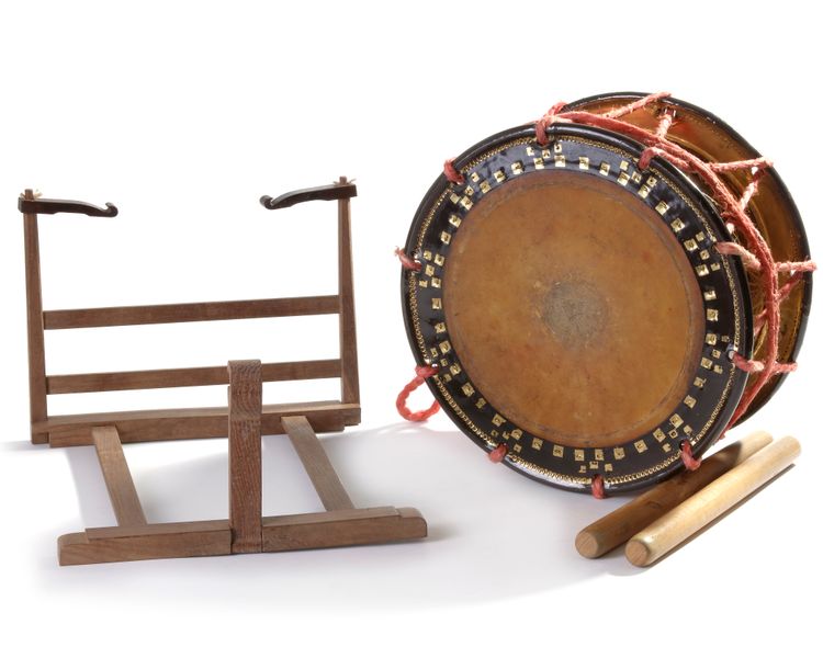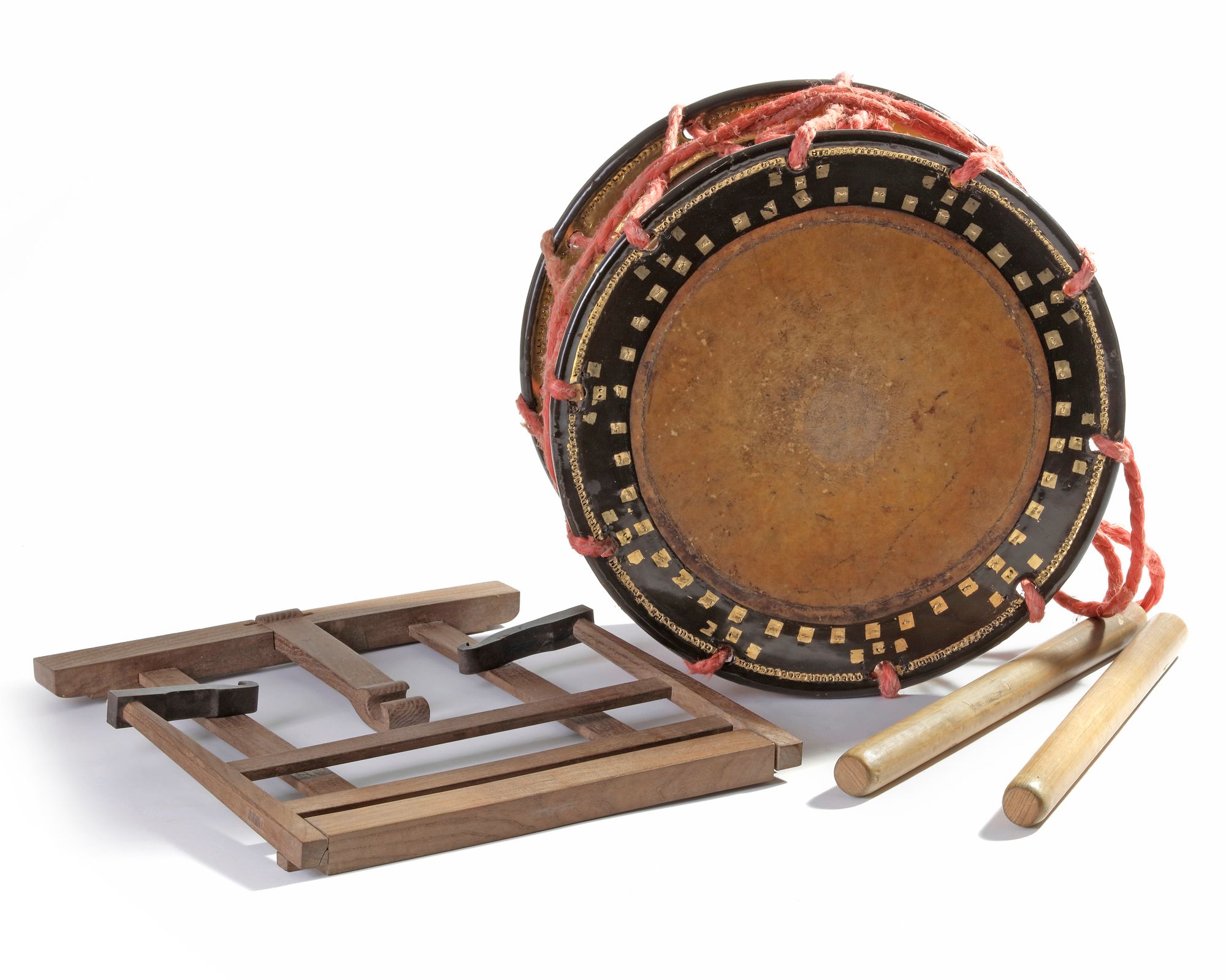 A Japanese Drum with a stand and sticks. Body: wooden striking surface: Leather The set includes: 2 sticks, one body, one stand.