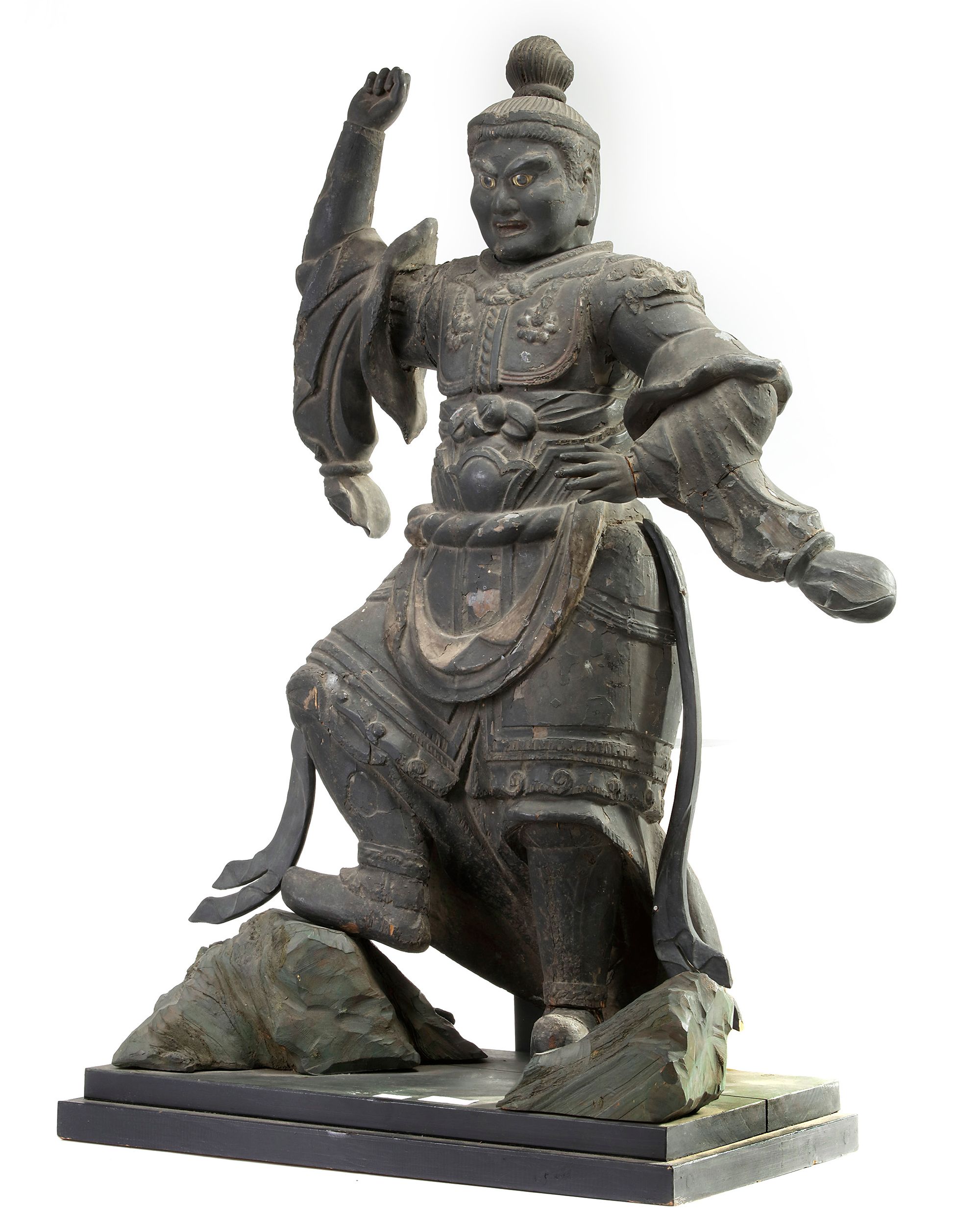 Wooden figure depicting the guardian deity Bishamon. (Sanskit: Vaisravana) on a pedestal, one foot resting on a rock, his right hand raised and his left hand holding a trident. Inlayed glass eyes. Muromachi- Early Edo period. Wooden base of a later date. H. : 68 cm; W. : approx. 55 cm.