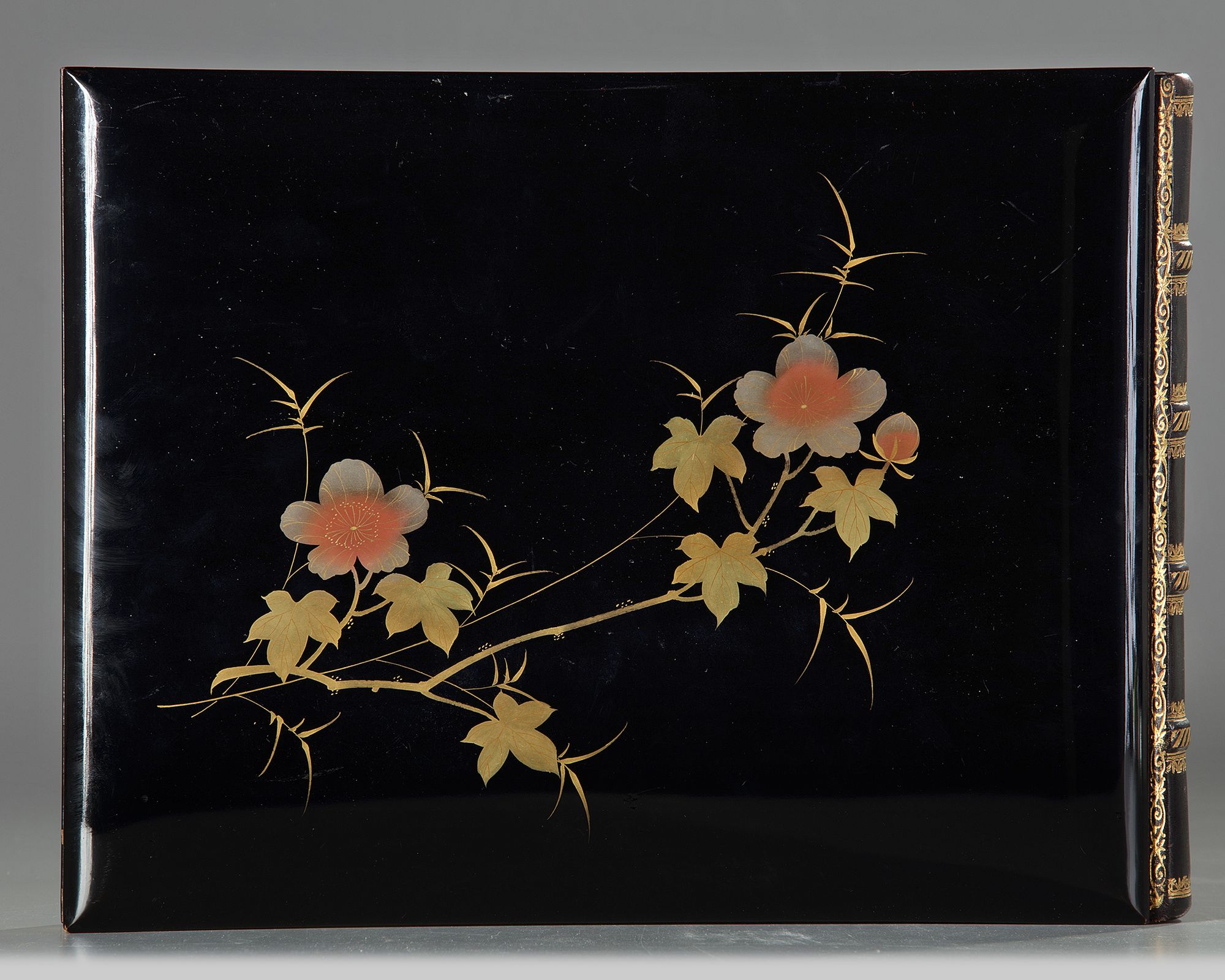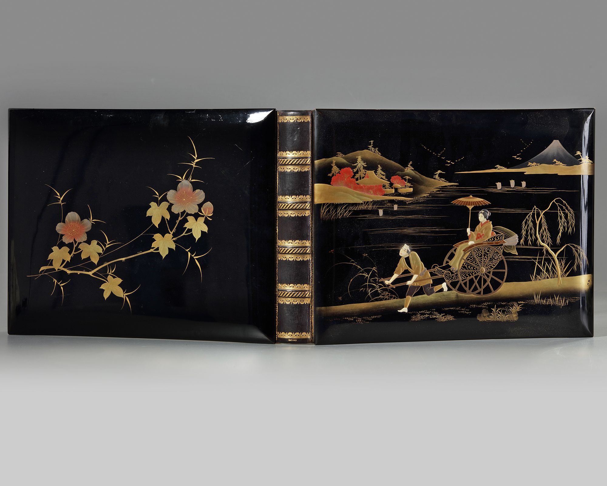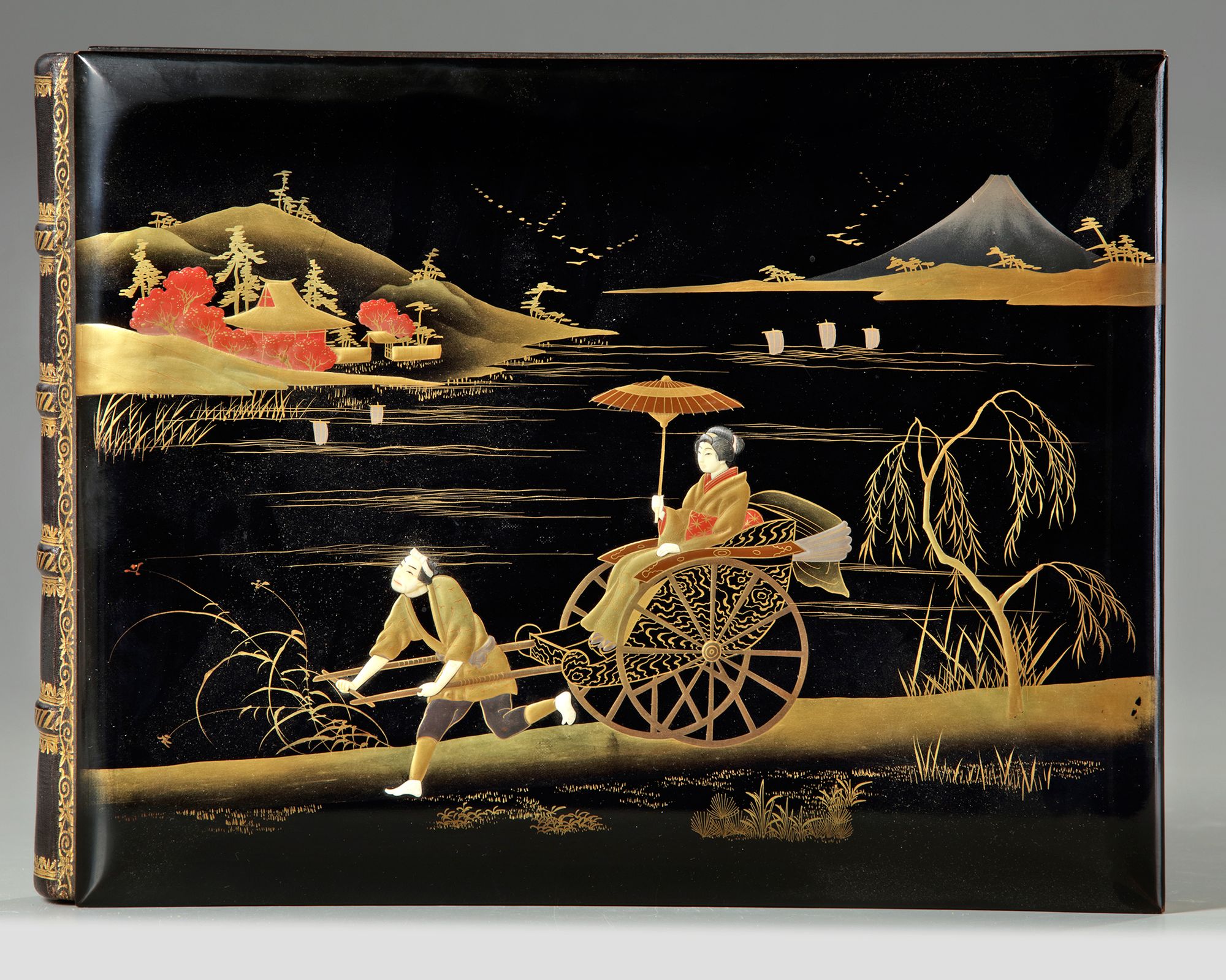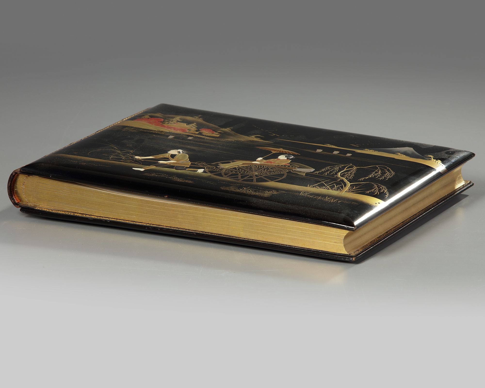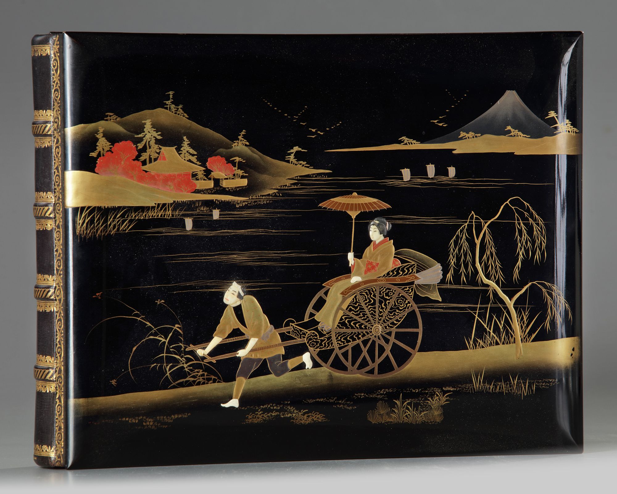 A Japanese lacquered photobook,decprated to the front side in gold maki-e lacquerand red with figures in a landscape.