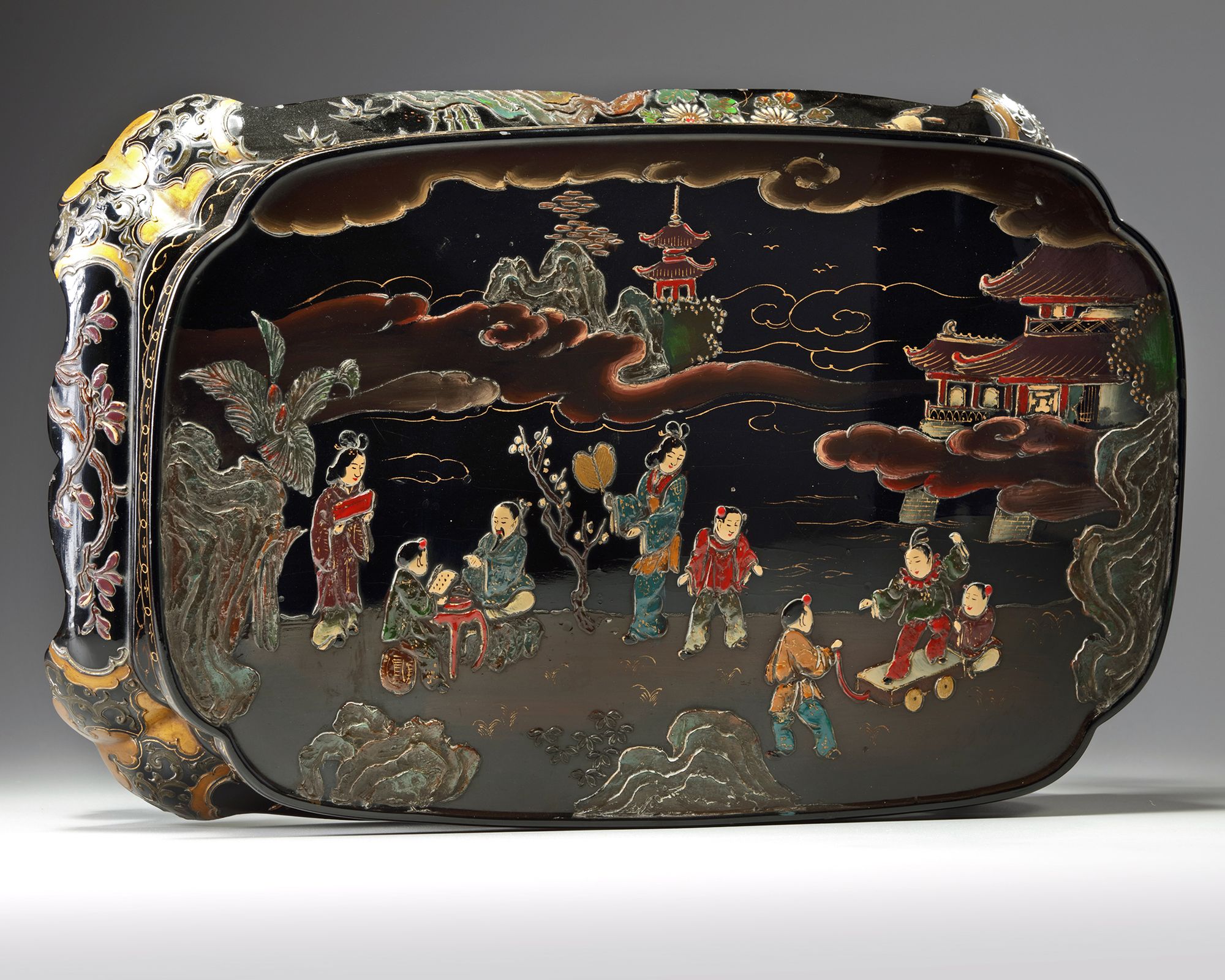 Lacquered writing table, the top has a carved polychrome Chinese design with karako-boys in a landscape with buildings and rocks near a lake.
