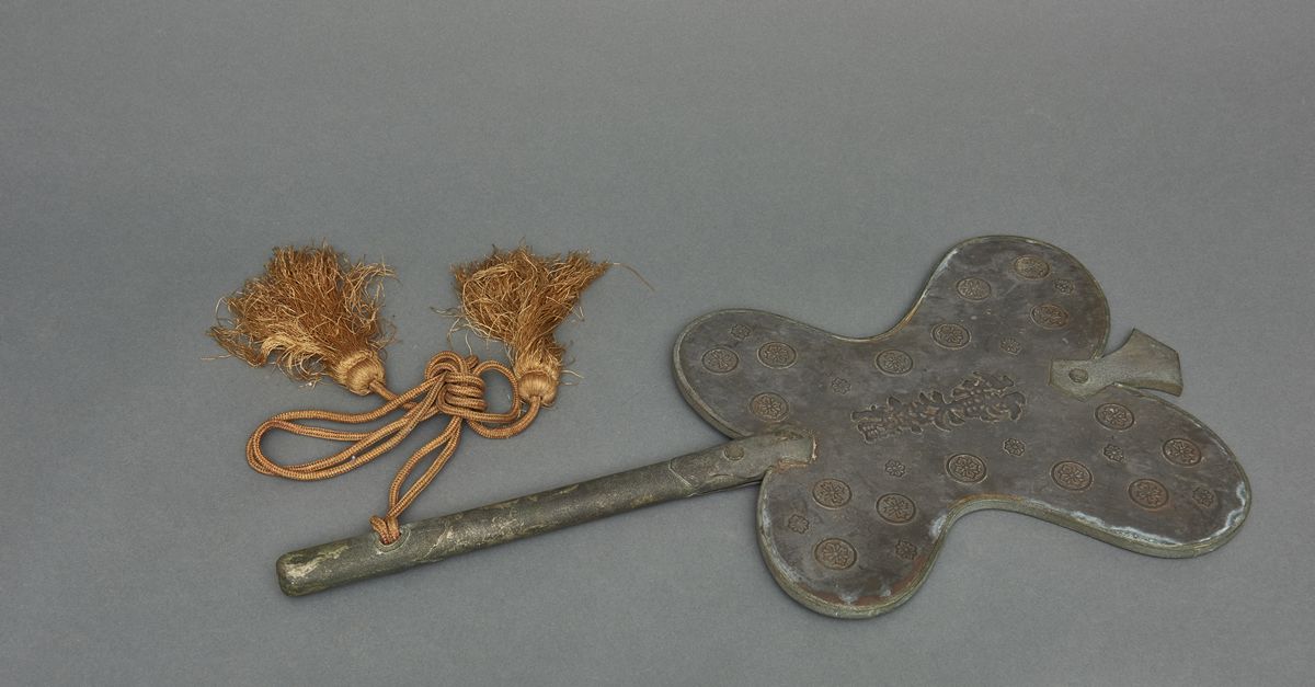 A metal butterfly-shaped battle-fan (gunbai), both sides inscribed: “Man daibosatsu” (abbreviation of Hachiman daibosatsu, the bodhisattva of War) and decorated with two types of Japanese quince crests (mokkō mon) and a brown tassel.