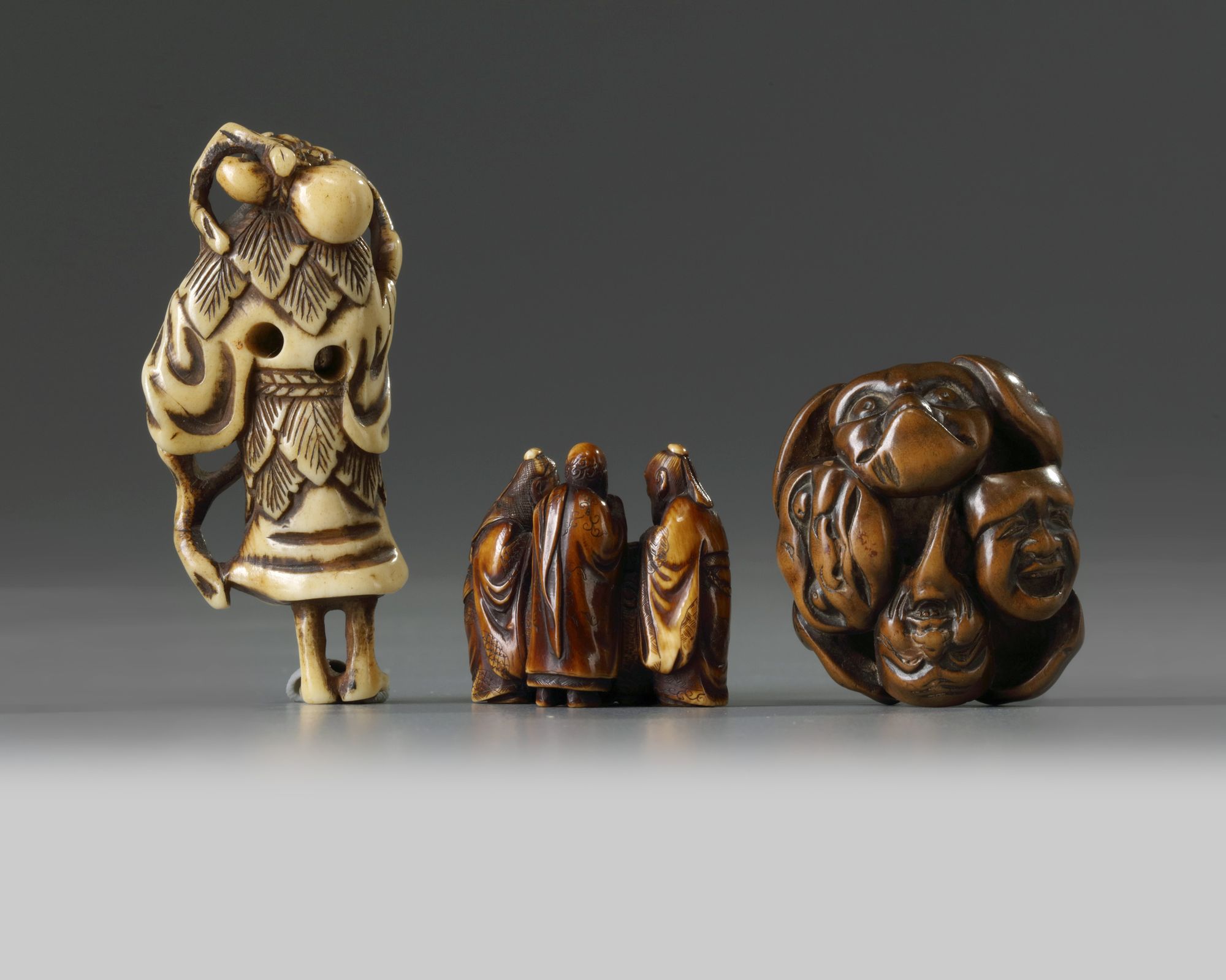consists of an ivory standing figure , three figures standing beside a large pot and five interlocked heads. The largest one 7.00 high, the smallest one 3.00 CM high.