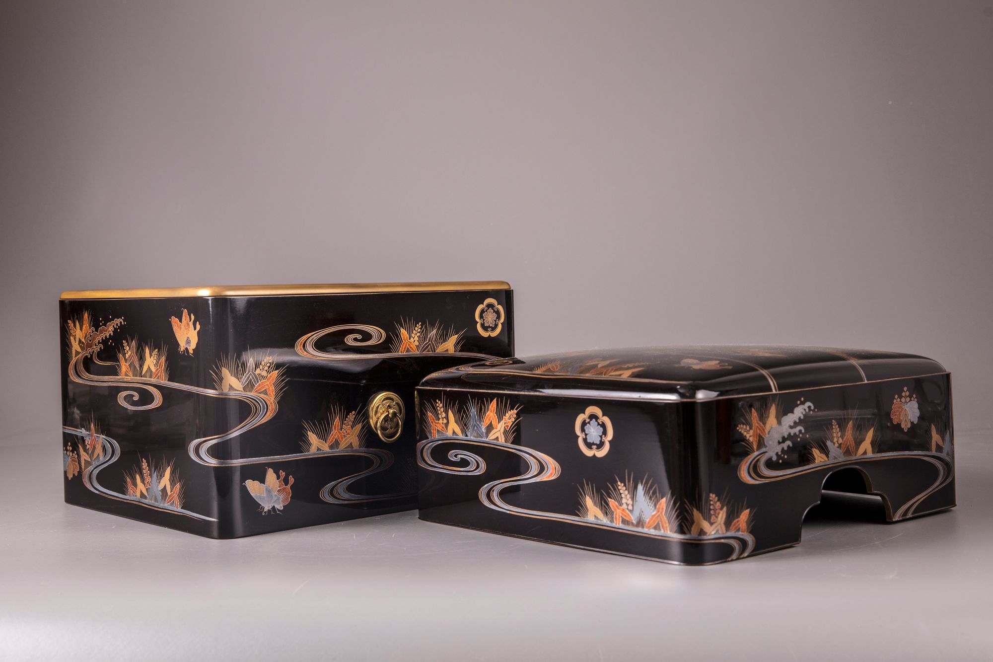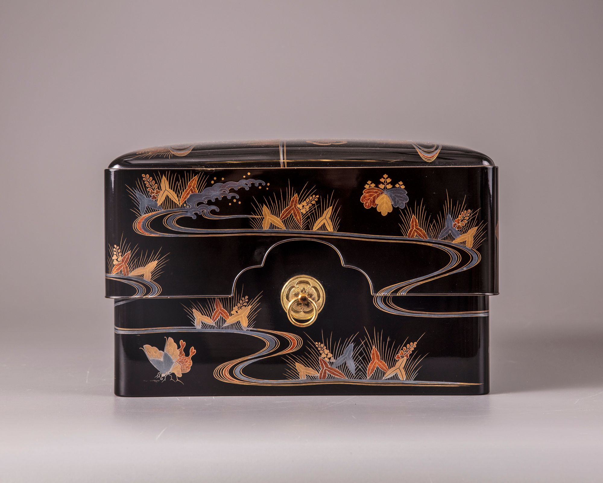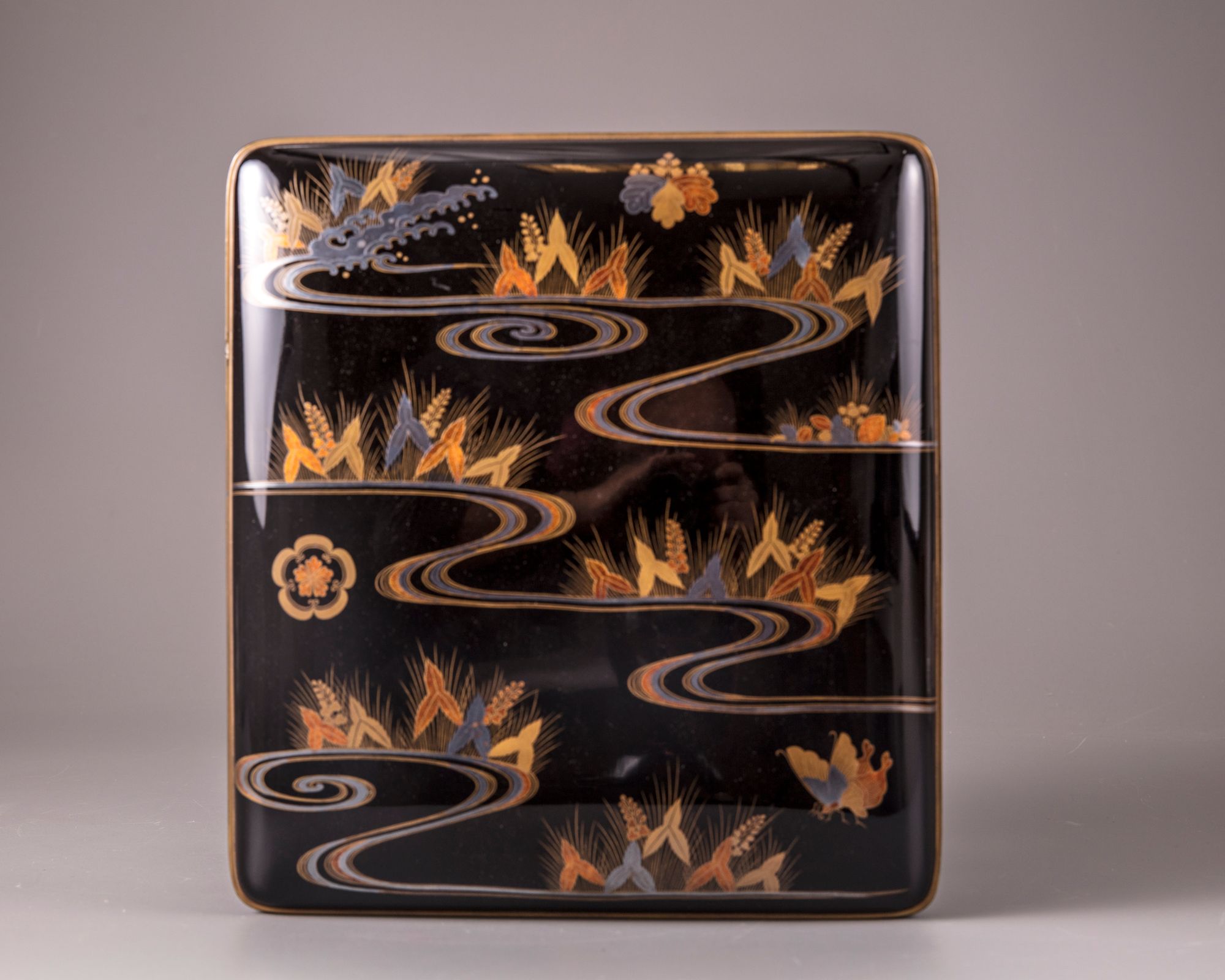 Square with round corners, finely decorated in gold and silver with butterflies and foliage.
