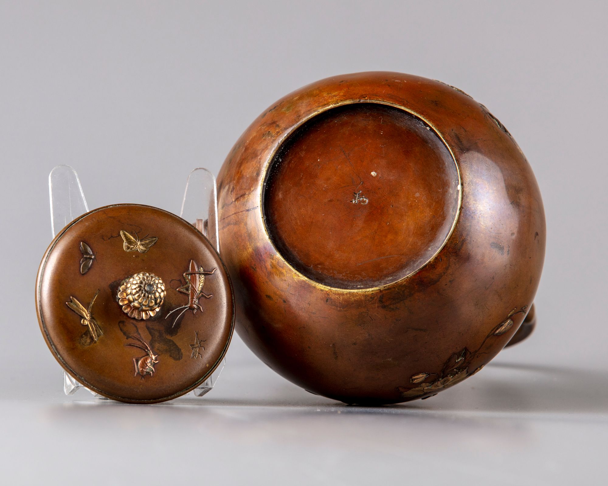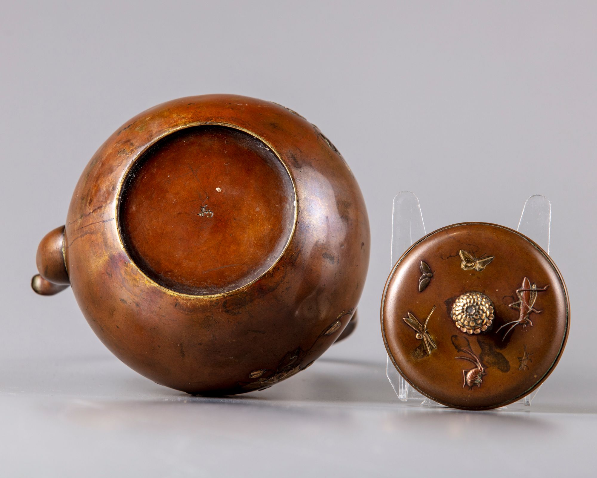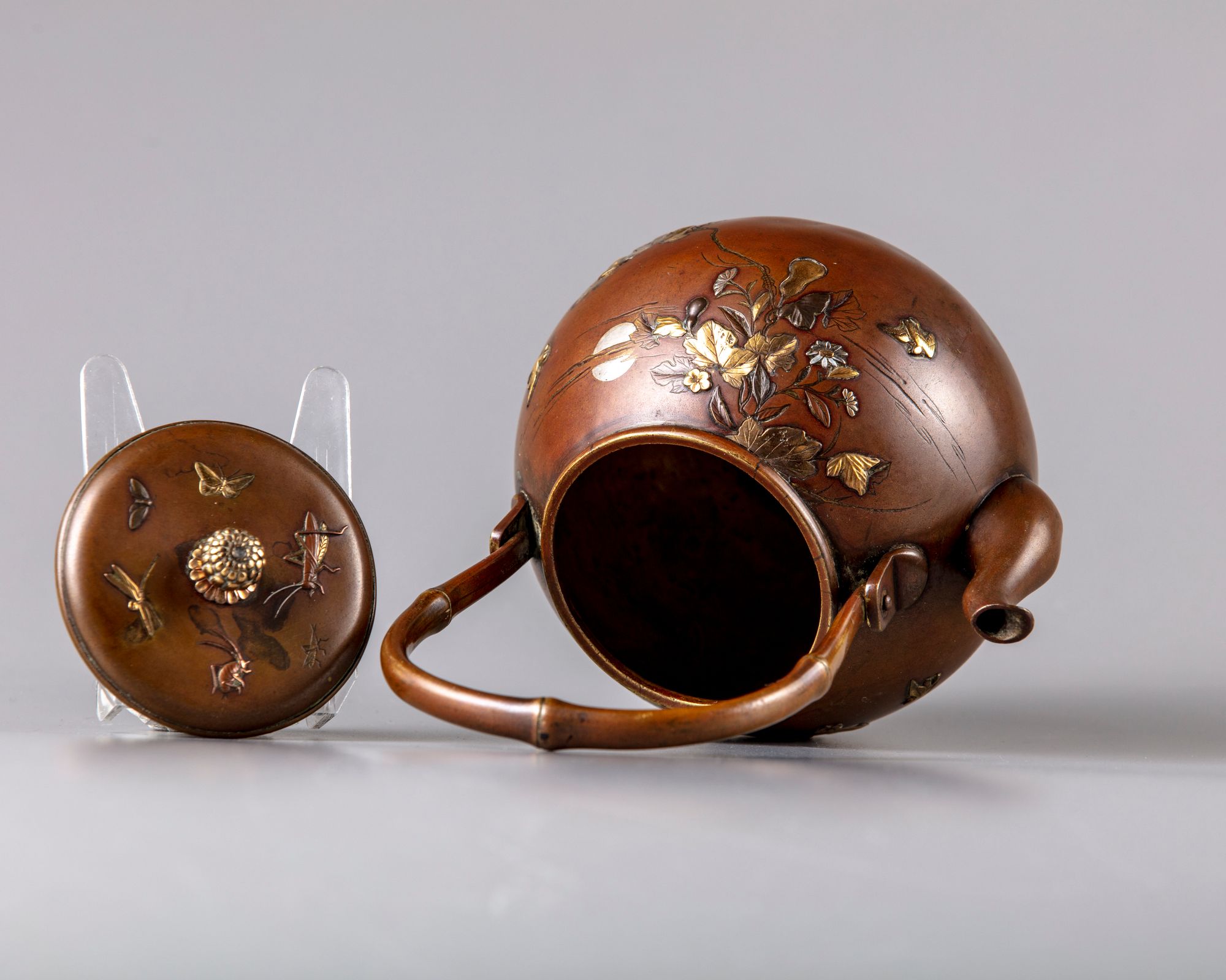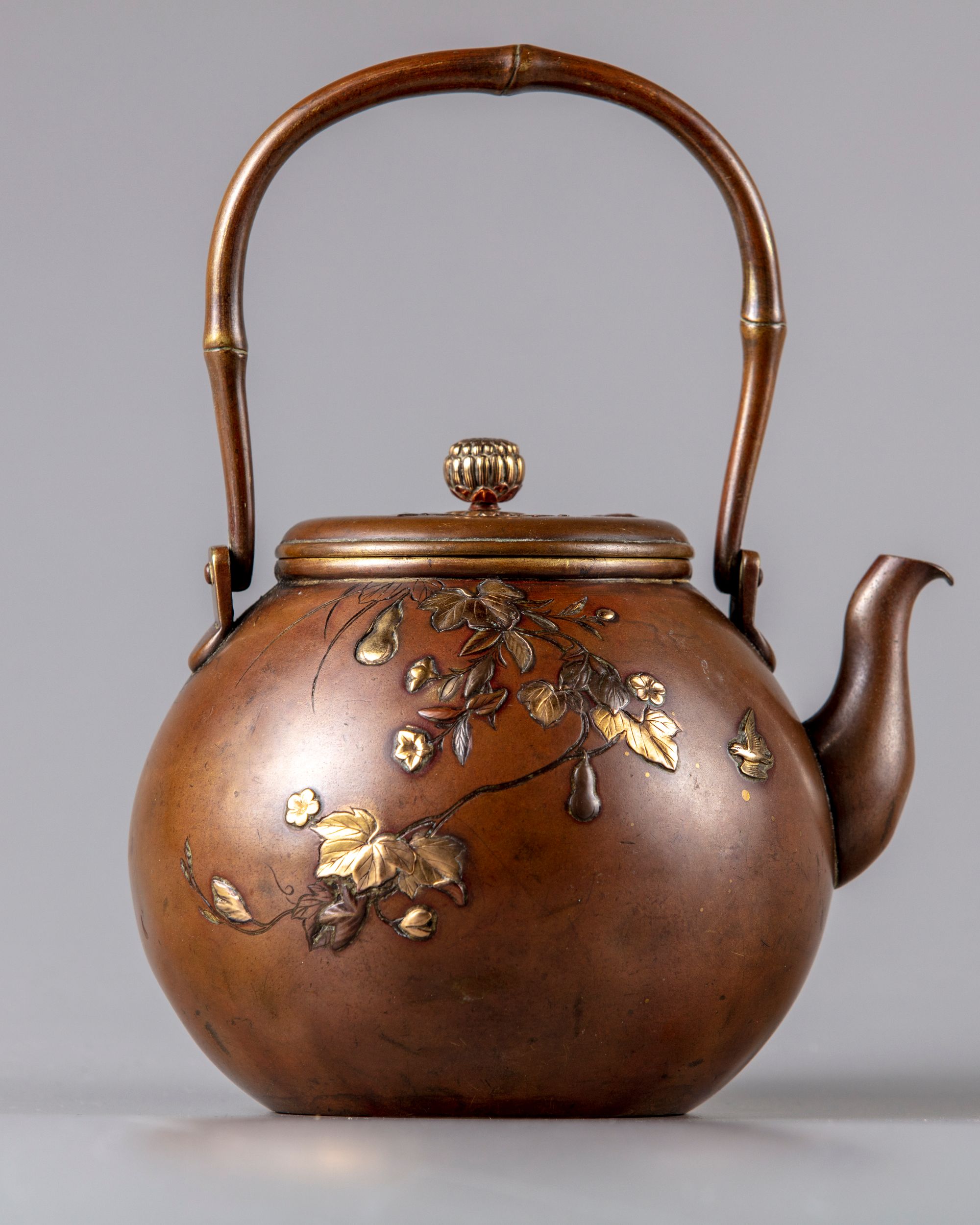 The metal teapot with a long handle and a small spout ,decorated in low relief with a gilt and silver inlaid birds in flight around flower sprays and foliage with the sun in background.