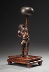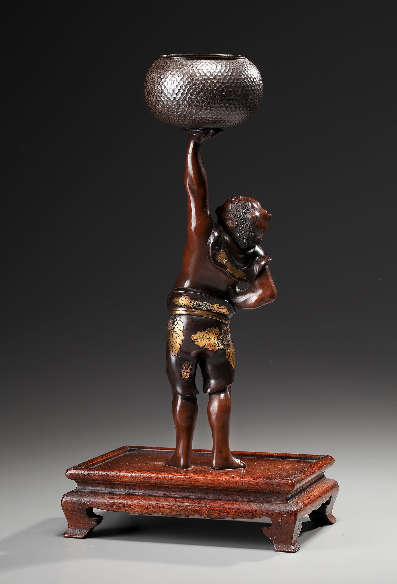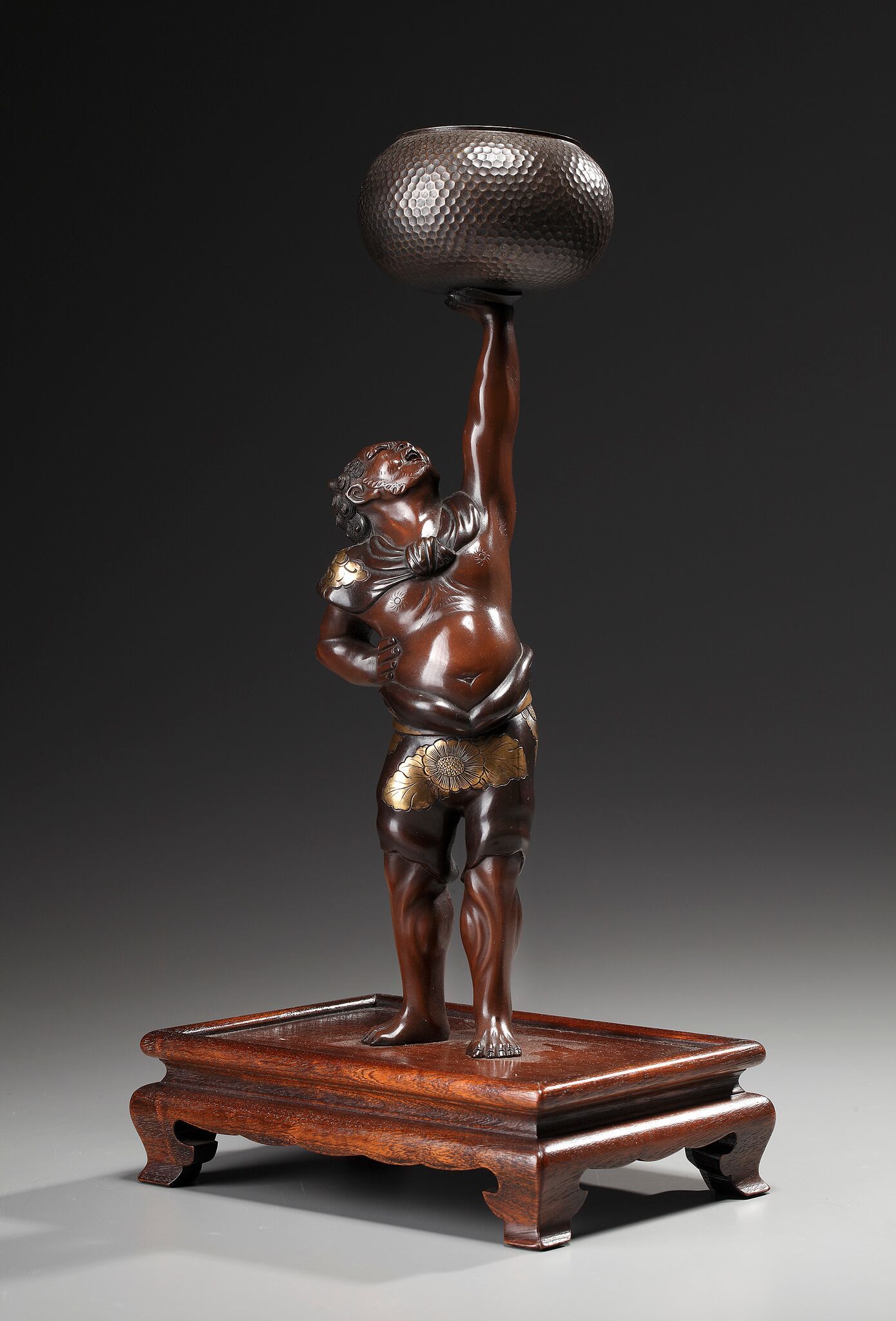 A fine bronze figure of Oni holding a large bowl above his head. Unidentified signature to the back of the upper leg.