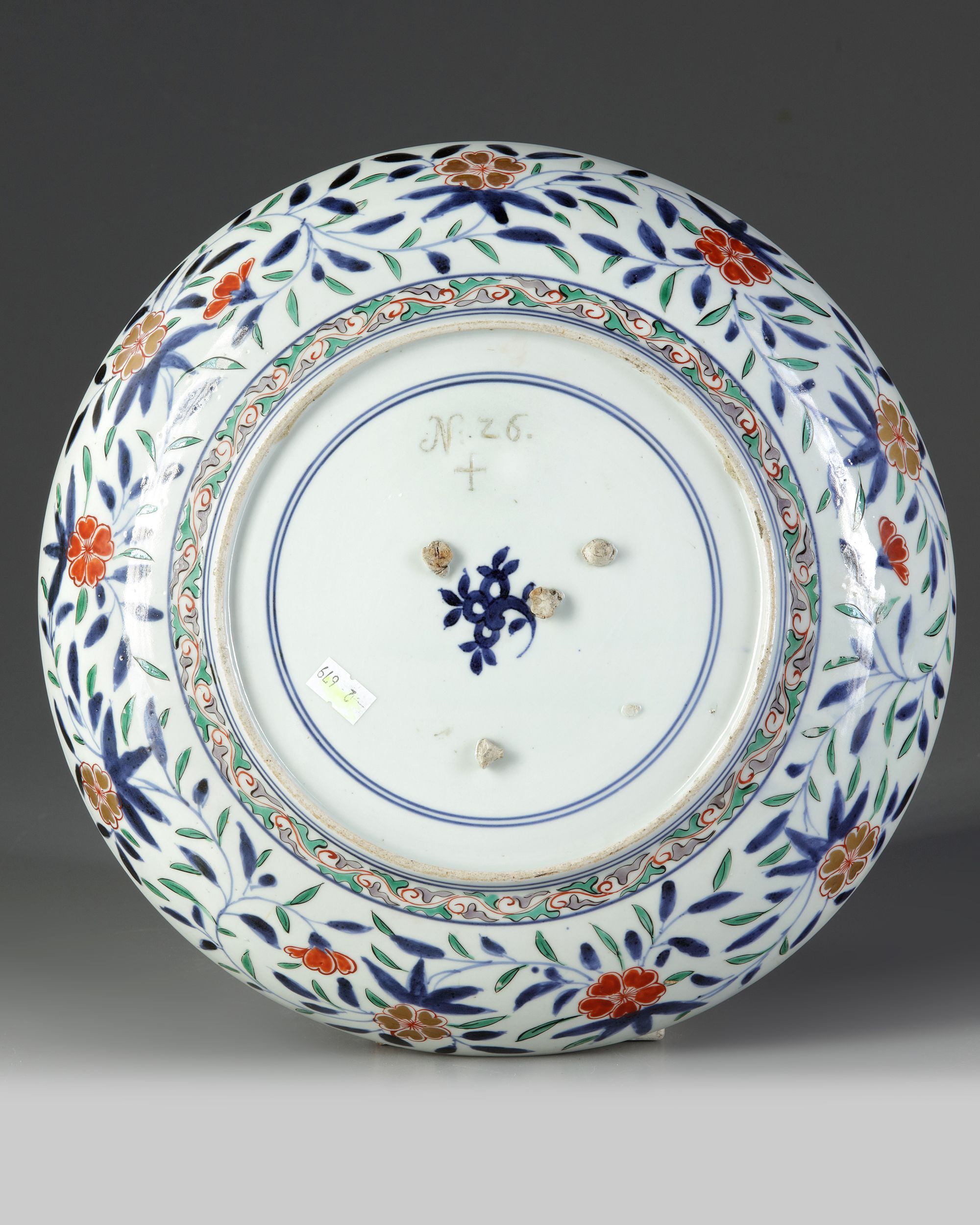 A vibrant coloured Japanese Imari dish from the collection of the Augustus the Strong, Elector of Saxony and King of Poland (1670 - 1733). Centrally depicting encircled branches of blossoming flowers by three cartouches divided by more flowers. The base is marked with the inventory number N: 26. +.The symbol + was to denote Japanese porcelain in the inventories.