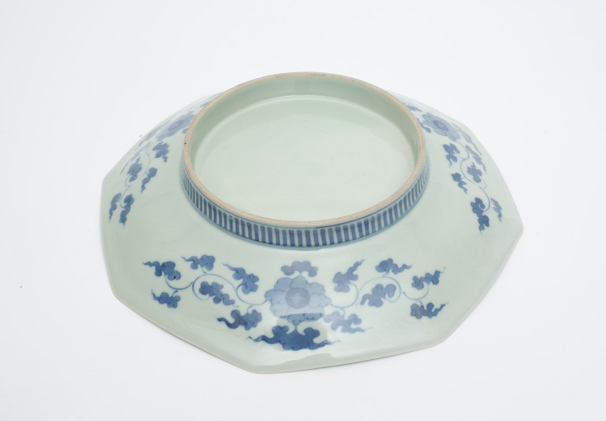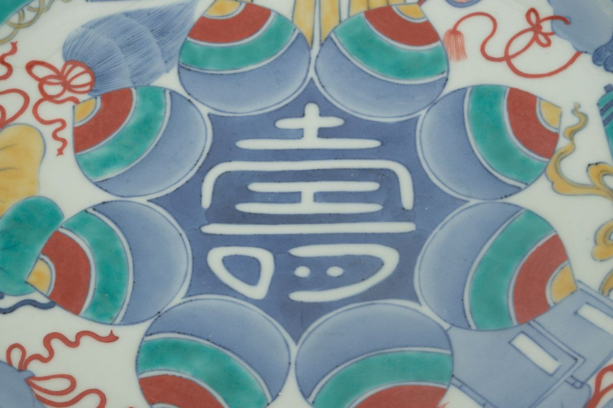 Octogonal polychrome-ware Nabeshima so-called “one feet” plate decorated with auspicious treasures, in the middle the character kotobuki (Long life, also: 'congratulations') surrounded by colourful ‘wishing pearls (cintamani)’; its footring is decorated with the characteristic blue comb pattern. 19th century. A similar but older plate is illustrated in: “Les cadeaux au shogun – porcelaine precieuse des seigneurs de Nabeshima”. Asahi shimbun, 1997 p.126 (the book of the Nabeshima Exhibition in Paris in 1997-1998).