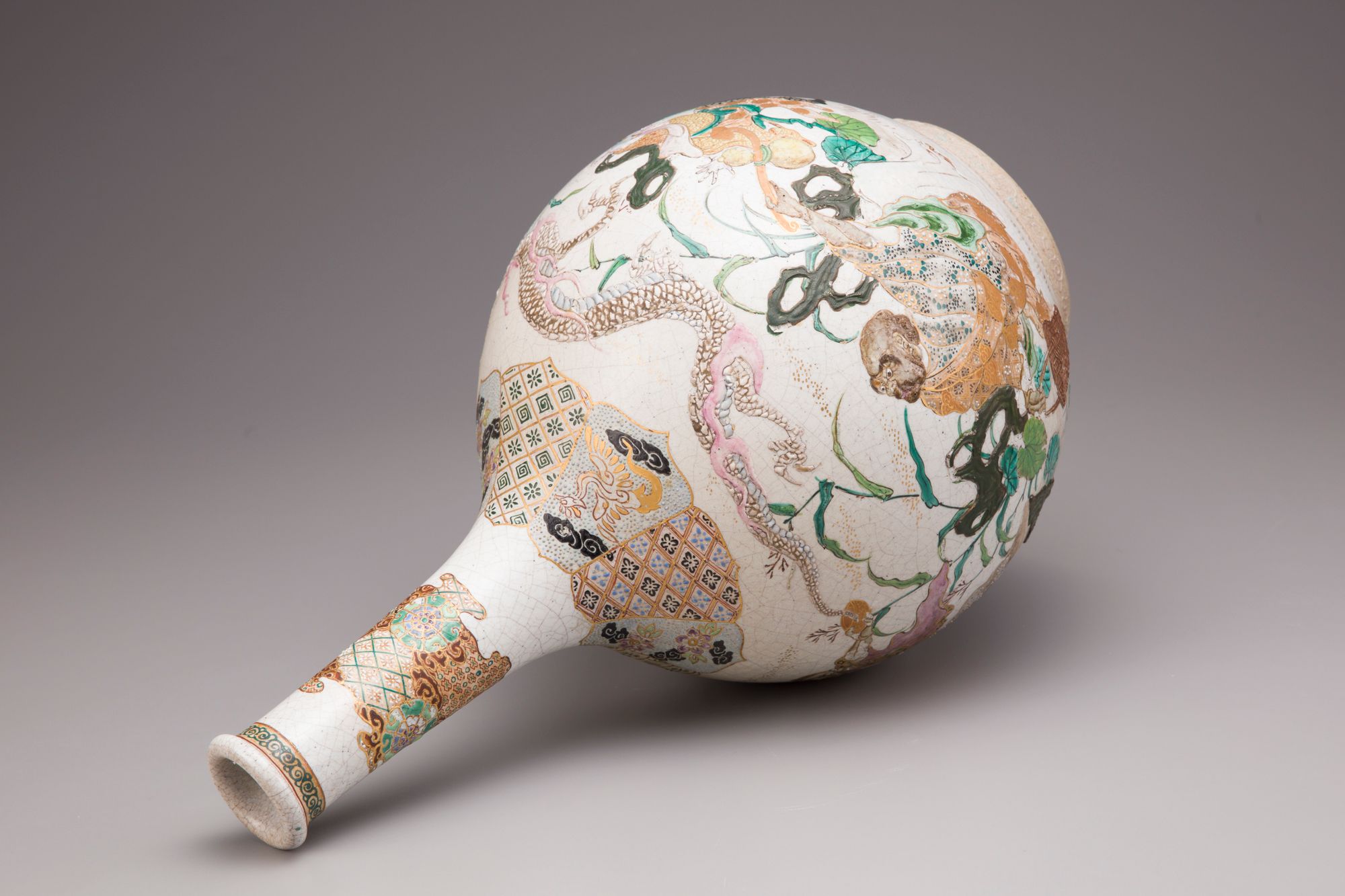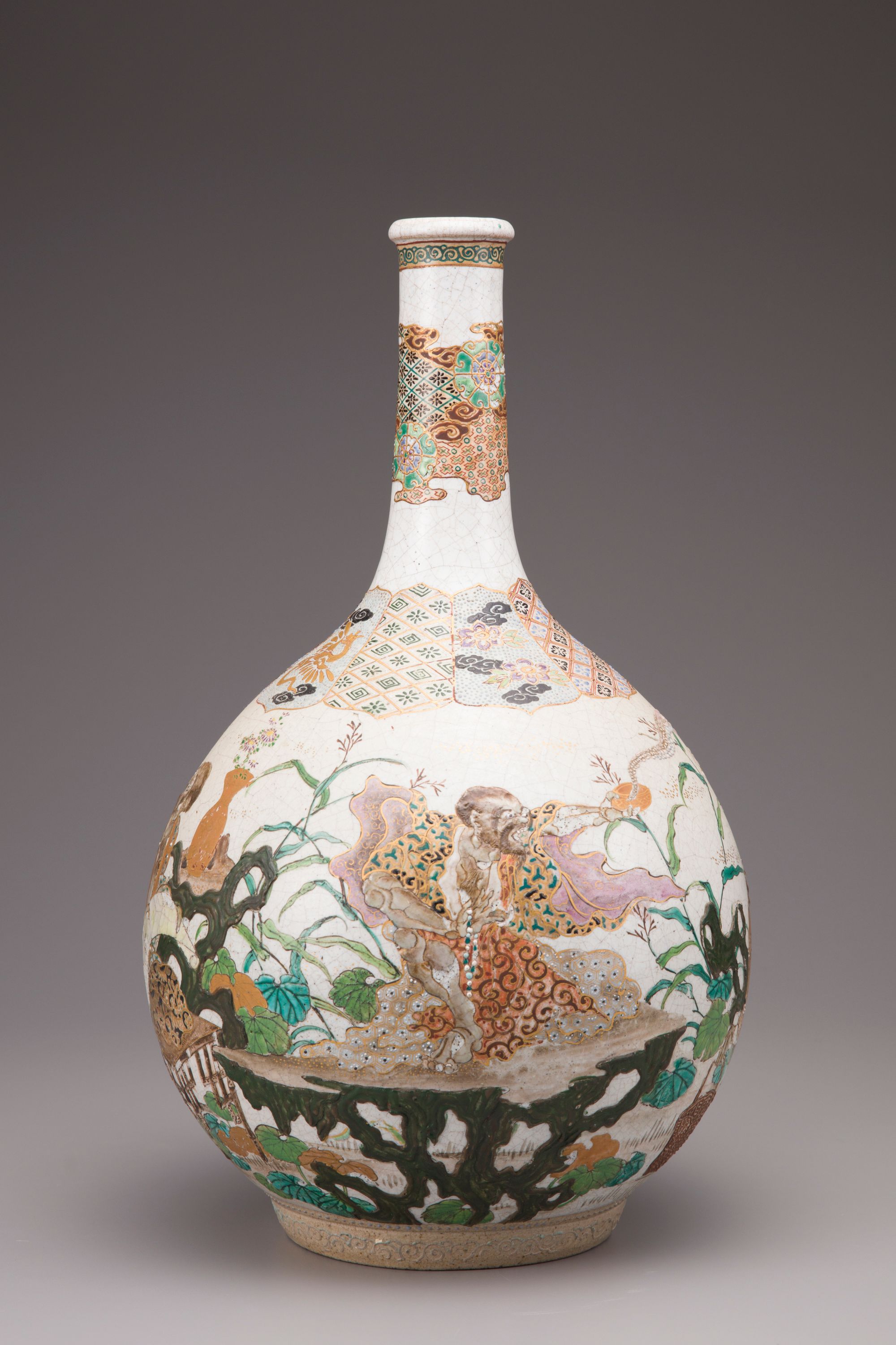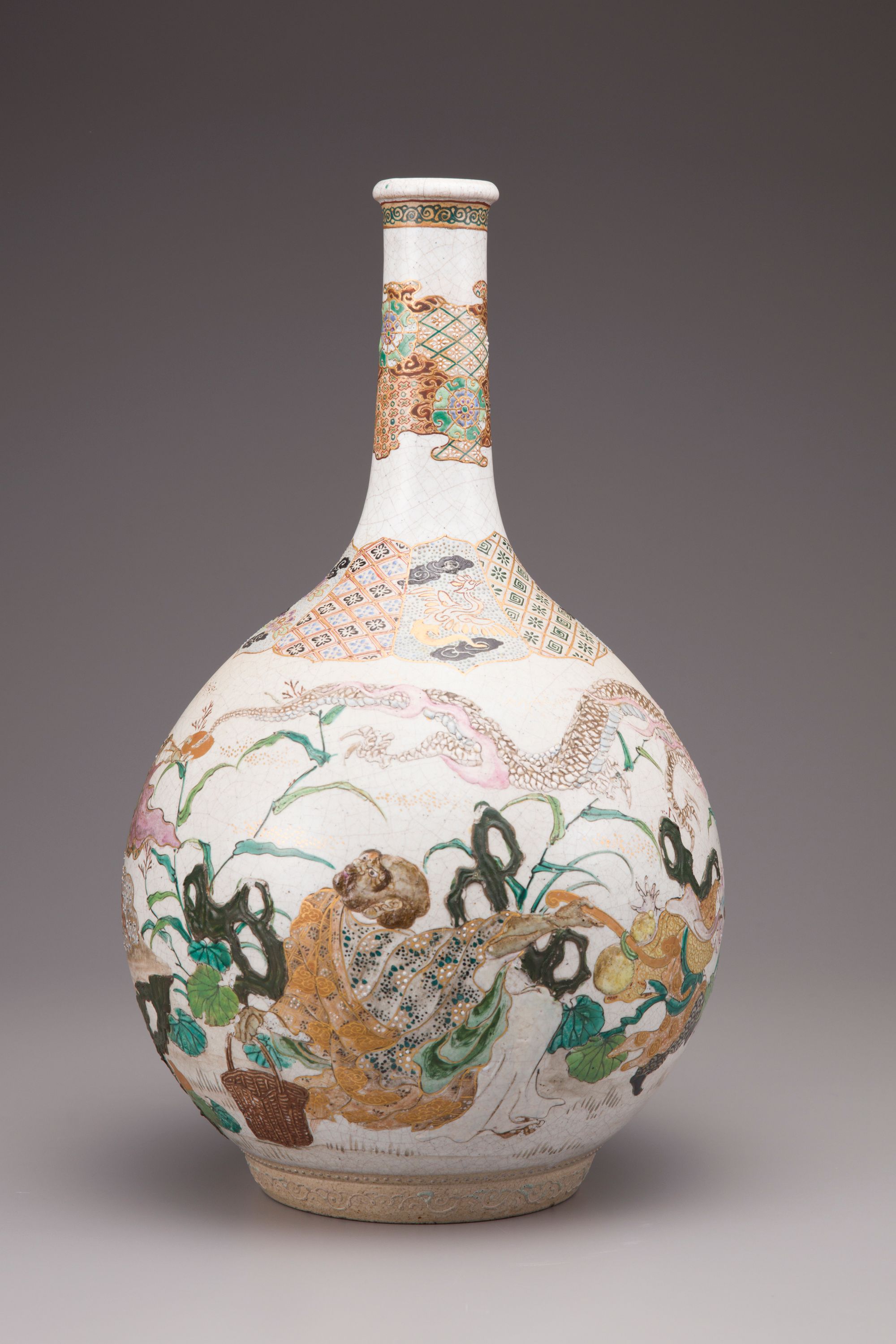 Pear-shaped bottle on footring with long cylindrical neck ending in a splayed mouth with overturned rim, the body decorated with a continuous scene depicting Sages sitting in a garden, one Sage releasing a dragon from a bowl, the neck and shoulder decorated with a band of connecting panels, decorated with phoenix, floral and geometric shapes.
