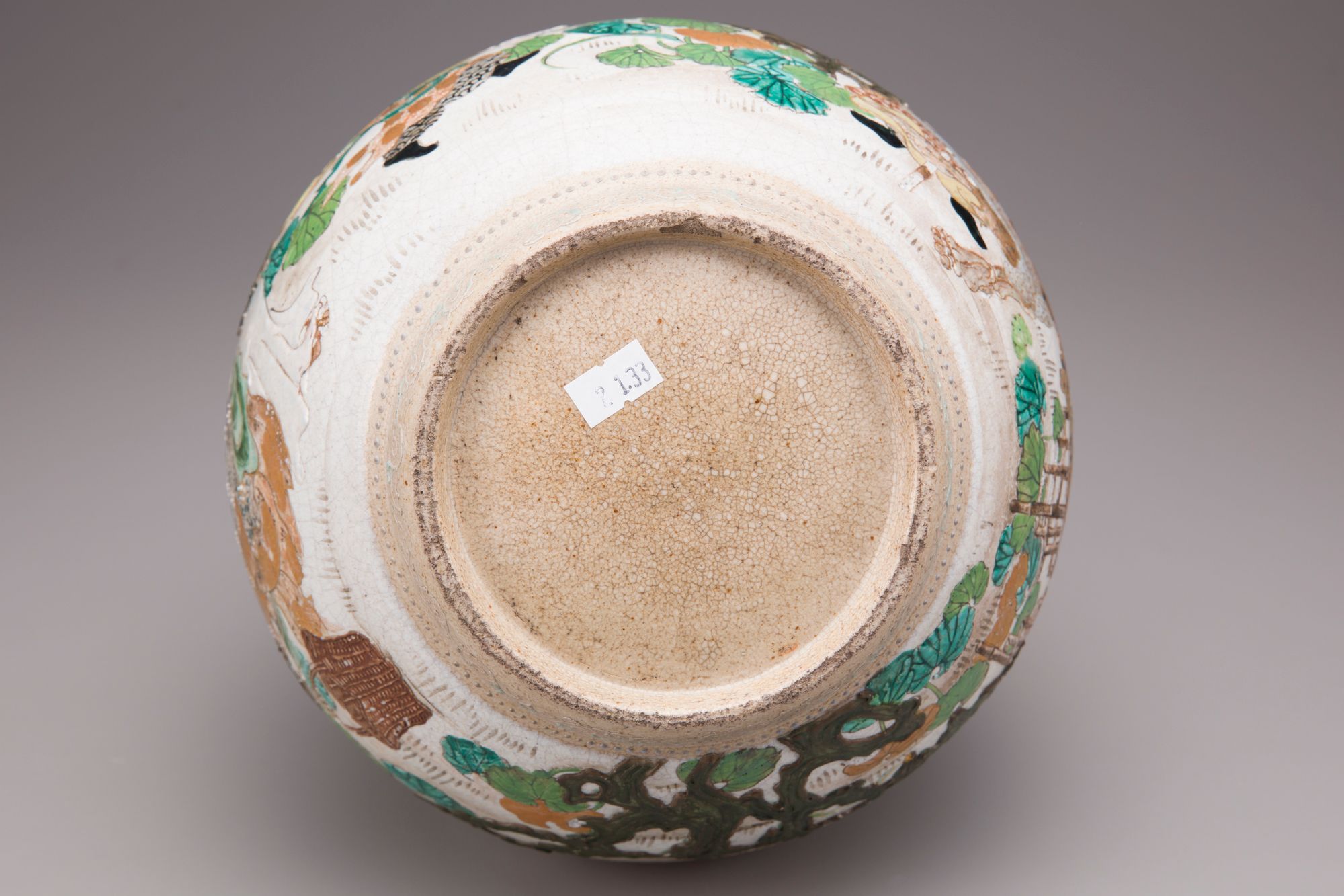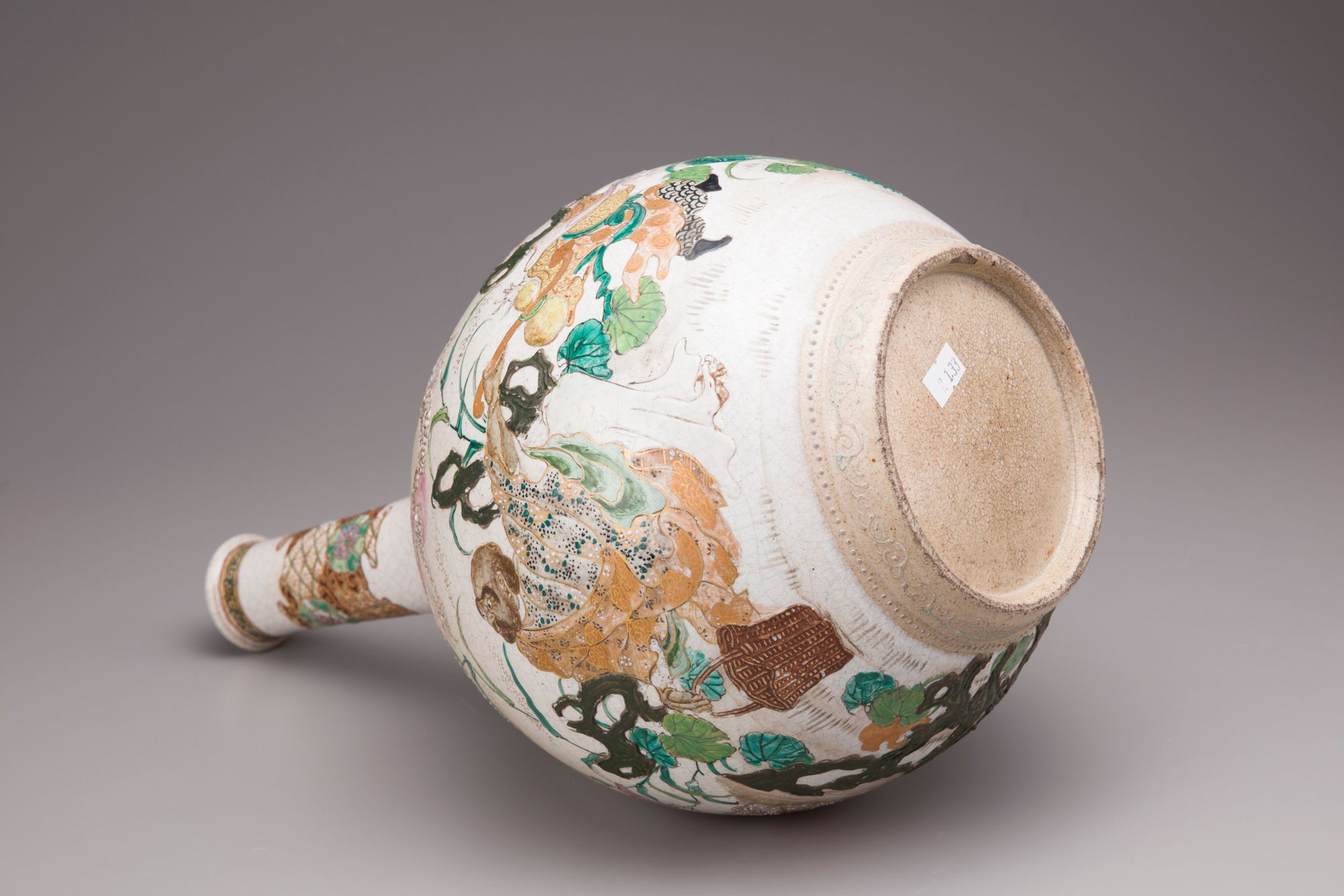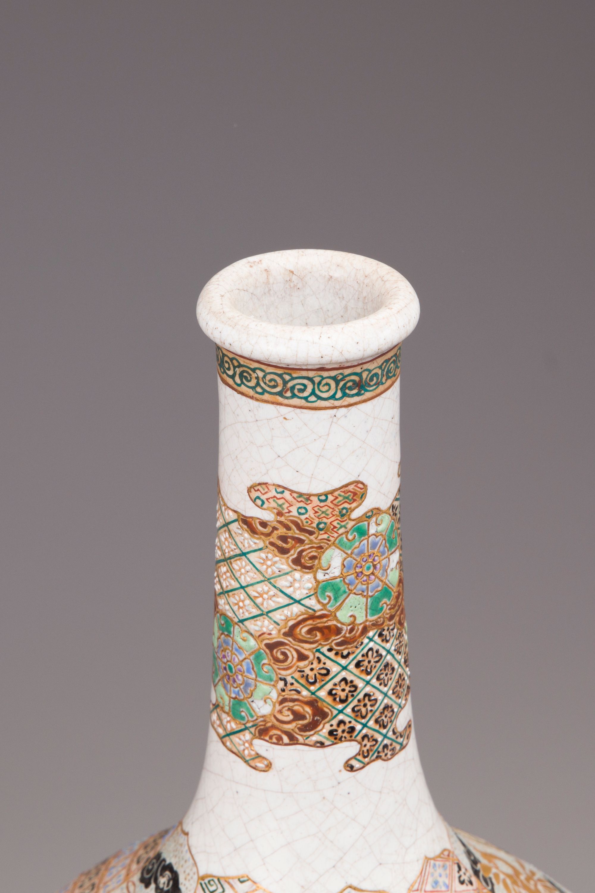 Pear-shaped bottle on footring with long cylindrical neck ending in a splayed mouth with overturned rim, the body decorated with a continuous scene depicting Sages sitting in a garden, one Sage releasing a dragon from a bowl, the neck and shoulder decorated with a band of connecting panels, decorated with phoenix, floral and geometric shapes.