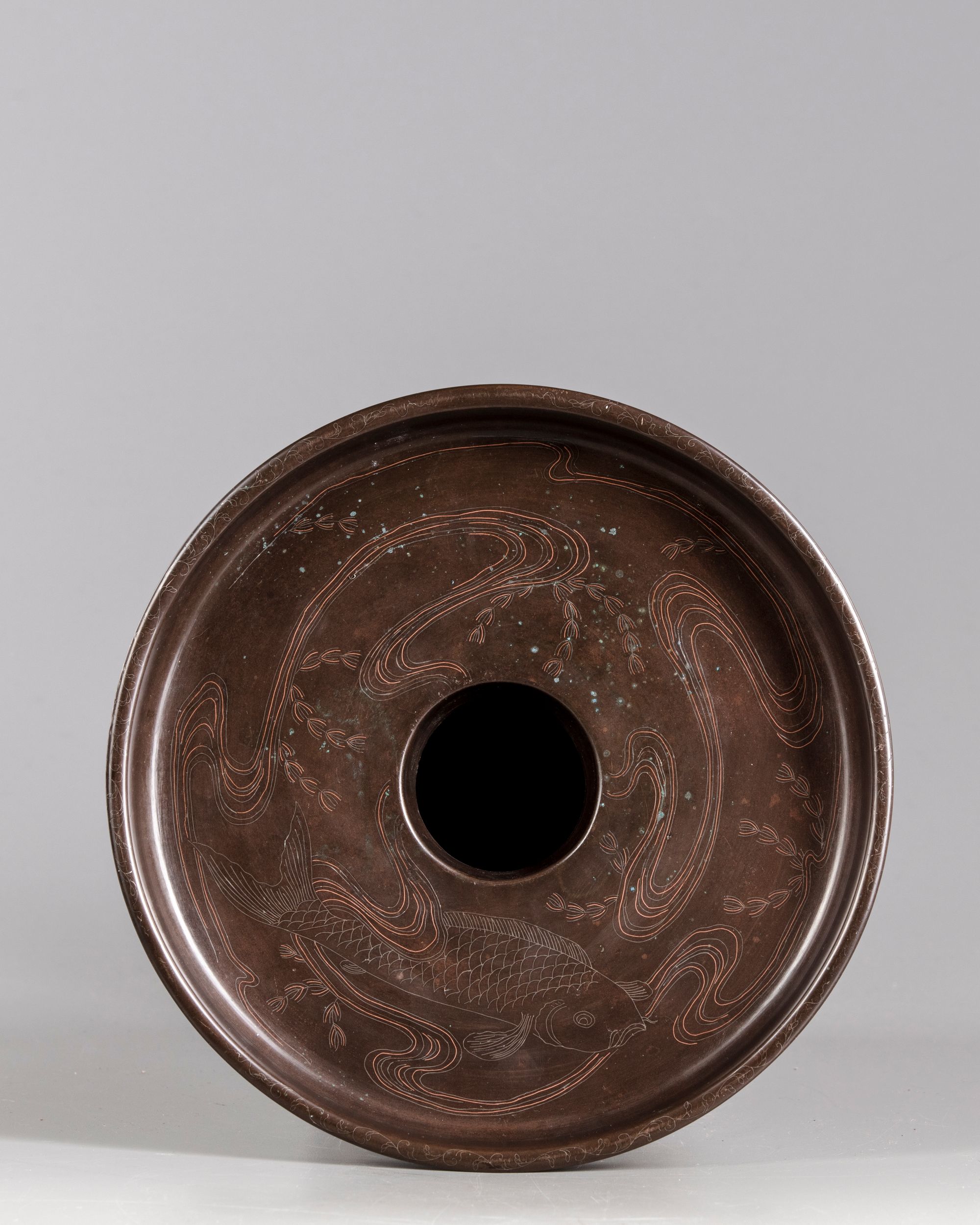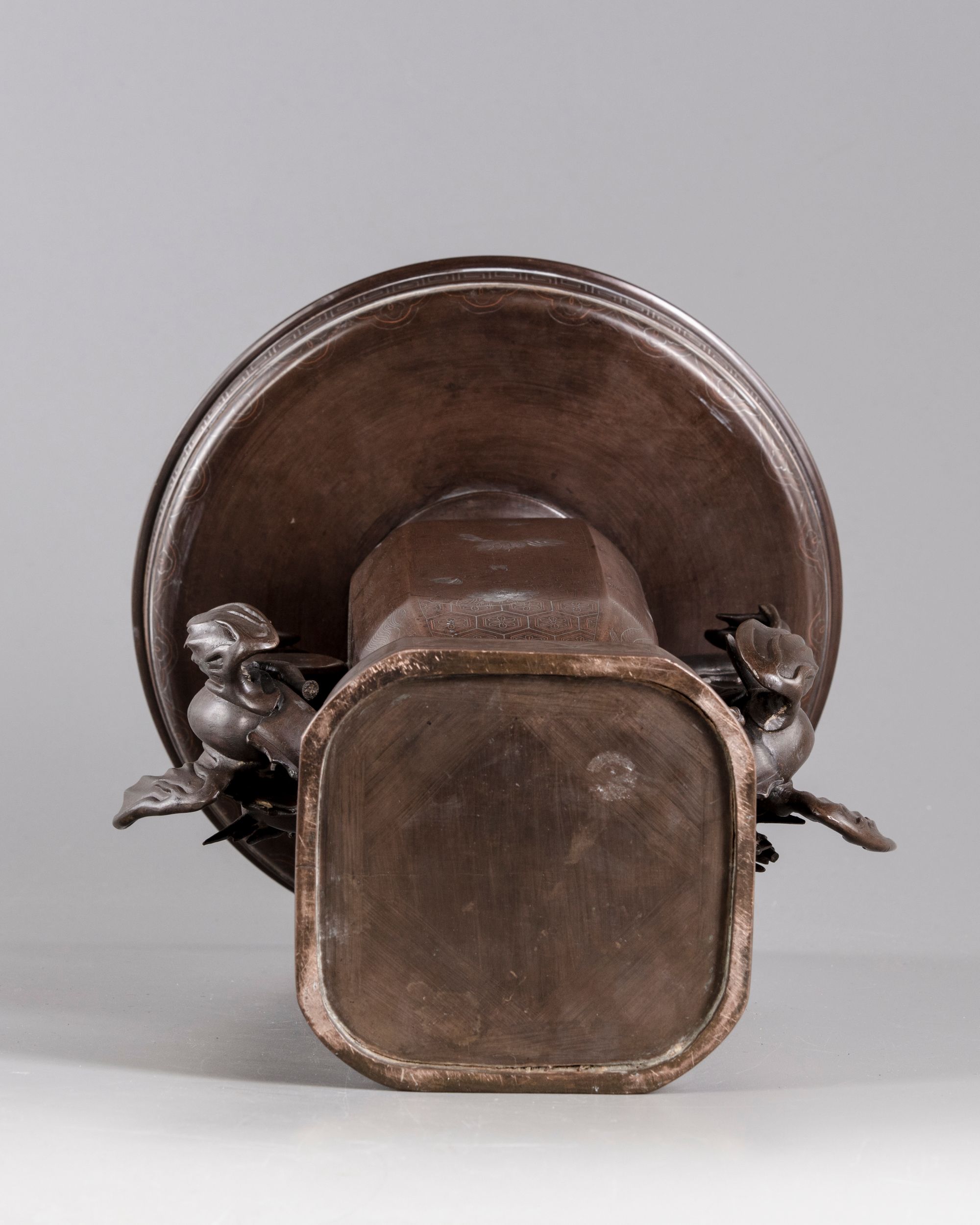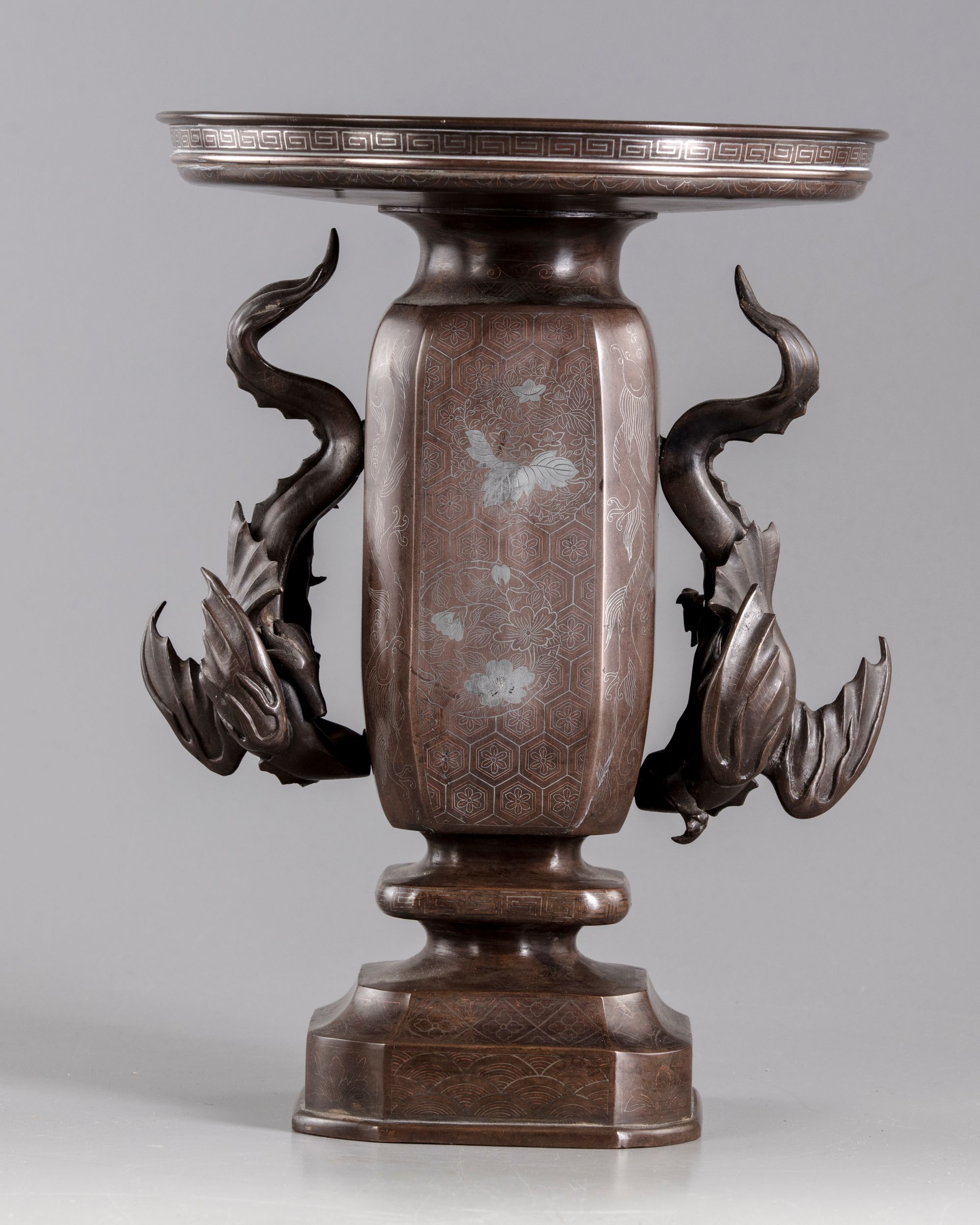 A Japanese bronze vase, stylised with dragon shaped handles and engraved with silver inlaid insect flying over flowering branches.