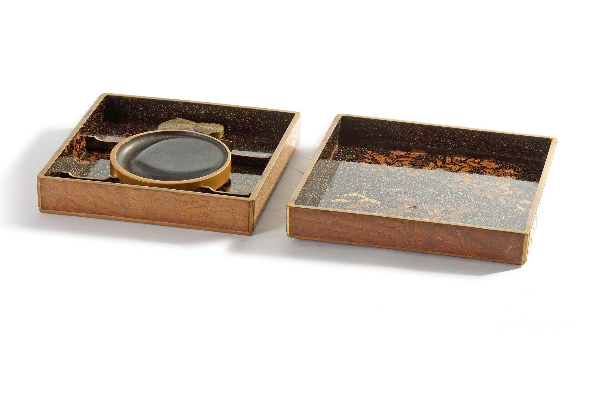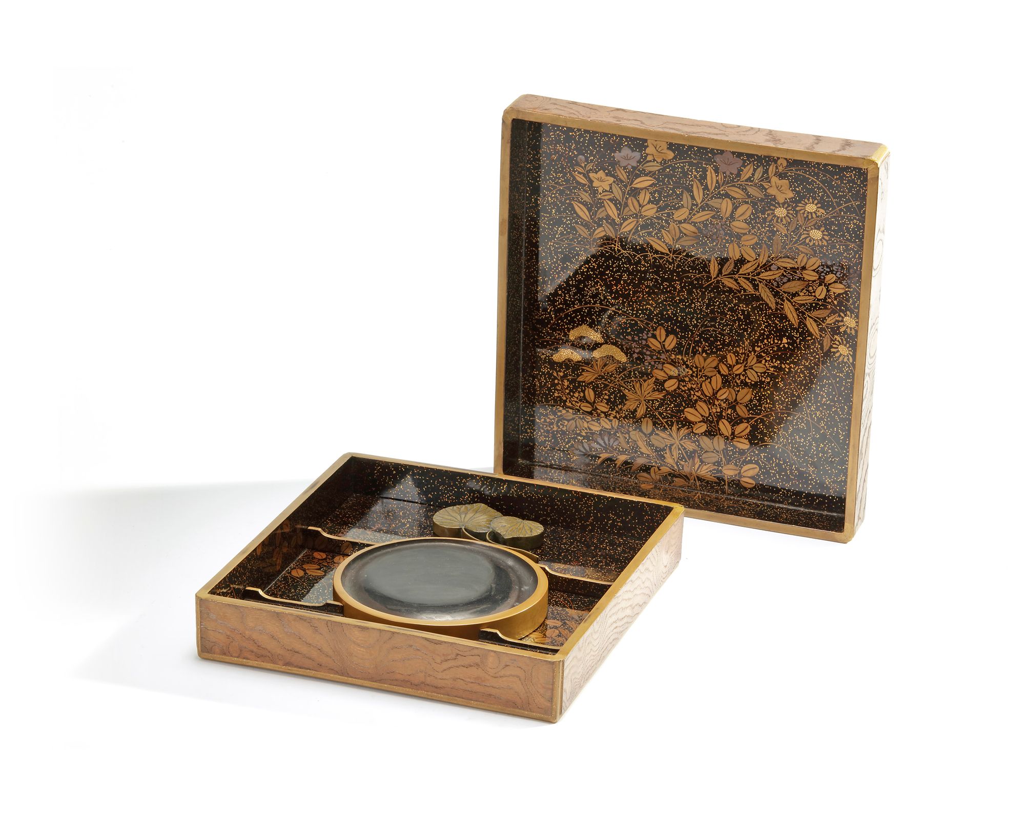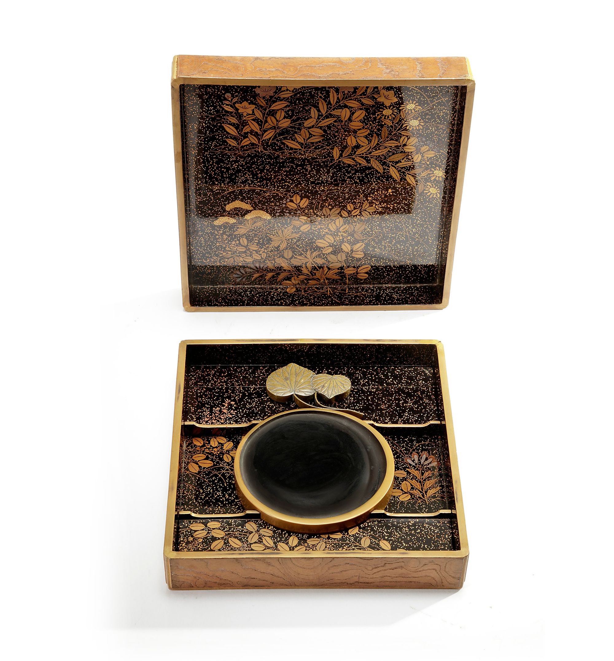 The outside of the box with lacquered brown wood, depicting a landscape. The inside of the box decorated with a gilt flower pattern.