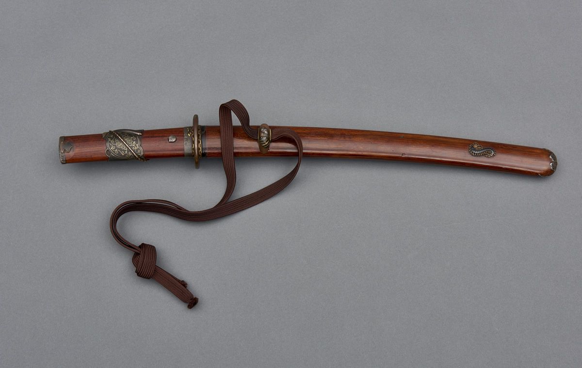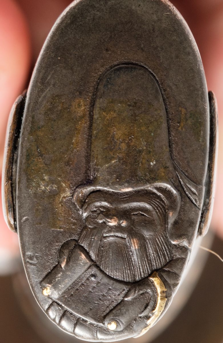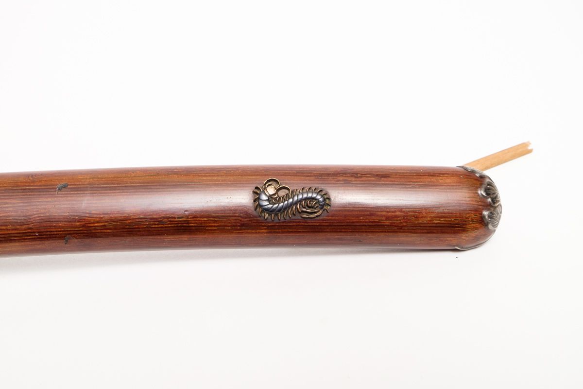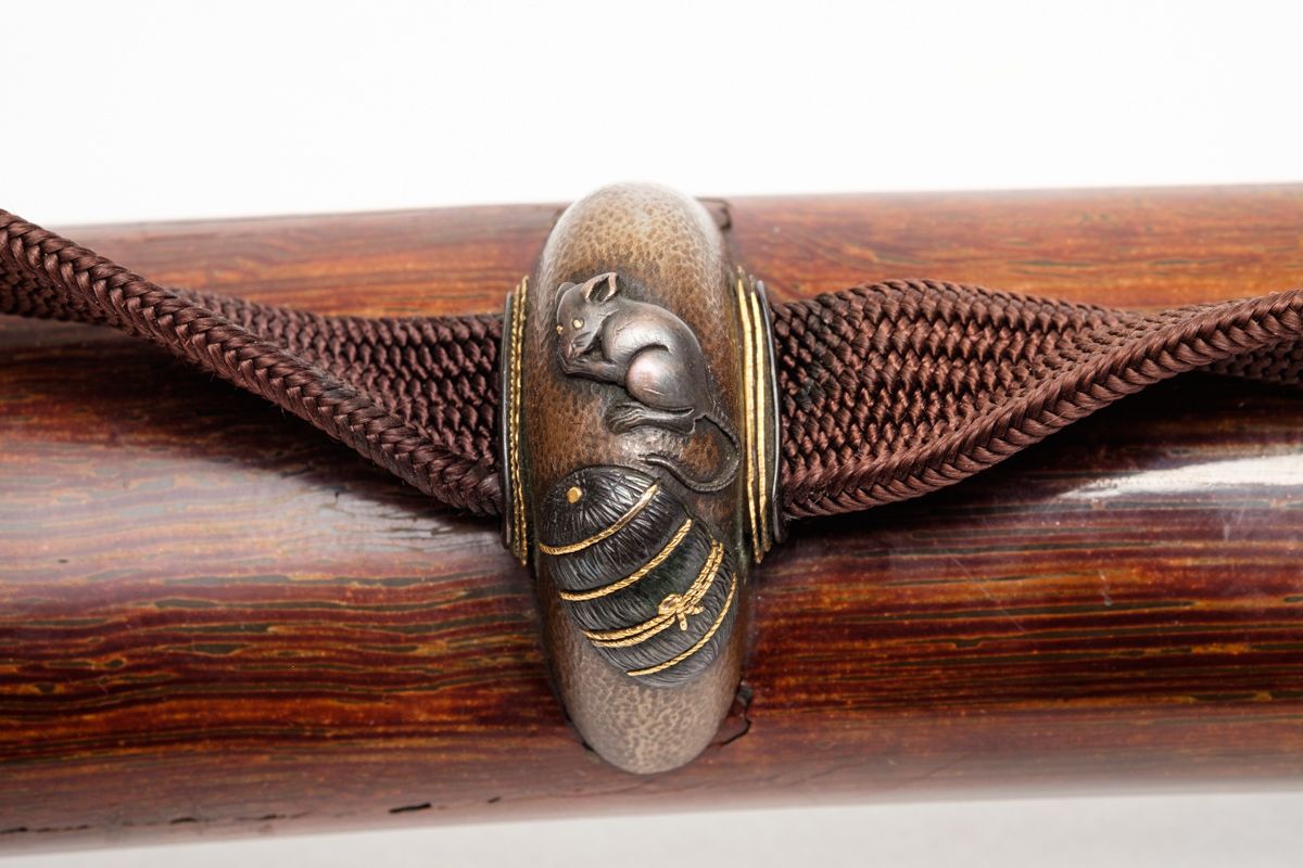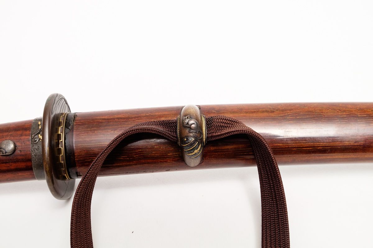 Mounting (Koshirae): Custom unique mounting. Fittings on handle (Fuchigashira): made from Shibuichi (copper and silver alloy) Jurojin (one of 7 lucky gods) design. Handle fitting (Tsuka-kanagu, mekugi): Gold inlay on Shibuichi. Menuki combined with Mukugi: made from Shakudo, Dragon ball design, it is left handed screw that is original Japanese style before 19th century. Tsuba : made from Shibuichi, Hote-son (one of 7 lucky gods/Shichifukujin) design. Kurigata: made from Copper (Suaka), Mouse with rice bag (Komedawara). Ornament on Saya (Sya-kanagu): made from Shakudo (copper and gold alloy) Centipede design. Fitting on the bottom of Saya (Kojiri): made from silver, paulownia leaf design. Kozuka (handle of small knife): made from copper, centipede design. Kogatana (small knife): signed Taira Nobuhide (....-....). Unique original mounting in good condition, late Edo period, 19th Century with Muromachi period blade (late 16th Century).