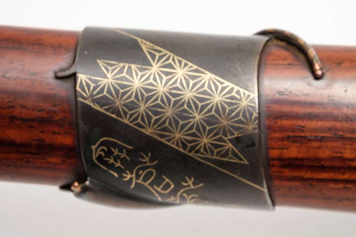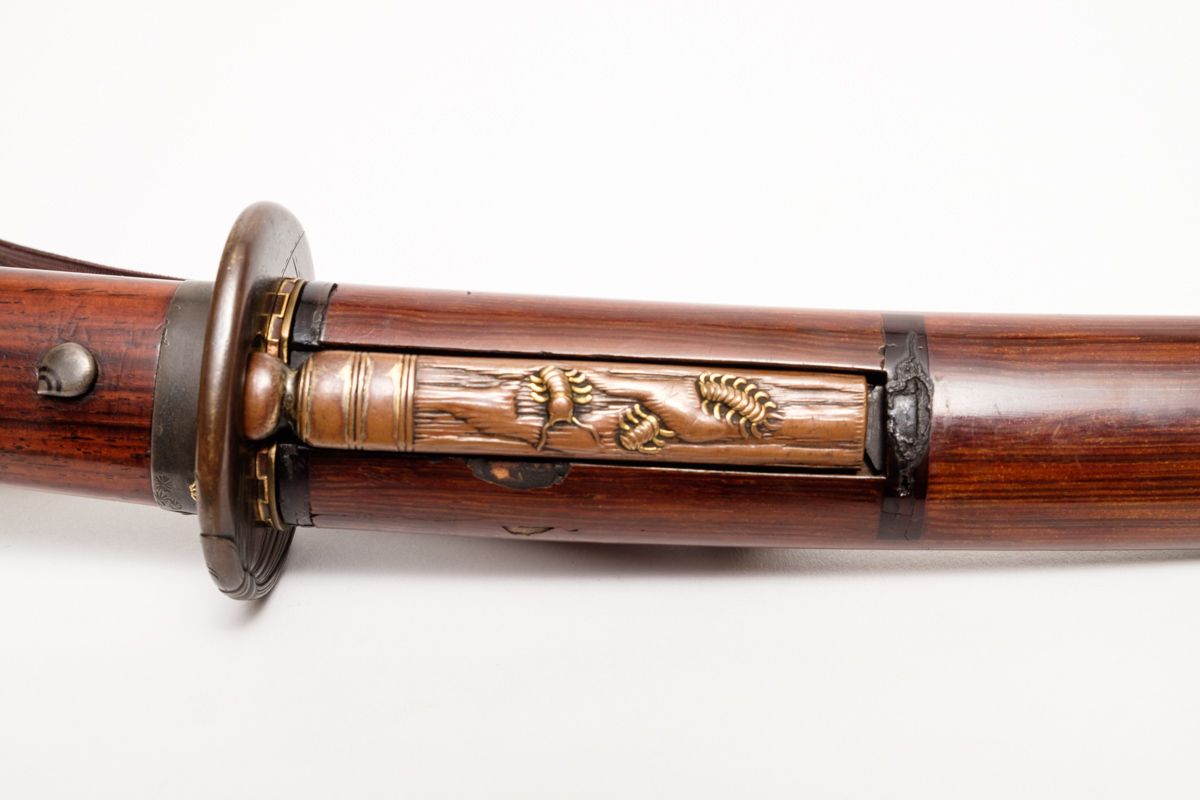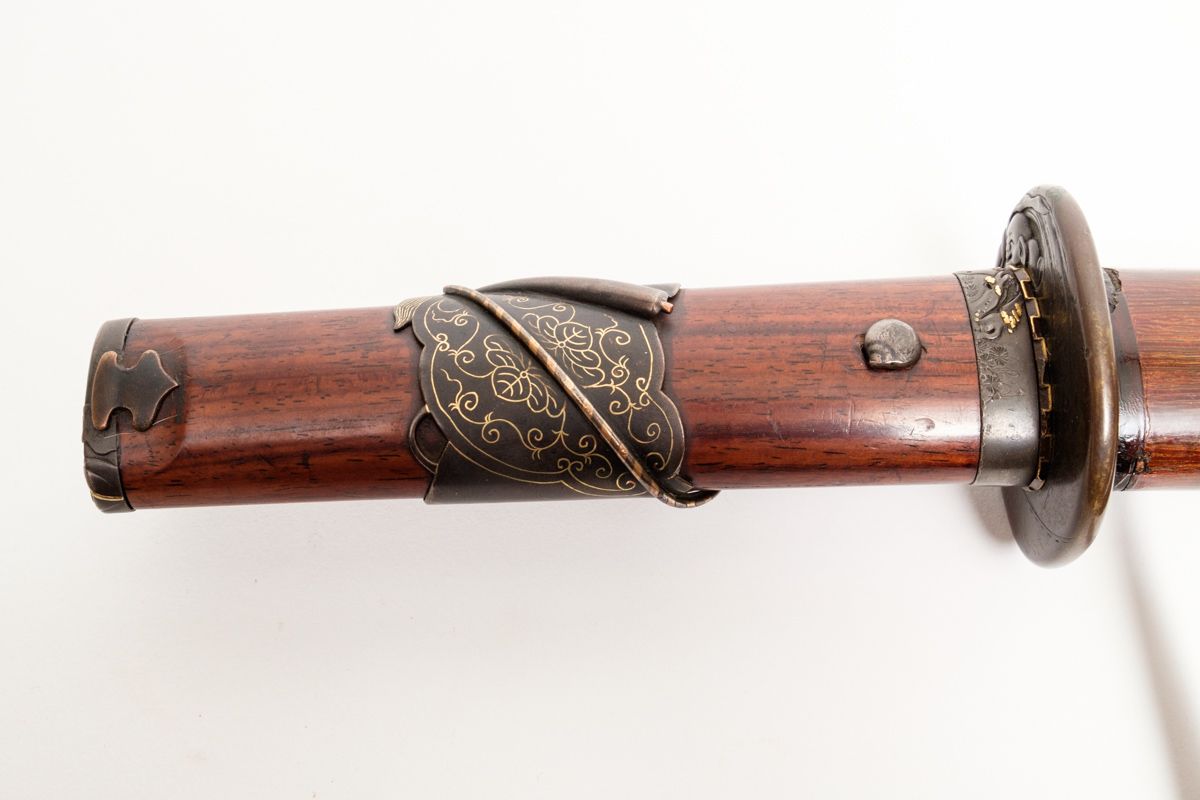 Habaki (metal collar encircling the base of the blade): Double shaudo and gold Habaki.