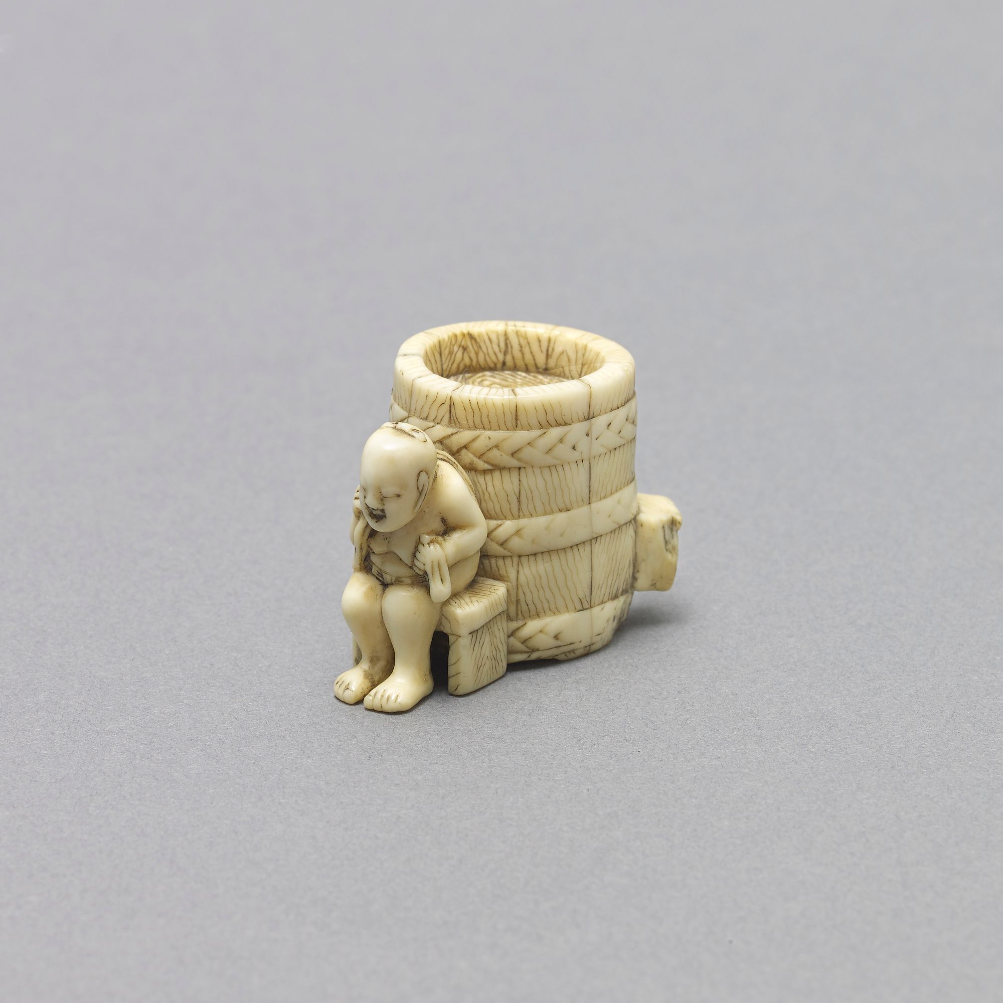 A woman of a certain age sits on a stool beside a giant wood tub, drying herself with a towel Unsigned. Circa 1800-1820