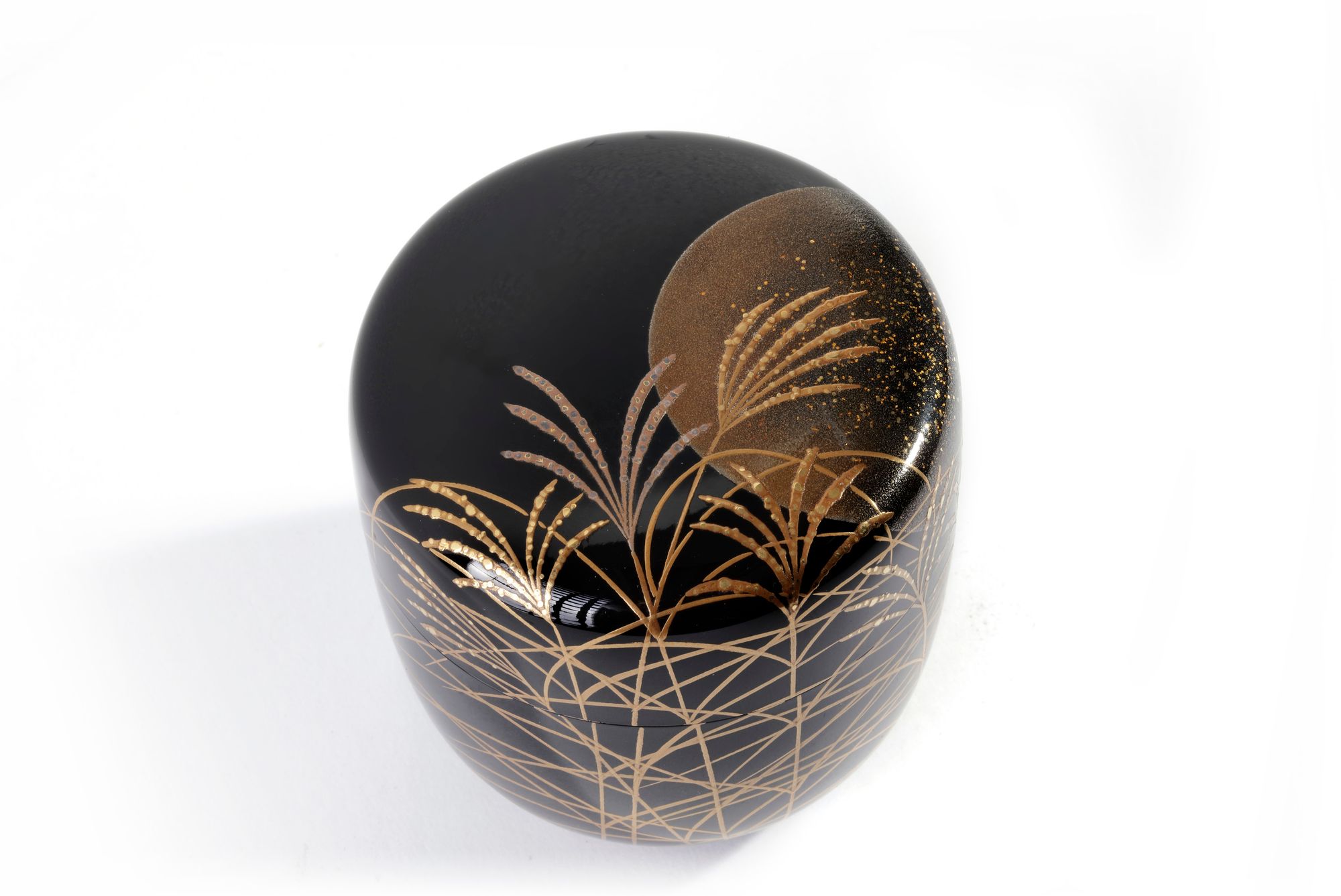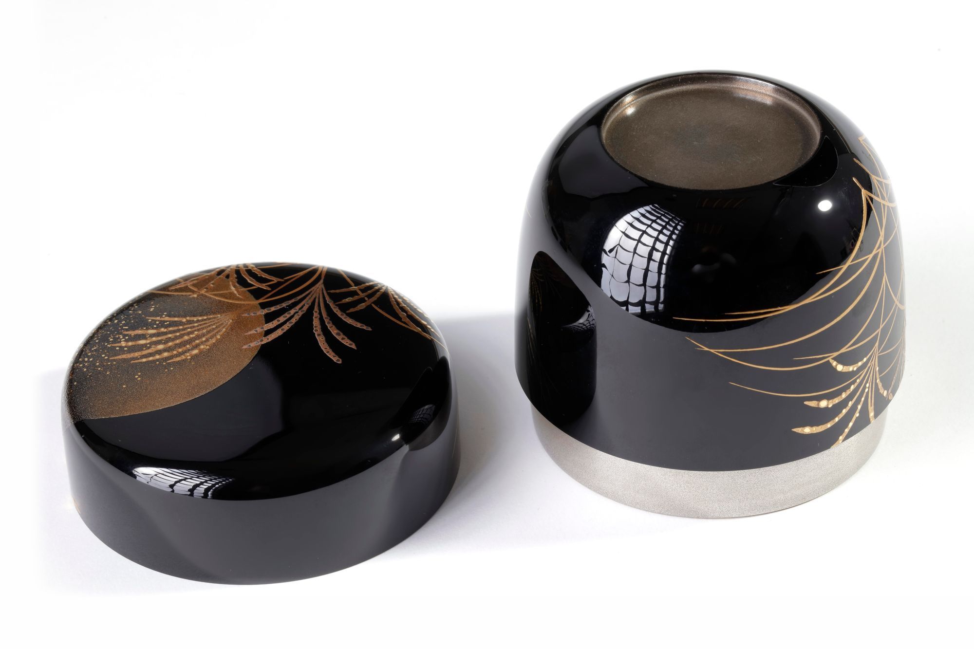 A Japanese Gold Lacquered wooden Tea Caddy with box, decorated with a maki pattern of autumn grasse.