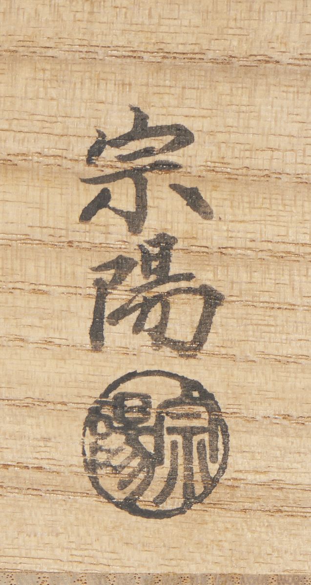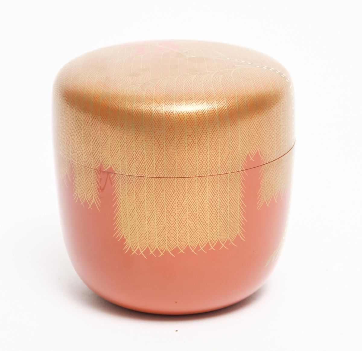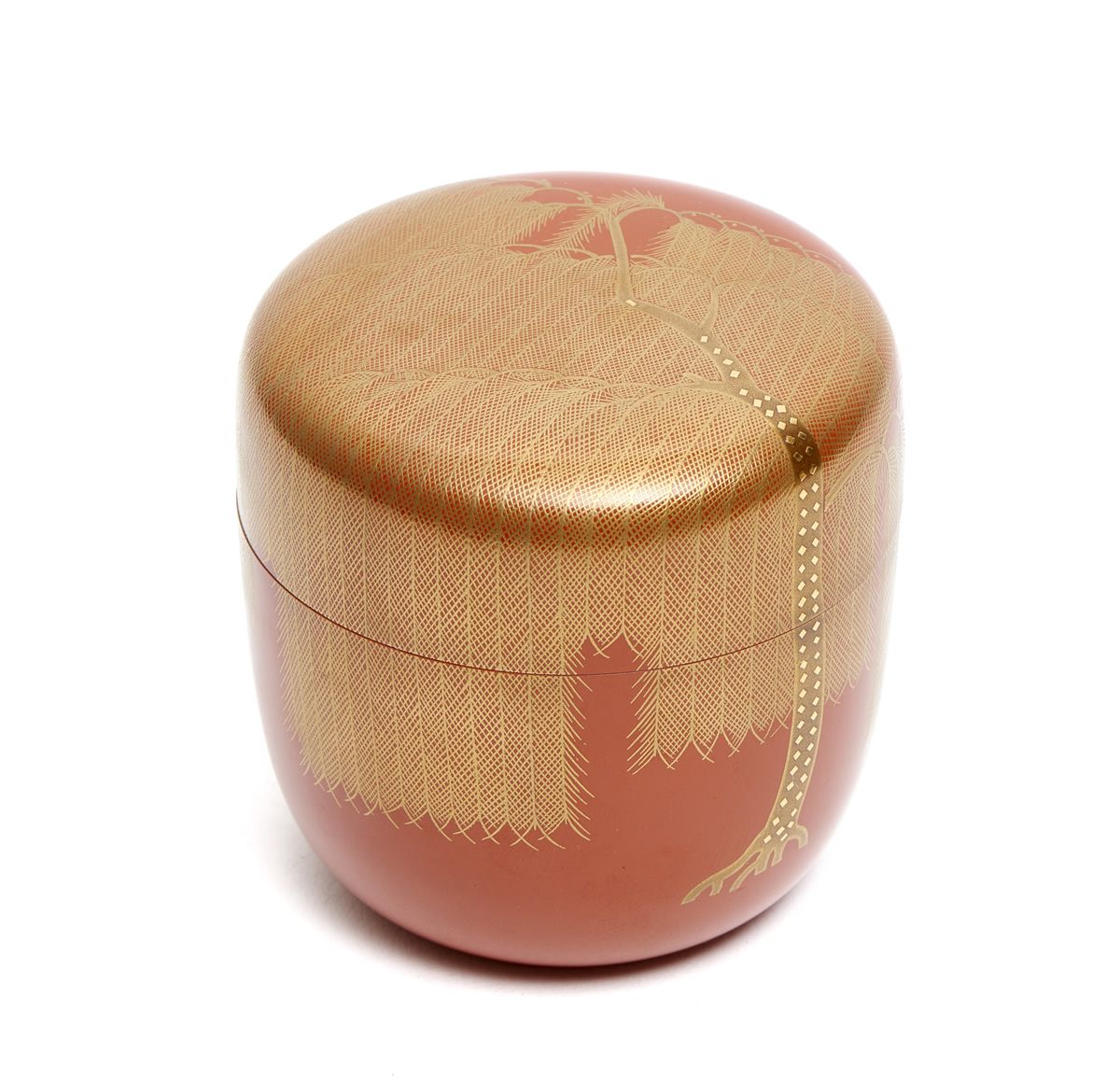 Red lacquered tea caddy (natsume) with a gold maki-e lacquer design of a weeping willow tree by Yamagake Sōyō. In original box signed: Sōyō. Inside gold lacquered.