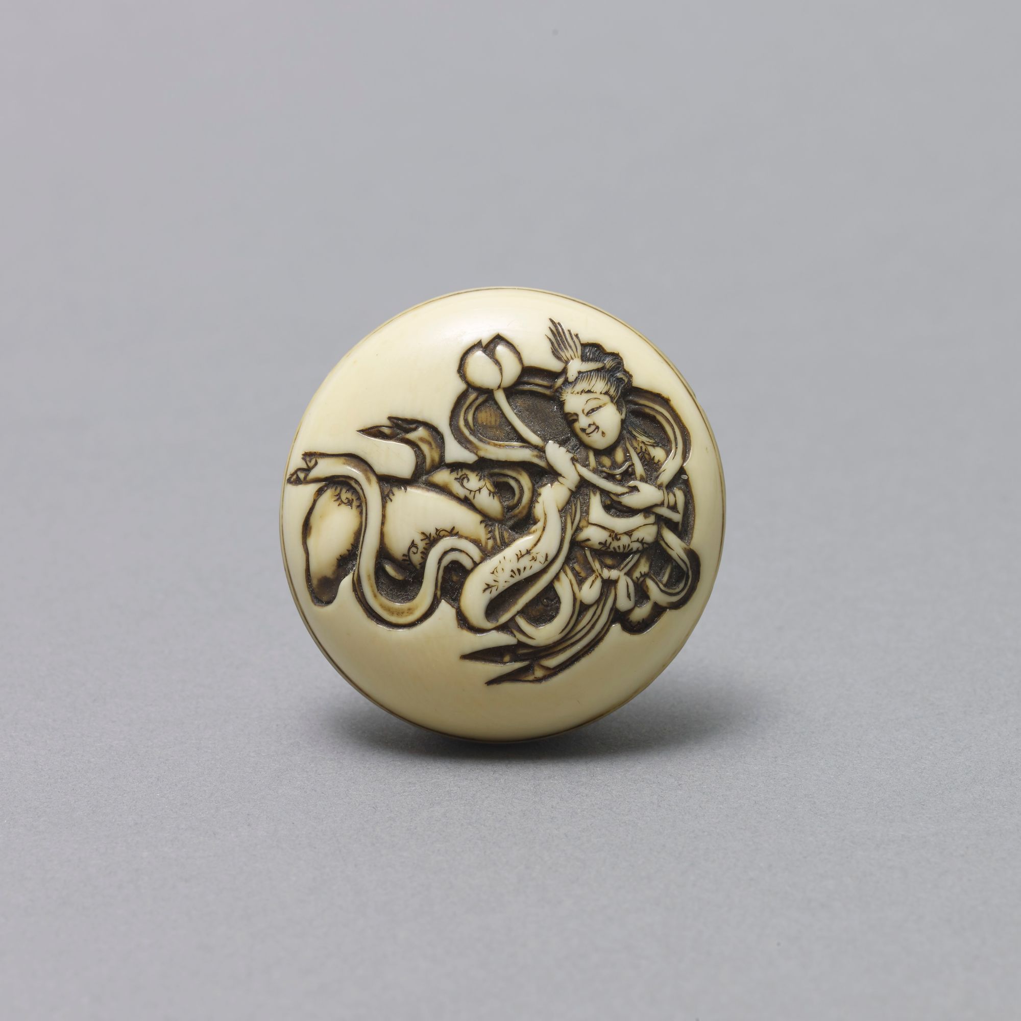 The flying tennin holding a lotus stem with bud in shishiaibori, the reverse similarly carved with a discarded drum and drum-sticks. Rich colour Signed Minkoku. Circa 1860