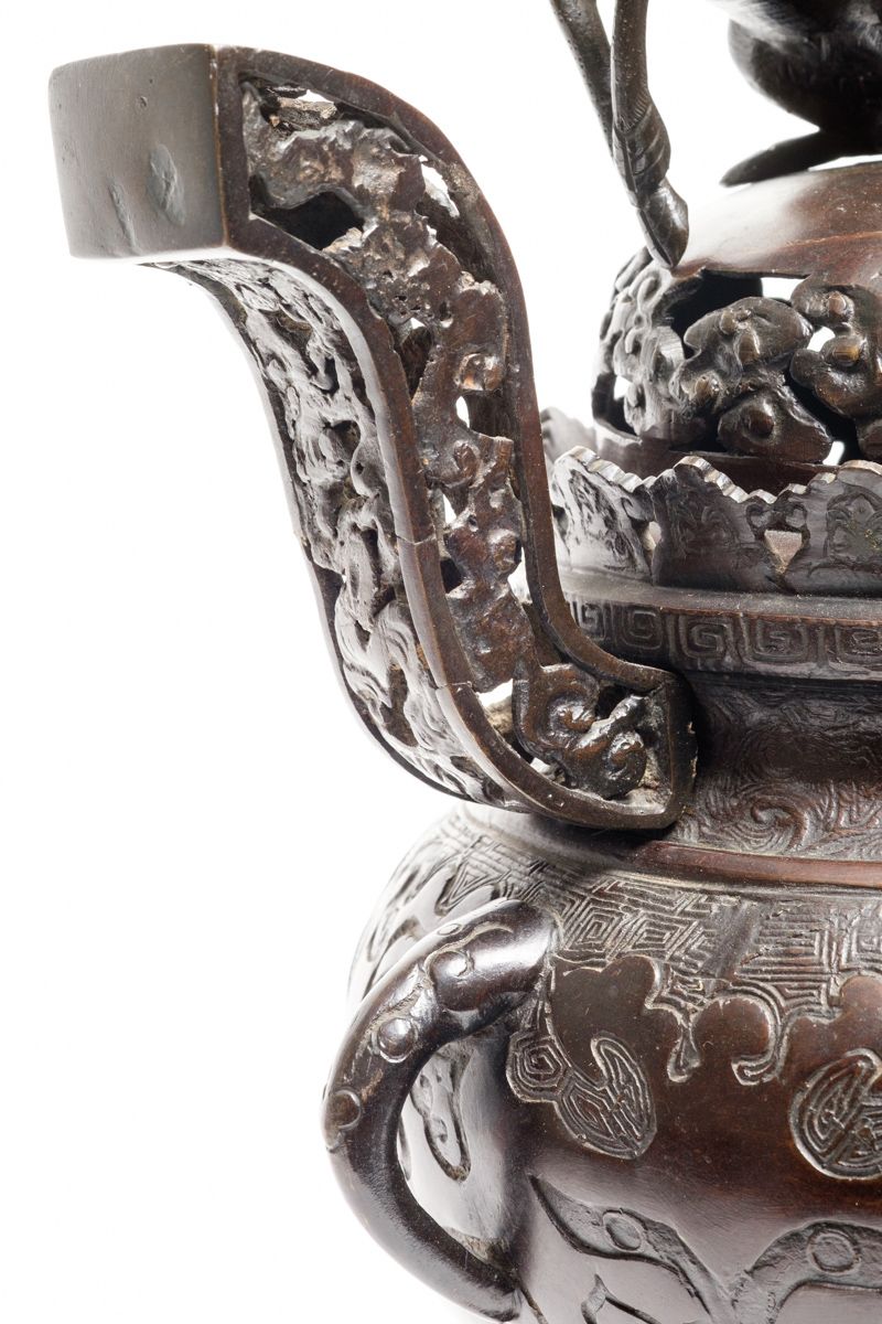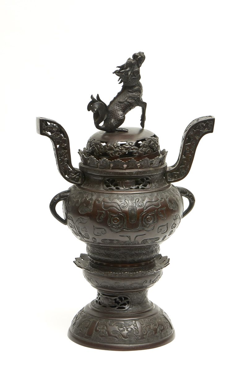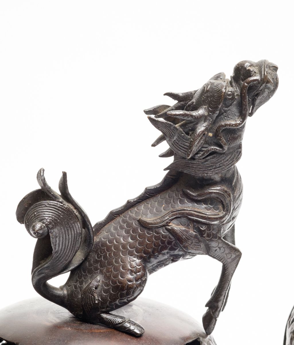 Large round three piece Chinese style bronze incense burner (koro) consisting of a round base that supports a round vessel for the incense with two large openwork handles covered with a lid crowned by an auspicious mythological kirin-figure (Chinese: qilin). The incense burner is all over decorated with kuei-dragons and taotie-masks in low relief. The round vessel has a bottom mark: Dainippon Kyoto No-zō, the mark of the Nomura workshop in Kyoto.