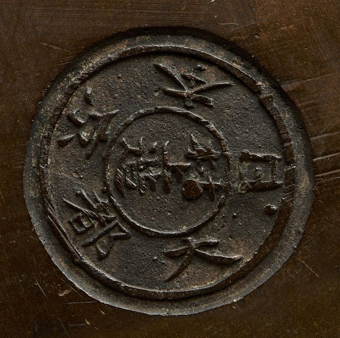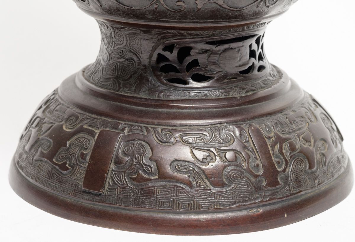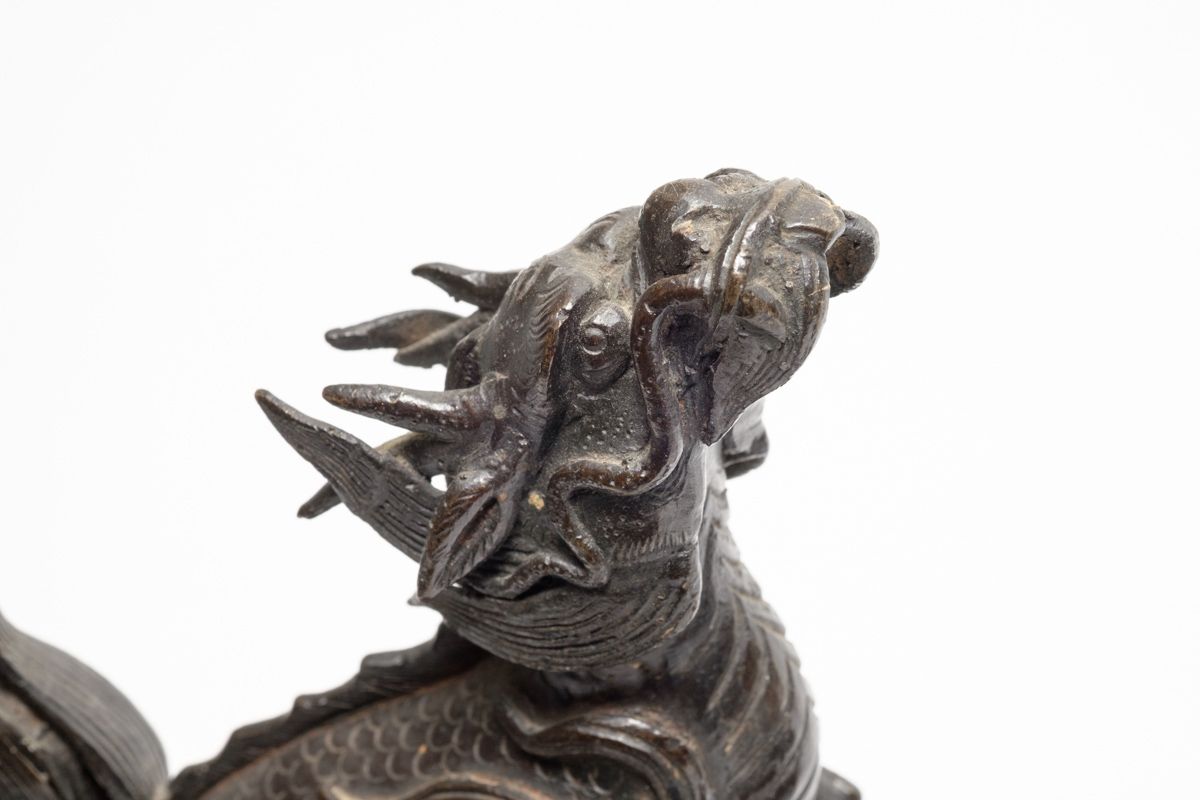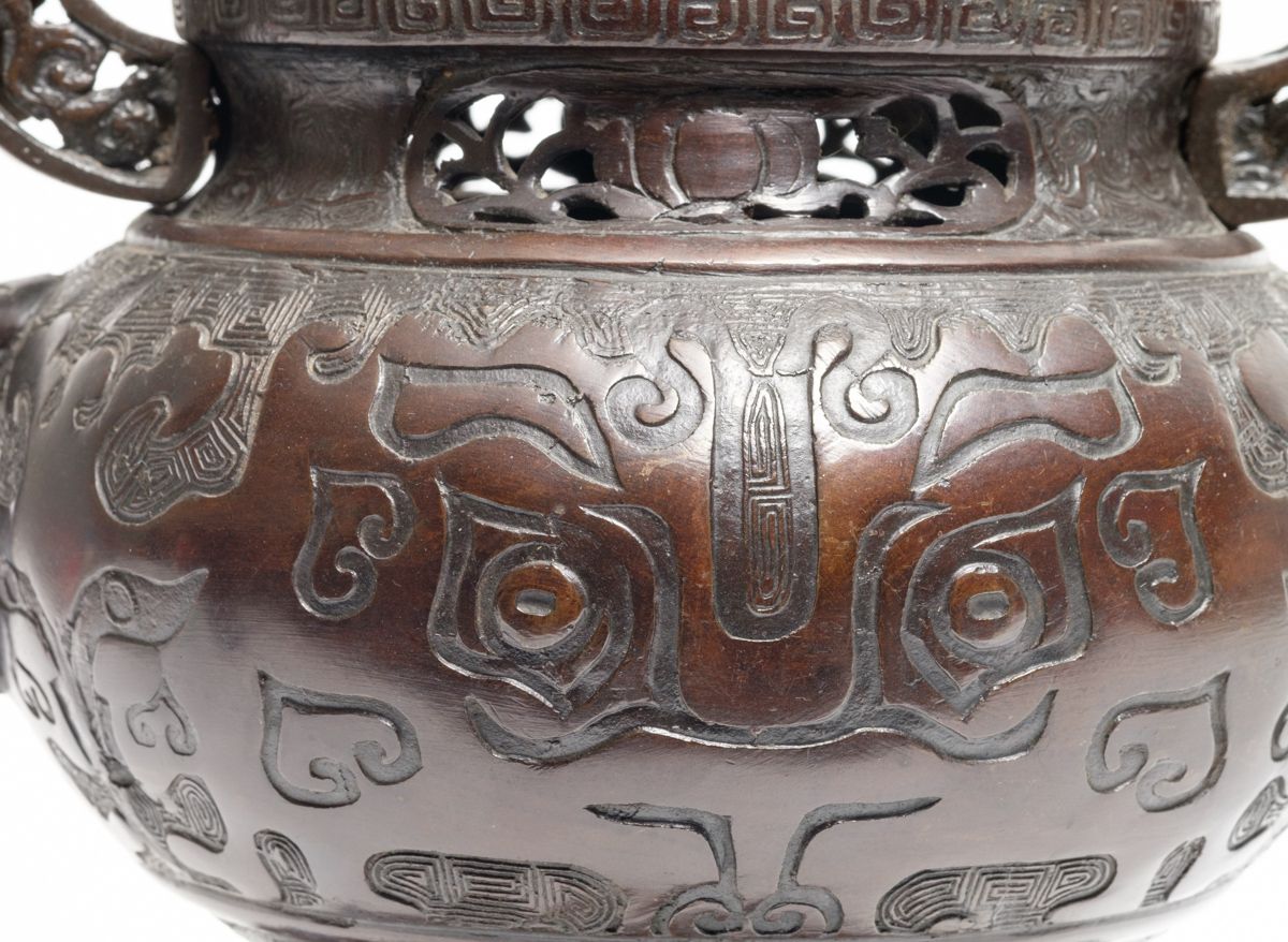 Large round three piece Chinese style bronze incense burner (koro) consisting of a round base that supports a round vessel for the incense with two large openwork handles covered with a lid crowned by an auspicious mythological kirin-figure (Chinese: qilin). The incense burner is all over decorated with kuei-dragons and taotie-masks in low relief. The round vessel has a bottom mark: Dainippon Kyoto No-zō, the mark of the Nomura workshop in Kyoto.