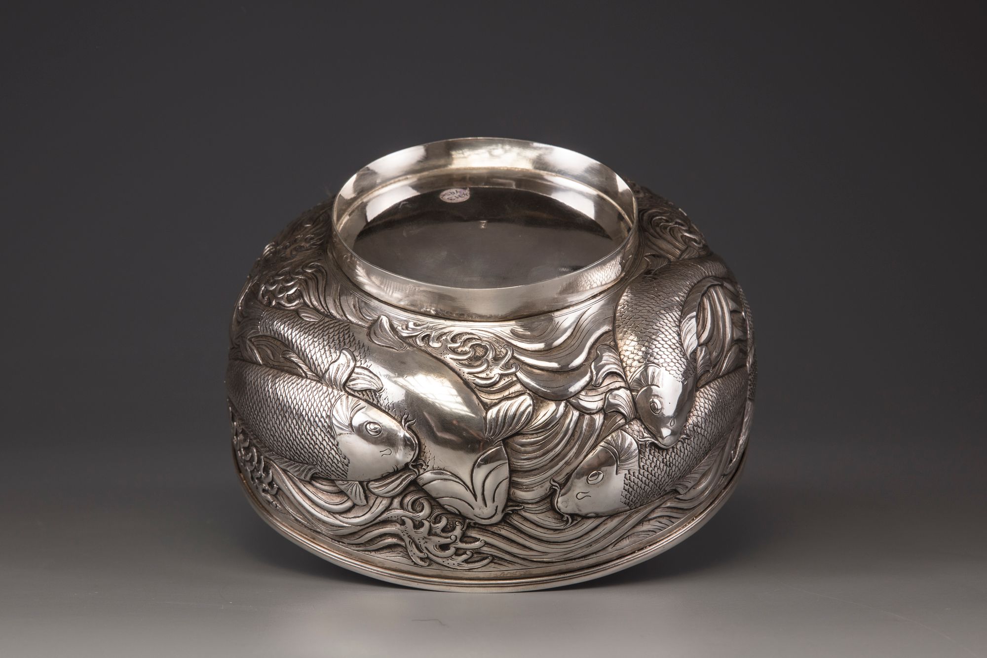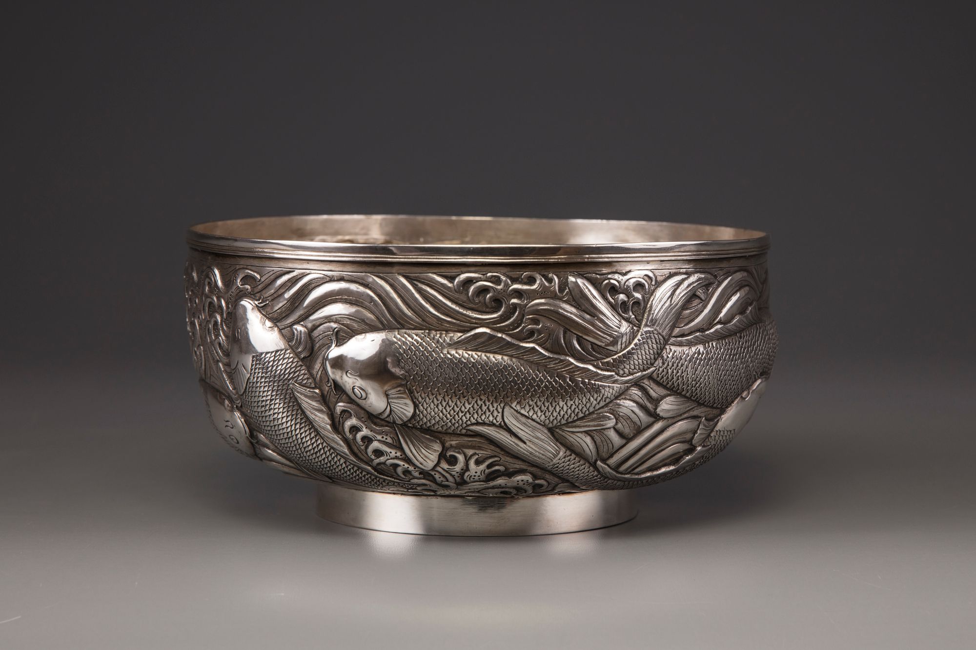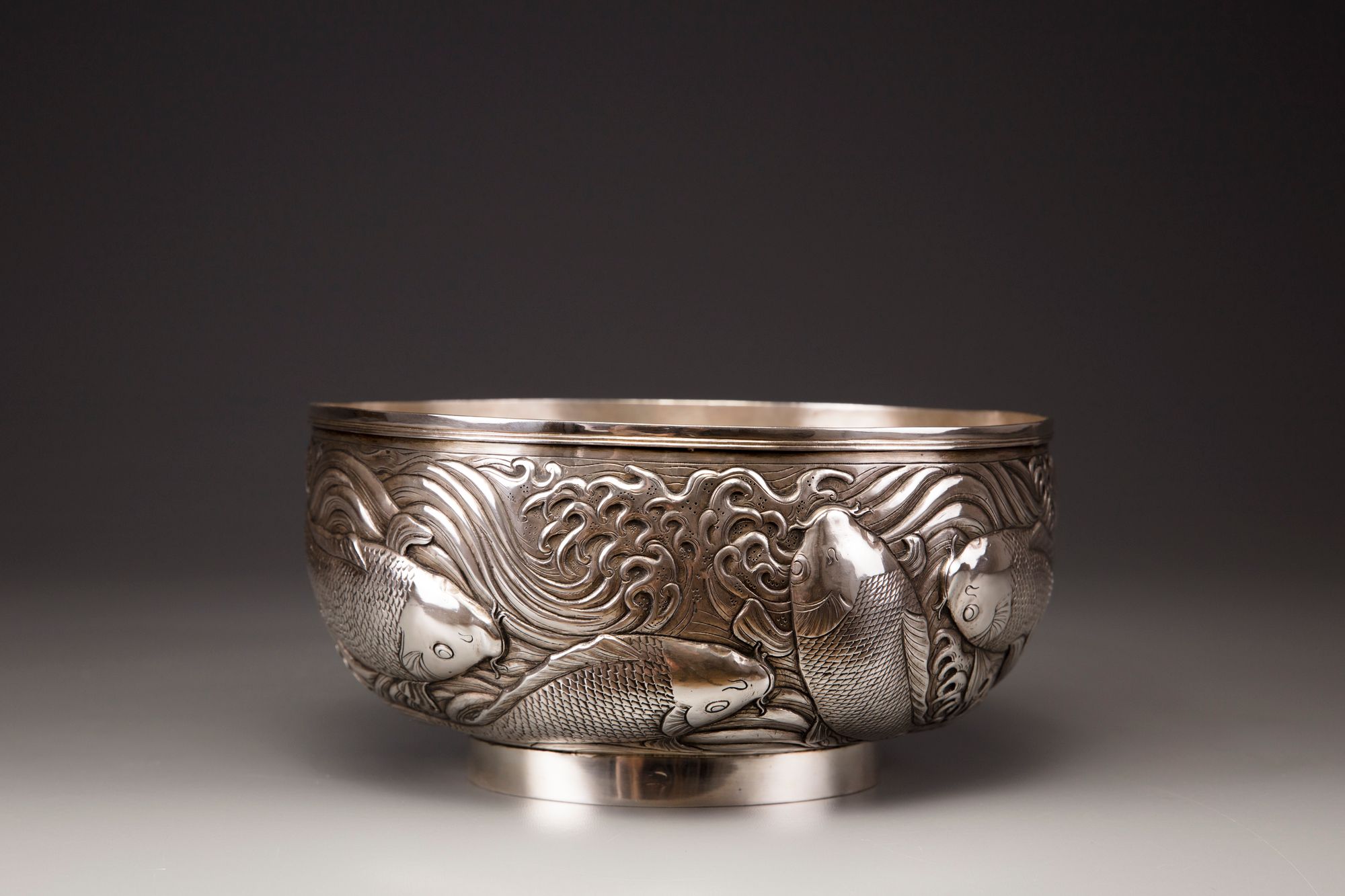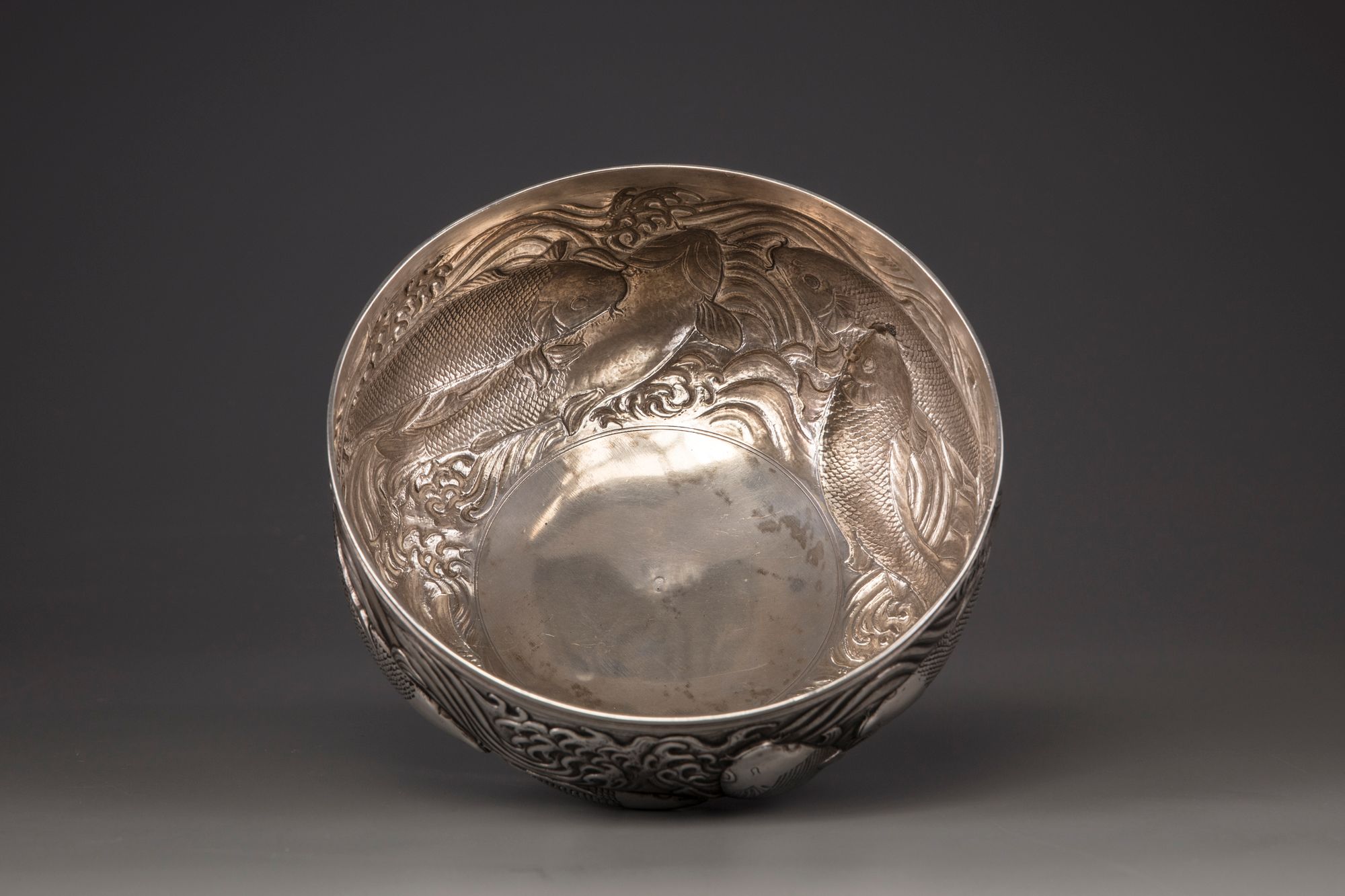 The bowl is finely decorated in repoussé carp swimming amongst foaming waves, with delicate chased details. The underside of the bowl is marked 'jungin', meaning 'pure silver'.