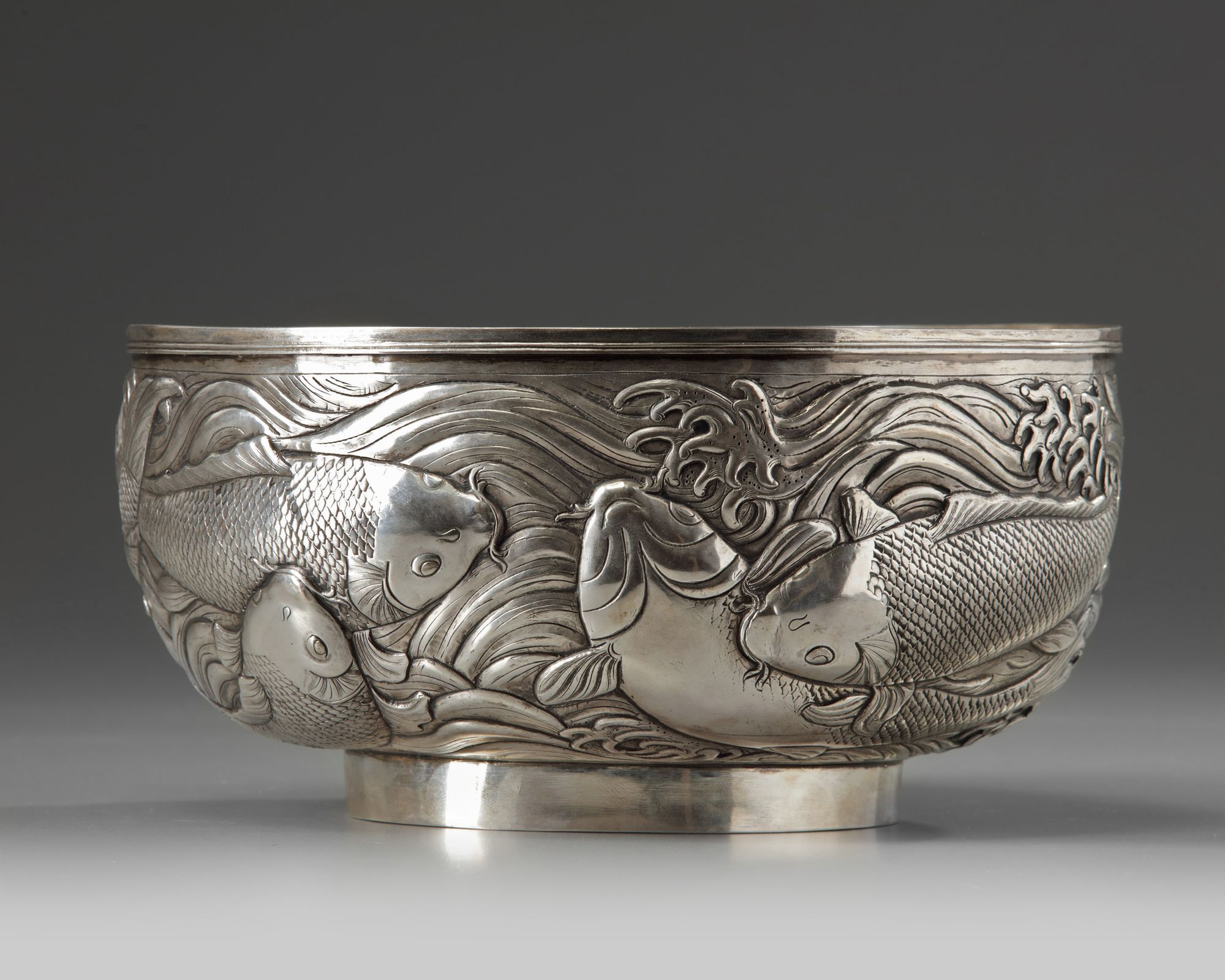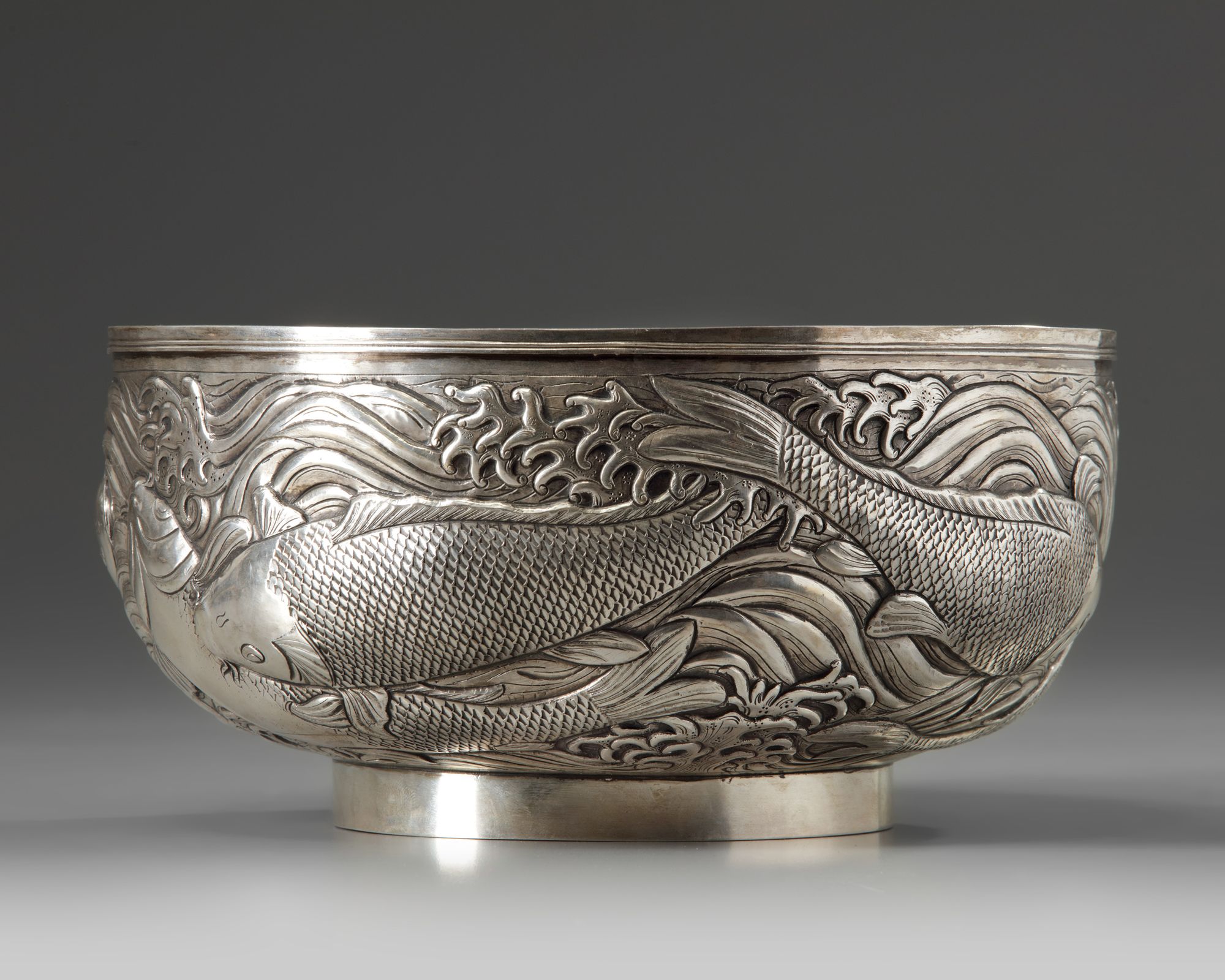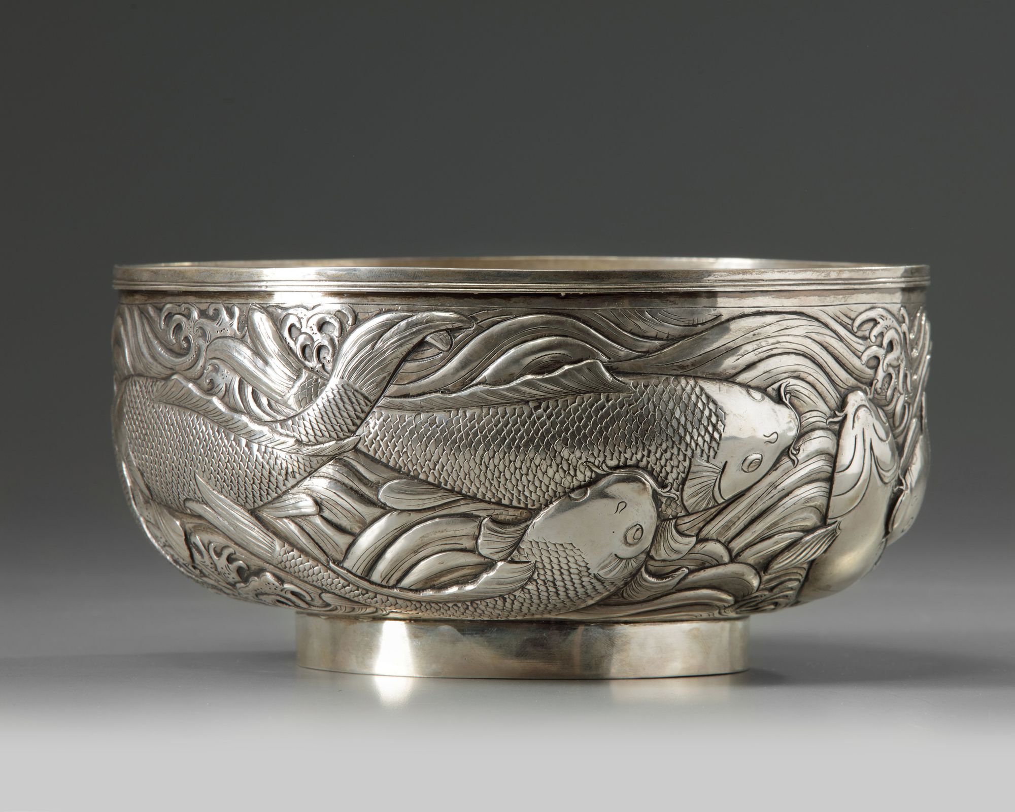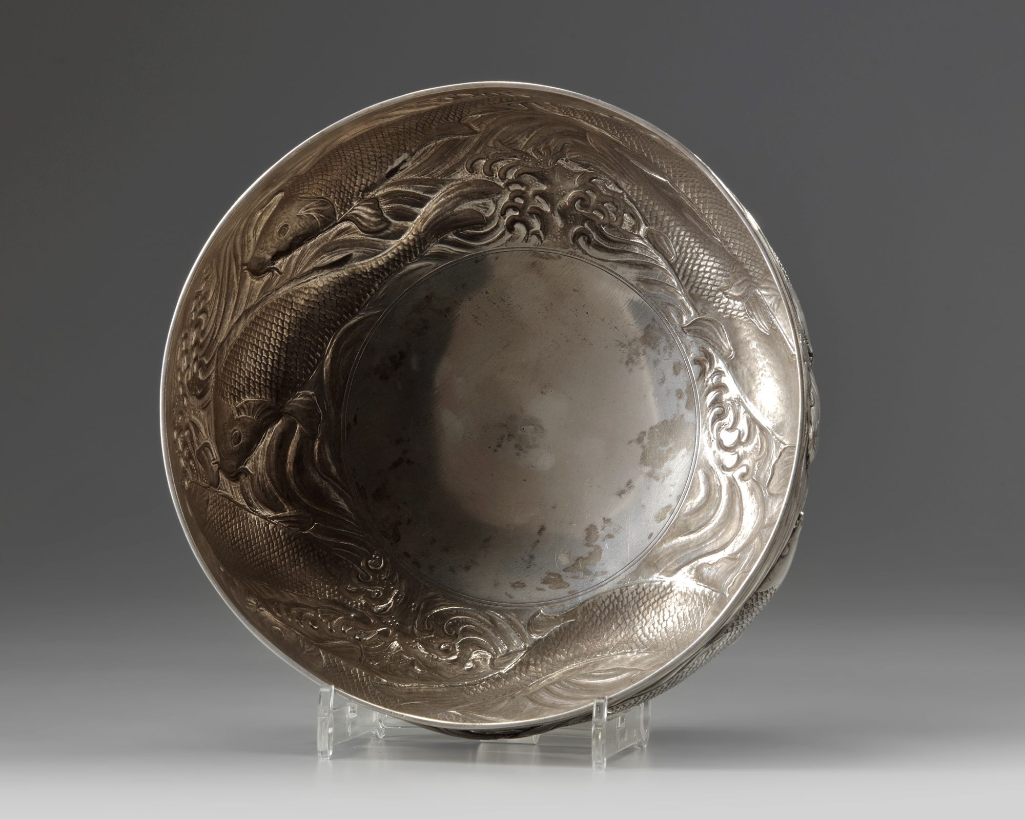 The bowl is finely decorated in repoussé carp swimming amongst foaming waves, with delicate chased details. The underside of the bowl is marked 'jungin', meaning 'pure silver'.