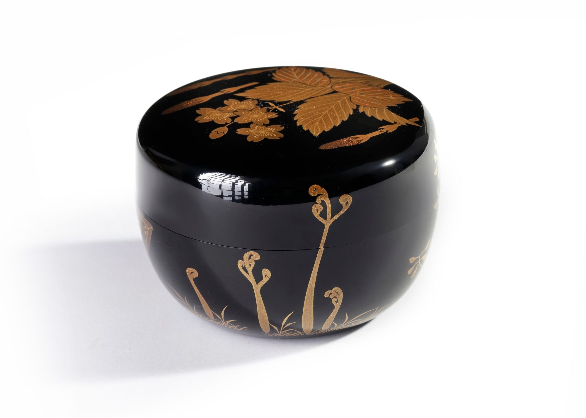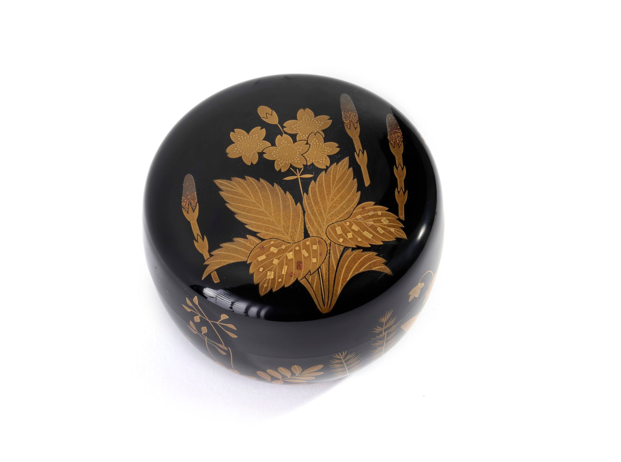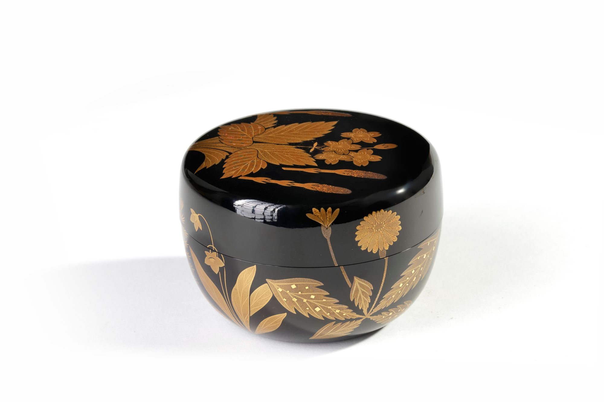 Japanese gold Lacquered wooden Tea Caddy with box, decorated with a maki-e pattern of various kinds of flowers.