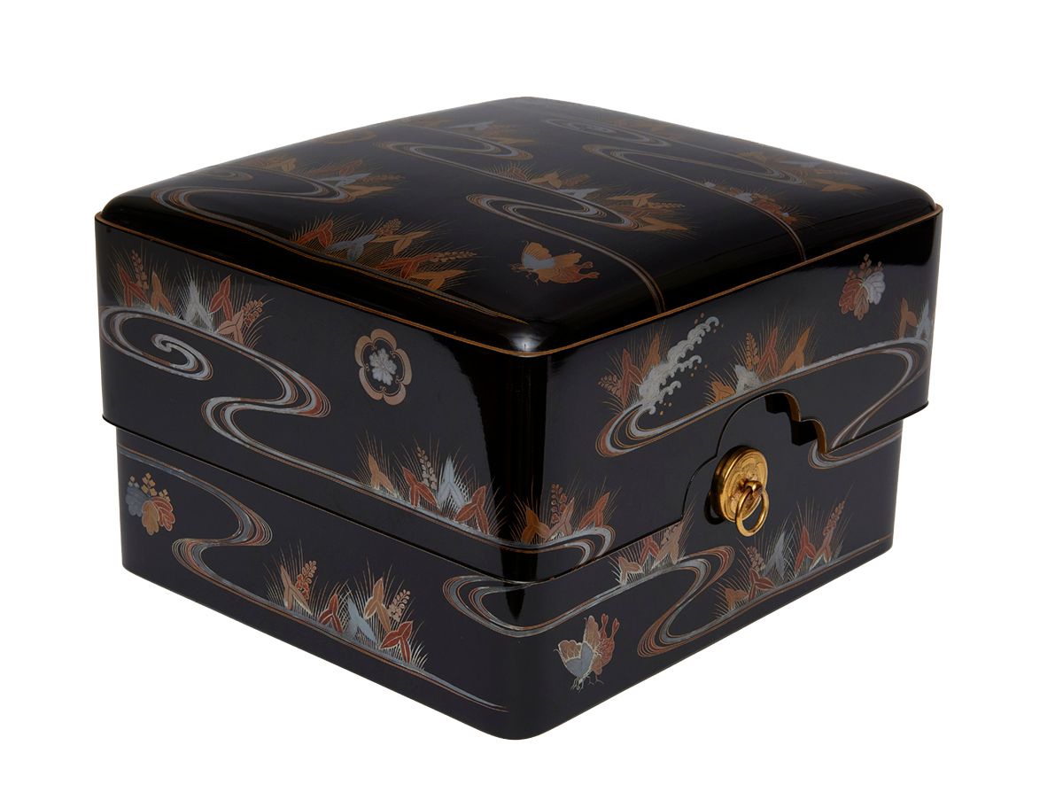 Large black lacquered box with a curved lid and decorated with a design of three-leaved arrowhead (omodaka, Sagittaria trifolia) near flowing water in silver, gold and red-brown maki-e lacquer and a paulownia crest (gosannokiri mon) and a ‘Chinese flower’ crest (goka ni karahana mon). In a box.
